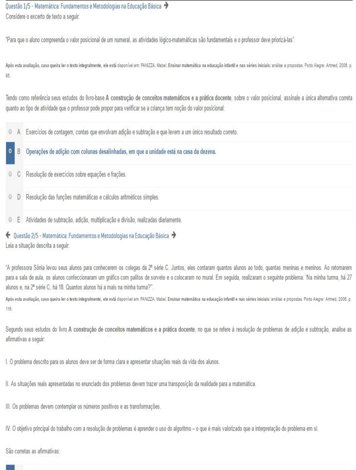 Questão 1/5 - Matemática: Fundamentos e Metodologias na Educação Básica Analise a situação descrita a seguir: Marta apresentou para seus alunos algumas operações como, por exemplo, 15+35+10=60 e seus alunos resolveram, observando o valor posicional e a partir da resolução mental\u201d. Após esta avaliação, caso queira ler o texto integralmente, ele está disponível em: PANIZZA, Mabel. Ensinar matemática na educação infantil e nas séries iniciais: análise e propostas. Porto Alegre: Artmed, 2006.p.103-104. Tendo em vista o livro-base A construção de conceitos matemáticos e a prática docente, assinale a alternativa que menciona qual o objetivo de os alunos resolverem operações de forma horizontal: A Identificar o valor posicional que os algarismos ocupam na operação matemática. Questão 2/5 - Matemática: Fundamentos e Metodologias na Educação Básica Leia a situação proposta no excerto de texto: Paula organizou os alunos em grupos e para cada grupo entregou potes com objetos como: botões, tiras de tecido e círculos de papéis. Eles também receberam operações matemáticas para resolverem utilizando os objetos concretos\u201d. Após esta avaliação, caso queira ler o texto integralmente, ele está disponível em: PANIZZA, Mabel. Ensinar matemática na educação infantil e nas séries iniciais: análise e propostas. Porto Alegre Artmed, 2006. p. 122-123. Segundo sua leitura do livro-base da disciplina A construção de conceitos matemáticos e a prática docente, a atitude de Paula, mencionada no fragmento acima, enfatiza, principalmente, que, no ensino específico da multiplicação: A uma das maneiras de o professor concretizar a aprendizagem da multiplicação é utilizar materiais concretos em sala de aula. Questão 3/5 - Matemática: Fundamentos e Metodologias na Educação Básica Considere o excerto de texto a seguir: \u201cPara que o aluno compreenda o valor posicional de um numeral, as atividades lógico-matemáticas são fundamentais e o professor deve priorizá-las\u201d. Após esta avaliação, caso queira ler o texto integralmente, ele está disponível em: PANIZZA, Mabel. Ensinar matemática na educação infantil e nas séries iniciais: análise e propostas. Porto Alegre: Artmed, 2006. p. 95. Tendo como referência seus estudos do livro-base A construção de conceitos matemáticos e a prática docente, sobre o valor posicional, assinale a única alternativa correta quanto ao tipo de atividade que o professor pode propor para verificar se a criança tem noção do valor posicional: A Exercícios de contagem, contas que envolvam adição e subtração e que levem a um único resultado correto. B Operações de adição com colunas desalinhadas, em que a unidade está na casa da dezena. Questão 4/5 - Matemática: Fundamentos e Metodologias na Educação Básica Leia a situação descrita a seguir: A professora Sônia levou seus alunos para conhecerem os colegas da 2ª série C. Juntos, eles contaram quantos alunos ao todo, quantas meninas e meninos. Ao retornarem para a sala de aula, os alunos confeccionaram um gráfico com palitos de sorvete e o colocaram no mural. Em seguida, realizaram o seguinte problema: \u2018Na minha turma, há 27 alunos e, na 2ª série C, há 18. Quantos alunos há a mais na minha turma? Após esta avaliação, caso queira ler o texto integralmente, ele está disponível em: PANIZZA, Mabel. Ensinar matemática na educação infantil e nas séries iniciais: análise e propostas. Porto Alegre: Artmed, 2006. p. 116. Segundo seus estudos do livro A construção de conceitos matemáticos e a prática docente, no que se refere à resolução de problemas de adição e subtração, analise as afirmativas a seguir: I. O problema descrito para os alunos deve ser de forma clara e apresentar situações reais da vida dos alunos. II. As situações reais apresentadas no enunciado dos problemas devem trazer uma transposição da realidade para a matemática. III. Os problemas devem contemplar os números positivos e as transformações. IV. O objetivo principal do trabalho com a resolução de problemas é aprender o uso do algoritmo \u2013 o que é mais valorizado que a interpretação do problema em si. São corretas as afirmativas: A I, II e III Questão 5/5 - Matemática: Fundamentos e Metodologias na Educação Básica Leia a situação proposta no excerto de texto: A professora Catarina apresentou aos alunos as sentenças a seguir. Cauê observou que um dos algarismos está colocado na posição errada. 4+16. Após esta avaliação, caso queira ler o texto integralmente, ele está disponível em: PANIZZA, Mabel. Ensinar matemática na educação infantil e nas séries iniciais: análise e propostas. Porto Alegre: Artmed, 2006. p. 95. Tendo em consideração o livro-base A construção de conceitos matemáticos e a prática docente, pode-se afirmar que, por meio dessa atividade, a professora Catarina possibilitou aos alunos identificar: A O valor posicional da numeração.
