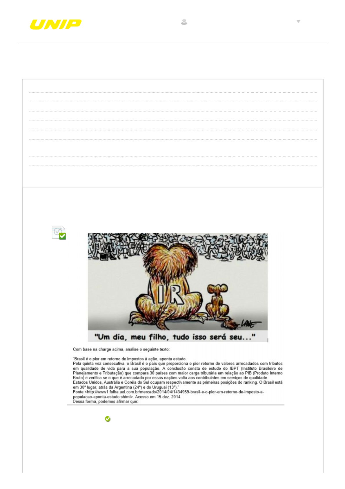 19/11/2018 Revisar envio do teste: QUESTIONÁRIO UNIDADE I – 6596-15... https://ava.ead.unip.br/webapps/assessment/review/review.jsp?attempt_id=_11566714_1&course_id=_28812_1&content_id=_443452_1&return… 1/13 Revisar envio do teste: QUESTIONÁRIO UNIDADE I ESTUDOS DISCIPLINARES IV 6596-15_SEI_CX_0118_R_20182 CONTEÚDO Usuário caroline.moraes3 @unipinterativa.edu.br Curso ESTUDOS DISCIPLINARES IV Teste QUESTIONÁRIO UNIDADE I Iniciado 19/11/18 10:39 Enviado 19/11/18 10:44 Status Completada Resultado da tentativa 5 em 5 pontos Tempo decorrido 5 minutos Resultados exibidos Todas as respostas, Respostas enviadas, Respostas corretas, Comentários, Perguntas respondidas incorretamente Pergunta 1 Resposta Selecionada: e. Respostas: a. Todas as alternativas anteriores estão erradas. A crítica tanto da charge quanto do texto é direcionada ao fato de que os cargos públicos e os privilégios no Brasil ainda são hereditários, resquício de nosso passado colonial. CONTEÚDOS ACADÊMICOS BIBLIOTECAS MURAL DO ALUNO TUTORIAISUNIP EAD 0,5 em 0,5 pontos caroline.moraes3 @unipinterativa.edu.br 1 19/11/2018 Revisar envio do teste: QUESTIONÁRIO UNIDADE I – 6596-15... https://ava.ead.unip.br/webapps/assessment/review/review.jsp?attempt_id=_11566714_1&course_id=_28812_1&content_id=_443452_1&return… 2/13 b. c. d. e. Feedback da resposta: A charge e o texto entram em contradição, uma vez que a charge mostra um cenário otimista de continuidade e a notícia critica o sistema tributário brasileiro. De acordo com os dados da notícia, no Uruguai, o volume de imposto arrecadado é maior do que no Brasil. O sistema tributário brasileiro é simples no cálculo e na cobrança de tributos. Todas as alternativas anteriores estão erradas. Resposta: E Comentário: todas as alternativas anteriores possuem algum dado errado em seu texto. Podemos a�rmar que nenhuma resposta salientou que o ranking se refere ao volume de impostos arrecadados que retorna aos contribuintes em serviços públicos. De acordo com os dados, o retorno no Uruguai é melhor do que no Brasil, mas não há dados para calcular o valor do imposto arrecadado em nenhum dos dois países. Pelas dimensões deles, contudo, pode-se deduzir que o volume brasileiro seja bem superior ao uruguaio. Pergunta 2 Resposta Selecionada: b. Respostas: a. Na charge, sugere-se que o contato com as redes sociais pode, muitas vezes, fazer com que as pessoas percam o contato com o mundo real. 0,5 em 0,5 pontos 19/11/2018 Revisar envio do teste: QUESTIONÁRIO UNIDADE I – 6596-15... https://ava.ead.unip.br/webapps/assessment/review/review.jsp?attempt_id=_11566714_1&course_id=_28812_1&content_id=_443452_1&return… 3/13 b. c. d. e. Feedback da resposta: O objetivo da charge é enaltecer o modo como a internet auxilia na elaboração do conhecimento dos jovens. Na charge, sugere-se que o contato com as redes sociais pode, muitas vezes, fazer com que as pessoas percam o contato com o mundo real. O personagem da charge reconhece, no mundo real, aquilo que aprendeu na realidade virtual, o que indica o papel educativo da internet atualmente. A charge não é clara e não se refere às redes sociais. Nenhuma das alternativas anteriores está correta. Resposta: B Comentário: a situação da charge salienta a alienação do jovem que só vive no mundo digital e que tenta associar, de forma equivocada, os elementos do mundo real ao que ele conhece na rede. Pergunta 3 Resposta Selecionada: b. Respostas: a. b. c. A referência ao mito da caverna de Platão alude ao fato de que a vida virtual, por meio dos modernos aparelhos, é intensa hoje. O personagem da charge a�rma que vivemos na caverna de Platão, porque ele não tem acesso às modernas tecnologias. A referência ao mito da caverna de Platão alude ao fato de que a vida virtual, por meio dos modernos aparelhos, é intensa hoje. 0,5 em 0,5 pontos 19/11/2018 Revisar envio do teste: QUESTIONÁRIO UNIDADE I – 6596-15... https://ava.ead.unip.br/webapps/assessment/review/review.jsp?attempt_id=_11566714_1&course_id=_28812_1&content_id=_443452_1&return… 4/13 d. e. Feedback da resposta: Os quadrinhos enaltecem os modernos aparelhos como forma de ter acesso às informações, uma vez que o personagem pode aprender �loso�a por meio da internet. A expressão “caverna de Platão”, na tirinha, tem sentido positivo e enaltece a sociedade tecnológica contemporânea. Nenhuma das alternativas anteriores está correta. Resposta: B Comentário: o personagem aplica o conceito �losó�co à atualidade, em que a virtualidade é intensa e a realidade é conhecida, muitas vezes, pelas imagens virtuais. Pergunta 4 Após a visualização da charge anterior, leia o texto: “Um dos autorretratos mais famosos do mundo está em Turim, na Itália, e raramente é exibido ao público. É o autorretrato de Leonardo da Vinci, feito há 500 anos. Sua fama vem não apenas do fato de ter sido produzido por Da Vinci, mas também por seus supostos poderes mágicos. Segundo a lenda, o olhar de Da Vinci em seu autorretrato é tão intenso que aquele que o observa recebe uma força extraordinária. Diz-se, inclusive, que foi devido a esse poder místico, e não ao valor cultural ou monetário do desenho, que ele foi levado de Turim para Roma durante a Segunda Guerra Mundial. Isso porque ninguém queria que o quadro caísse nas mãos de Adolph Hitler. Ninguém queria correr o risco de dar a Hitler ainda mais poderes. Essa foi, na época, a única obra 0,5 em 0,5 pontos 19/11/2018 Revisar envio do teste: QUESTIONÁRIO UNIDADE I – 6596-15... https://ava.ead.unip.br/webapps/assessment/review/review.jsp?attempt_id=_11566714_1&course_id=_28812_1&content_id=_443452_1&return… 5/13 Resposta Selecionada: e. Respostas: a. b. c. d. e. Feedback da resposta: retirada de toda a vasta coleção de desenhos e manuscritos da Biblioteca Real de Turim. O atual diretor da biblioteca, Giovanni Saccani, disse que ninguém sabe ao certo onde o quadro esta