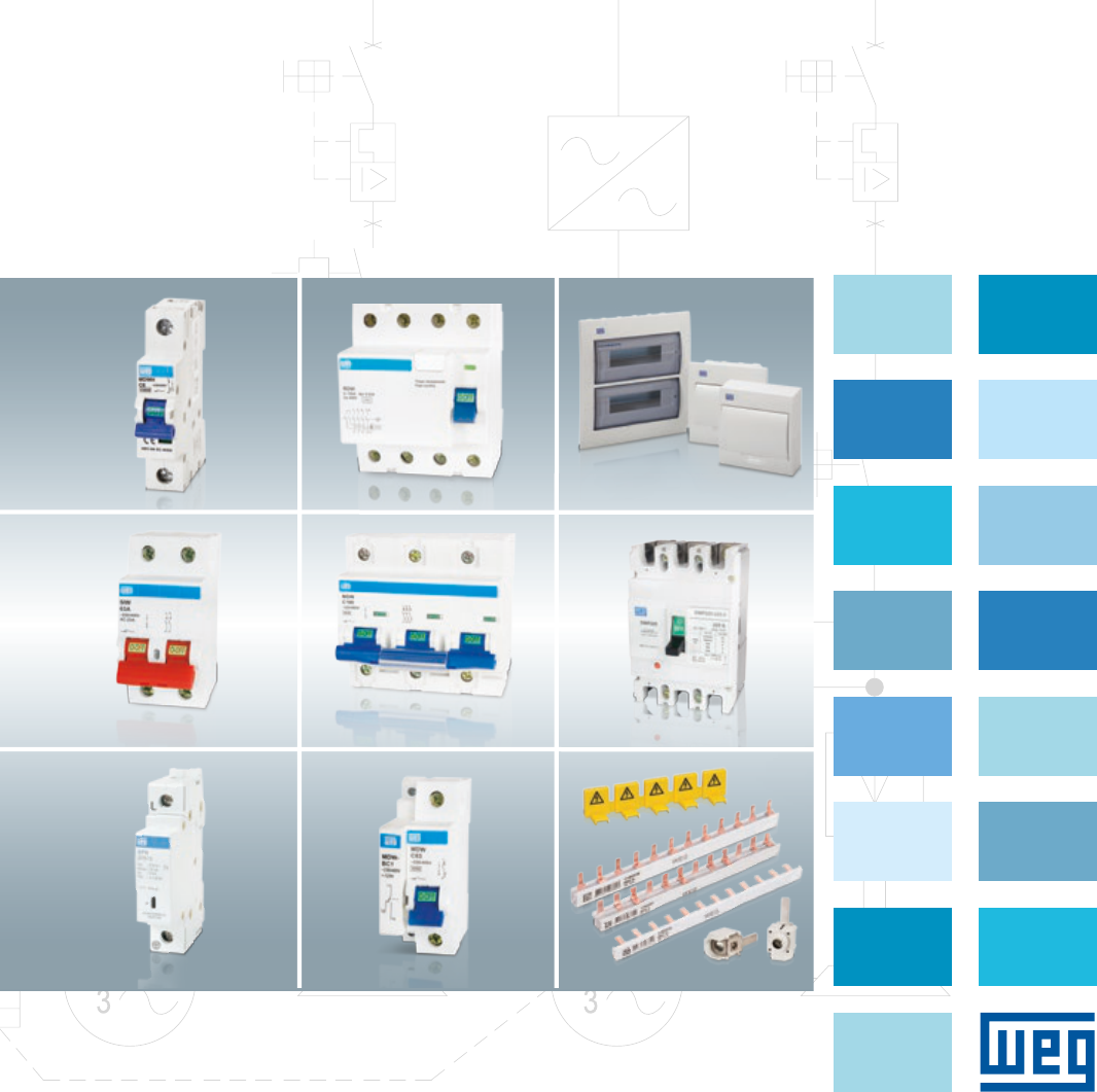 Motores | Automação | Energia | Transmissão & Distribuição | Tintas Automação Minidisjuntores MDW e MDWH Quadros de Distribuição QDW Disjuntores em Caixa Moldada Predial DWP Interruptores Diferenciais Residuais RDW Dispositivos de Proteção Contra Surto SPW www.weg.net Minidisjuntores - Quadros e Acessórios de Distribuição - Interruptores - Dispositivos de Proteção - Disjuntores2 Índice Minidisjuntores - MDW e MDWH....................................................................................................................................................................... 3 Quadros de Distribuição - QDW....................................................................................................................................................................... 8 Acessórios de Distribuição................................................................................................................................................................................. 9 Interruptores Seccionadores - SIW.................................................................................................................................................................. 10 Interruptores Diferenciais Residuais - DRs RDW........................................................................................................................................... 11 DPS - Dispositivos de Proteção Contra Surtos - SPW e SPWC............................................................................................................. 14 Disjuntores em Caixa Moldada - DWP............................................................................................................................................................ 16 Dimensões (mm).................................................................................................................................................................................................. 18 Esquemas de Ligação........................................................................................................................................................................................ 19 www.weg.net Minidisjuntores - Quadros e Acessórios de Distribuição - Interruptores - Dispositivos de Proteção - Disjuntores 3 Referência e Código WEG MDW Minidisjuntores - MDW e MDWH Curvas de Disparo g Curva B O minidisjuntor de curva B tem como característica principal o disparo instantâneo para correntes entre 3 a 5 vezes a corrente nominal. Sendo assim, são aplicados principalmente na proteção de circuitos com características resistivas ou com grandes distâncias de cabos envolvidas. Ex.: lâmpadas incandescentes, chuveiros, aquecedores elétricos, etc. g Curva C O minidisjuntor de curva C tem como característica o disparo instantâneo para correntes entre 5 a 10 vezes a corrente nominal. Sendo assim, são aplicados para a proteção de circuitos com instalação de cargas indutivas. Ex.: lâmpadas fluorescentes, geladeiras, máquinas de lavar, etc. A linha de minidisjuntores MDW e MDWH oferece proteção contra sobrecarga e curto-circuito em condutores elétricos, atendendo as curvas características de disparo B e C, conforme a norma NBR NM 60898 e NBR IEC 60947-2. Desenvolvida para aplicações em circuitos de baixa tensão, de corrente contínua ou alternada de 2 a 125 A e capacidade de interrupção de curto-circuito de até 20 kA (127/220 V CA) conforme norma NBR IEC 60947-2. A linha de minidisjuntores conta com bloco de contatos auxiliares, barramento de distribuição monopolar, bipolar e tripolar, e trava cadeado, conforme exigência da norma NR10, como acessórios. Possui também mecanismo de disparo livre, onde o disparo independe da posição da manopla, e indicação do estado do disjuntor (MDWH). Referência Corrente Curva Código WEG - - - - - - - - MDW-B6 6 A B 10076396 MDW-B10 10 A B 10076404 MDW-B16 16 A B 10076412 MDW-B20 20 A B 10076420 MDW-B25 25 A B 10076428 MDW-B32 32 A B 10076436 MDW-B40 40 A B 10076444 MDW-B50 50 A B 10076452 MDW-B63 63 A B 10076460 MDW-B70 70 A B 11134694 MDW-B80 80 A B 10076468 MDW-B100 100 A B 10075742 MDW-B125 125 A B 11807321 Referência Corrente Curva Código WEG MDW-C2 2 A C 10076381 MDW-C4 4 A C 10076389 MDW-C6 6 A C 10076397 MDW-C10 10 A C 10076405 MDW-C16 16 A C 10076413 MDW-C20 20 A C 10076421 MDW-C25 25 A C 10076429 MDW-C32 32 A C 10076437 MDW-C40 40 A C 10076445 MDW-C50 50 A C 10076453 MDW-C63 63 A C 10076461 MDW-C70 70 A C 11134789 MDW-C80 80 A C 10076469 MDW-C100 100 A C 10075743 MDW-C125 125 A C 11807325 Minidisjuntores Monopolares www.weg.net Minidisjuntores - Quadros e Acessórios de Distribuição - Interruptores - Dispositivos de Proteção - Disjuntores4 www.weg.net Minidisjuntores - MDW e MDWH Minidisjuntores Bipolares Referência Corrente Curva Código WEG - - - - - - - - MDW-B6-2 6 A B 10076398 MDW-B10-2 10 A B 10076406 MDW-B16-2 16 A B 10076414 MDW-B20-2 20 A B 10076422 MDW-B25-2 25 A B 10076430 MDW-B32-2 32 A B 10076438 MDW-B40-2 40 A B 10076446 MDW-B50-2 50 A B 10076454 MDW-B63-2 63 A B 10076462 MDW-B70-2 70 A B 11134696 MDW-B80-2 80 A B 10076470 MDW-B100-2 100 A B 10075744 MDW-B125-2 125 A B 11807322 Referência Corrente Curva Código WEG MDW-C2-2 2 A C 10076383 MDW-C4-2 4 A C 10076391 MDW-C6-2 6 A C 10076399 MDW-C10-2 10 A C 10076407 MDW-C16-2 16 A C 10076415 MDW-C20-2 20 A C 10076423 MDW-C25-2 25 A C 10076431 MDW-C32-2 32 A C 10076439 MDW-C40-2 40 A C 10076447 MDW-C50-2 50 A C 10076455 MDW-C63-2 63 A C 10076463 MDW-C70-2 70 A C 11134790 MDW-C80-2 80 A C 10076471 MDW-C100-2 100 A C 10075745 MDW-C125-2 125 A C 11807327 Minidisjuntores Tripolares Referência Corrente Curva Código WEG - - - - - - - - MDW-B6-3 6 A B 10076400 MDW-B10-3 10 A B 10076408 MDW-B16-3 16 A B 10076416 MDW-B20-3 20 A B 10076424 MDW-B25-3 25 A B 10076432 MDW-B32-3 32 A B 10076440 MDW-B40-3 40 A B 10076448 MDW-B50-3 50 A B 10076456 MDW-B63-3 63 A B 10076464 MDW-B70-3 70 A B 11134697 M