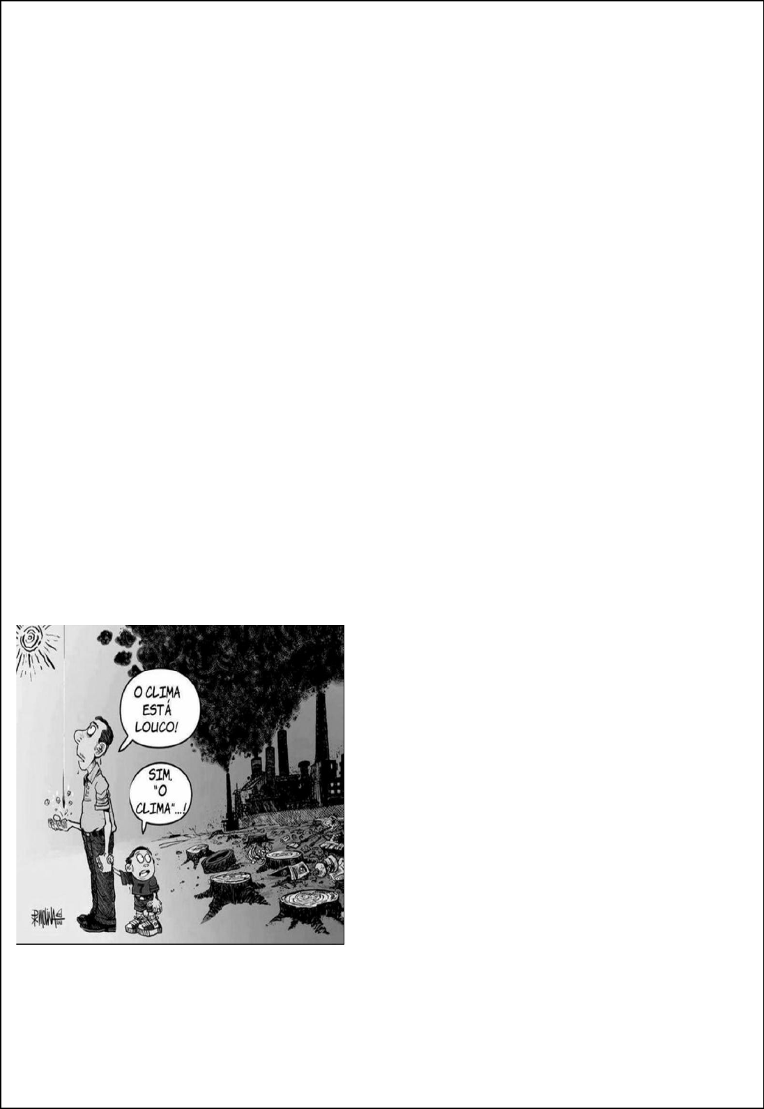 1- Atmosfera é a camada superficial que envolve os planetas. No Planeta Terra ela é composta por diversos compostos. Assinale a afirmativa que NÃO corresponde aos componentes da atmosfera terrestre. A) Oxigênio B) Nitrogênio C) Gás Carbônico D) Vapor d’água E) Flúor 2- Periodicamente o espaço brasileiro é afetado por dois fenômenos climáticos distintos, mas ambos causados pela mudança da temperatura das águas do Pacífico: El Niño e La Niña. Assinale a alternativa que NÃO corresponde ao efeito de um desses fenômenos num clima brasileiro. A) El Niño: aumento das precipitações em regiões de clima subtropical. B) La Niña: passagens rápidas das frentes frias em regiões de clima subtropical. C) El Niño: seca em regiões de clima semiárido. D) La Niña: seca em regiões de clima equatorial. E) Ambos os fenômenos não provocam alterações nas diversas regiões. 3-Leia as afirmativas abaixo. I. A altitude influencia nos fatores pressão e temperatura: quanto maior a altitude, menor a pressão; quanto maior a altitude, menor a temperatura. II. A temperatura influencia nos fatores pressão e umidade relativa: quanto maior a temperatura, menor a pressão; quanto mais quente, maior a capacidade da atmosfera em reter umidade. III. A amplitude térmica é influenciada pela continentalidade e pela nebulosidade: quanto maior a continentalidade, maior a amplitude térmica; quanto menor a nebulosidade, maior a amplitude térmica. Estão corretas as afirmativas: A) Somente a I. B) Somente I e II. C) Somente I e III. D) Somente II e III. E) Todas estão corretas. 4- Ao utilizar‐se da ironia para dialogar com o adulto, a criança insinua que 5- Assinale a alternativa que corresponde à um clima característico das zonas temperadas do Planeta. A) Equatorial B) Tropical C) Subtropical D) Polar E) Mediterrâneo 6- A figura a seguir ilustra o seguinte fenômeno climático: 7- Como a Chuva Ácida se origina? ________________________________________________________________________________________________________________________________________________________________________________________________________________________________________________________________________ 8- Apesar de fenômenos extremamente relacionados, efeito estufa e aquecimento global são duas coisas diferentes. Diferencie os dois. ____________________________________________________________________________________________________________________________________________________________________________________________________________________________________________________________________________________________________________________________________________________________________________________________________________________________________________________________________________________________________________________ _____________________________________________________________________________________________________________________________ --------------------------------------------------------------------------------------------------------------------------------------------------- 1 2 3 4 5 6 A B C D E A) as indústrias têm pouca interferência nas mudanças climáticas já que utilizam energia limpa. B) os loucos são os seres humanos que degradam o meio ambiente e interferem no clima. C) a retirada da vegetação indica um desenvolvimento social, pois mais mercadorias são produzidas. D) os raios solares chegam com mais intensidade ao planeta por conta da diminuição da distância entre o Sol e a Terra. E) são eventos como as erupções vulcânicas e os terremotos os verdadeiros causadores das mudanças climáticas. A) Inversão térmica. B) Chuva ácida. C) Buraco na camada de ozônio. D) Ilhas de calor. E) Aquecimento global ATENÇÃO: Leia cuidadosamente cada questão e responda corretamente. Existe apenas UMA resposta correta para cada questão objetiva. Use caneta esferográfica de tinta azul ou preta. Se for identificado algum problema NA PROVA, informe-o ao Professor. Não é permitido o uso de qualquer tipo de aparelho eletrônico. QUESTÕES RASURADAS SERÃO ANULADAS.
