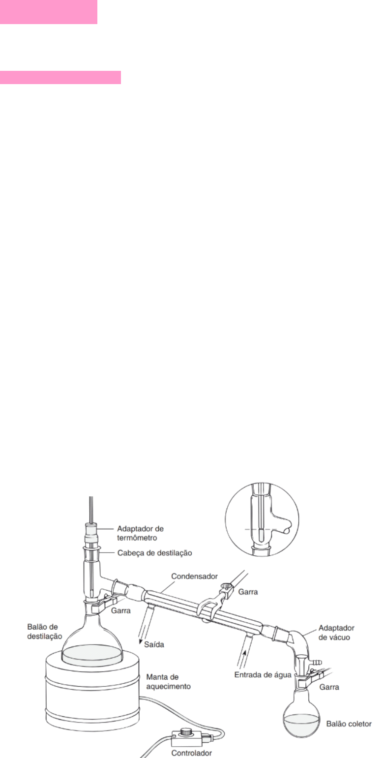 GERAL SOBRE DESTILAÇÃO Destilação é uma técnica muito utilizada para SEPARAR e PURIFICAR um componente líquido de uma mistura - Envolve aquecer uma mistura líquida até seu PONTO DE EBULIÇÃO, onde o líquido é rapidamente convertido em vapor, então os vapores são condensados em um recipiente separado - Quando os componentes que compõem a mistura possuem pressões de vapor (ou pontos de ebulição) suficientemente diferentes, eles podem ser separados por destilação - Vaporização de um líquido○ Condensação do vapor ○ Coleta do produto condensado em outro recipiente○ Consiste basicamente, como toda destilação, em:- Muito útil para separação de uma mistura líquida quando os componentes têm diferentes PONTOS DE EBULIÇÃO ou quando um dos componentes não destilará - Um dos principais métodos de purificação de um líquido- São os mais básicos utilizados: destilação simples, destilação fracionada, destilação a vácuo e destilação a vapor - Típico aparelho de destilação: o líquido a ser destilado é colocado no balão de destilação e aquecido (geralmente pela manta de aquecimento). Então o líquido evapora e é forçado para cima, esse vapor passa pelo termômetro (que registra sua temperatura) e vai para dentro do condensador. Dentro do condensador, o vapor é condensado e vira líquido. O líquido escoa para baixo para o recipiente coletor. - DESTILAÇÃO segunda-feira, 19 de novembro de 2018 22:57 Página 1 de Química Orgânica A temperatura observada durante a destilação de uma SUBSTÂNCIA PURA permanece constante durante toda a destilação - Quando uma MISTURA LÍQUIDA é destilada, contudo, geralmente a temperatura não se mantém constante, mas sim aumenta ao longo da destilação - No caso B da figura, quando a mistura possui dois componentes com pontos de ebulição similares, nunca será possível separar completamente uma mistura por meio de destilação simples, e sim o ideal seria uma destilação fracionada - Quando as diferenças no PONTO DE EBULIÇÃO são NÃO SÃO GRANDES e quando deseja-se obter componentes altamente puros, é preciso realizar a destilação fracionada - Se a temperatura permanece constante, uma substância relativamente pura está sendo destilada ○ Depois que a primeira substância foi totalmente destilada, a temperatura dos vapores começa a aumentar novamente, até que uma segunda temperatura constante é atingida e o segundo componente é destilado. ○ Quando se destila uma mistura de dois componentes com grande diferença de pontos de ebulição, a temperatura permanece constante enquanto o primeiro componente é destilado - PRESSÃO DE VAPOR A pressão de vapor de um líquido aumenta com o aumento da temperatura○ A uma dada temperatura, a pressão de vapor de uma substância líquida em contato com seu próprio líquido é uma quantidade CONSTANTE e independente da quantidade absoluta de líquido e vapor presente no sistema ○ Um líquido em um recipiente onde há vácuo, evaporará até que atinja uma pressão definida, que depende apenas da temperatura - Quando a pressão de vapor se torna igual a pressão total exercida sobre a superfície de um líquido, ele FERVE --> é vaporizado por bolhas formadas no líquido - Quando Pressão de Vapor do líquido = Pressão Externa a que o líquido está sujeito: a temperatura não muda (constante) - A temperatura na qual sua pressão de vapor é igual à pressão externa exercida, Ponto de Ebulição do líquido- Página 2 de Química Orgânica A temperatura na qual sua pressão de vapor é igual à pressão externa exercida, em qualquer ponto da superfície do líquido ○ É necessário especificar a pressão ao registrar um ponto de ebulição○ Vantagens no uso de ponto de ebulição mais baixo, sob pressões reduzidas, na destilação de substâncias que se decompõem por aquecimento no ponto de ebulição à pressão atm ○ Esses cacos liberam pequenas quantidades de ar e promovem a ebulição regular ▪ Devem ser adicionados antes do início da destilação, quando o líquido estiver frio ▪ Para prevenir ou reduzir a ebulição tumultuosa, o método mais empregado é a adição de cacos de porcelana porosa ○ Ebulição irregular, quando ocorre um superaquecimento, diz-se que o líquido se tumultua - O ponto de ebulição de um líquido puro tem um valor constante e definido a uma pressão constante - Impurezas não voláteis: o líquido terá um PE constante e as impurezas irão permanecer quando o líquido tive sido destilado ○ Impurezas voláteis: o PE pode se elevar gradualmente a medida que for ocorrendo a destilação do líquido ou pode permanecer constante em uma etapa particular da destilação ○ O PE de um líquido não puro, dependerá da natureza física das impurezas presentes- Página 3 de Química Orgânica