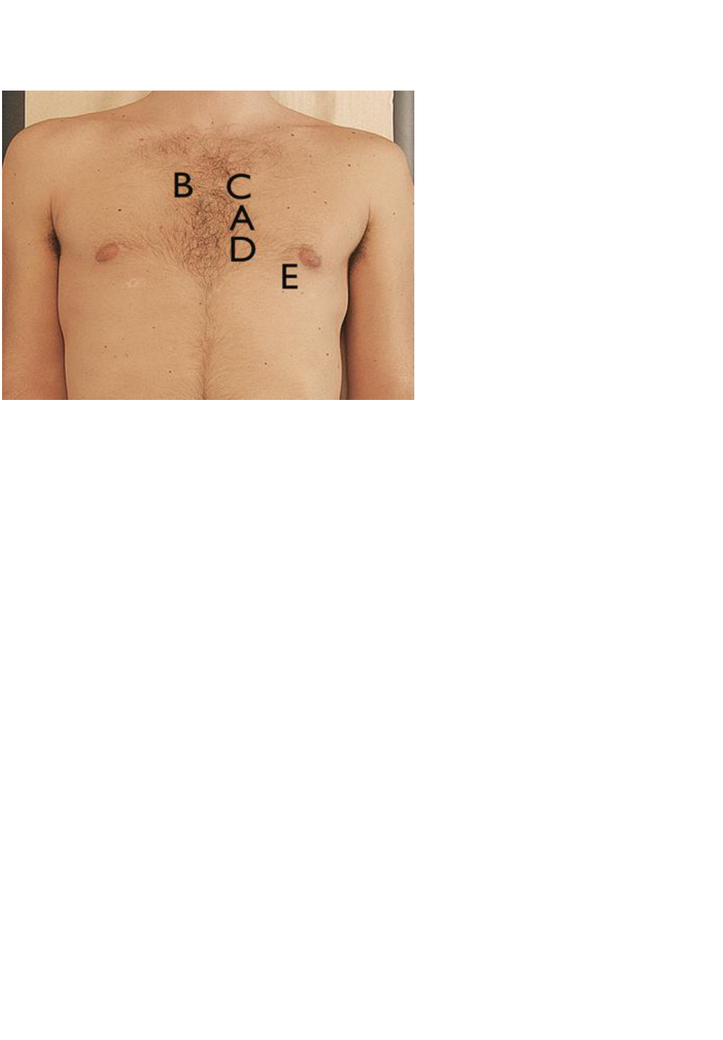 FOCOS OU ÁREAS DE AUSCULTA A audibilidade dos diversos ruídos cardíacos varia em todo o precórdio. Normalmente a ausculta ocorre nos seguintes focos [13]: Figura 13 A: 3º espaço intercostal paraesternal esquerdo (Foco de Erb): 1ª e 2ª bulhas são escutadas com clareza quase igual B: 2º espaço intercostal paraesternal direito (Foco aórtico): Componentes da valva aórtica (A2) da 2ª bulha é mais evidente C: 2º espaço intercostal paraesternal esquerdo (Foco pulmonar): Componente da valva pulmonar (P2) da 2ª bulha é mais evidente D: 4º/5º espaço intercostal paraesternal esquerdo (Foco tricúspide): Componente da valva tricúspide (T1) da 1ª bulha é mais evidente E: 5º espaço intercostal paraesternal no ápice cardíaco (Foco Mitral): Componentes da valva mitral (M1) da 1ª bulha é mais evidente Clique de abertura É um som de um clique de alta frequência que ocorre durante a sístole é refere-se ao prolapso da valva mitral ou tricúspide. Estalido de abertura É um som de abertura de alta frequência que ocorre na diástole no caso de estenose da valva mitral ou tricúspide. Componentes das bulhas Componentes da 1ª bulha A 1ª bulha possuí dois componentes: o fechamento da valva mitral e da valva tricúspide. Em pessoas saudáveis há normalmente uma diferença 0,02-0,03 segundos entre esses dois componentes Condições fisiológicas Em 85% das pessoas a separação dos dois componentes da primeira bulha podem ser observados em condições fisiológicas normais. Principalmente no 4º/5º espaço intercostal paraesternal esquerdo (Foco tricúspide). Condições patológicas Em condições patológicas a separação dos dois componentes da 1ª bulha podem se tornar mais evidentes (por exemplo, quando acontece a estimulação atrasada do ventrículo direito, como consequência de distúrbios da condução ou, no caso de uma insuficiência cardíaca direita). No caso do bloqueio do ramo esquerdo acontece o fechamento tardio da valva mitral que causa uma reversão da ausculta da bulha, a valva tricúspide fecha antes da valva mitral. Componentes da 2ª bulha Os componentes da segunda bulha (fechamento da válvula aórtica e da válvula pulmonar) podem ser percebidos em condições fisiológicas. O melhor local para auscultar é no 2º espaço intercostal paraesternal esquerdo (Foco pulmonar). Condições fisiológicas Durante a inspiração o ventrículo direito pode encher mais. O período de ejeção da sístole dura mais tempo e como resultado a válvula pulmonar fecha mais tarde. Nesse caso, a separação dos dois componentes da bulha se tornam mais evidentes e, portanto, mais audíveis. Isso acontece principalmente com jovens. Condições patológicas Em condições patológicas o aumento da separação dos componentes da 2ª bulha deve-se ao atraso ou aumento da fração de ejeção do ventrículo direito (por exemplo, no caso de hipertensão pulmonar ou bloqueio de ramo direito). O grupamento da 2ª bulha ocorre quando a fração de ejeção do ventrículo esquerdo está atrasada ou prolongada (por exemplo, no caso de insuficiência cardíaca congestiva esquerda ou bloqueio do ramo esquerdo). Intensidade Sonora das bulhas Normalmente no foco de Erb a intensidade da 1ª e 2ª bulhas cardíacas serão parecidas. Esta intensidade depende da distância entre as valvas e o estetoscópio. Em crianças e pessoas muito magras estes sons podem ser muito altos, já em pessoas com obesidade, enfisema ou derrame pericárdico a intensidade do som é mais baixa. Além disso, anormalidades em uma das valvas ou na posição das valvas pode causar uma mudança na intensidade de B1 ou B2. Ritmo Em condições fisiológicas normais o ritmo cardíaco normal gerado pelo nó sinusal tem uma frequência de 60 à 100 batimentos cardíacos por minuto (bpm). Uma frequência inferior à 60 bpm é denominada bradicardia e acima de 100 bpm é referido como taquicardia. Uma alteração fisiológica do ritmo cardíaco pode ser observada em crianças e adultos jovens e é conhecida como arritmia sinusal respiratória. Durante a inspiração a pressão do tórax diminui e como resultado mais sangue entra no coração. O nó sinusal acaba se alongando e como resultado leva a um aumento da frequência cardíaca. Em condições patológicas podem aparecer arritmias cardíacas como, por exemplo, a fibrilação atrial que é um ritmo cardíaco irregular. Neste caso, o volume ejetado pelo coração é tão reduzido que a onda de pulso fica tão pequena que não pode ser sentida na artéria radial existindo uma diferença entre a frequência de batimentos cardíacos e a pulsação na artéria radial. Isto é chamado de déficit de pulso.