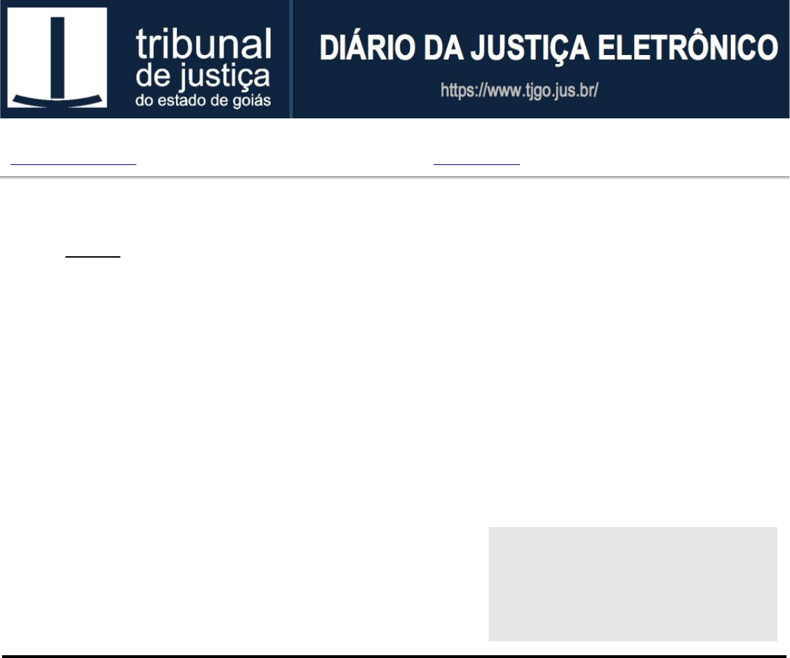 ANO III – EDIÇÃO nº 660 – SEÇÃO II D ISPONIBILIZAÇÃO : segunda-feira, 13 de setembro de 2010 PUBLICAÇÃO: terça-feira, 14 de setembro de 2010 Senhores(as) Usuários(as), A Seção II do Diário da Justiça Eletrônico compreende a publicação de atos judiciais e administrativos oriundos da Comarca de Goiânia, 1º grau de jurisdição. Este documento está assinado digitalmente, conforme MP 2.002-2 de 24/08/2001, que institui a Infra- estrutura de Chaves Públicas Brasileira (ICP-Brasil), e Lei 11.419/2006 (Lei de Informatização do Processo Judicial). A publicação eletrônica substitui qualquer outro meio de publicação oficial, para quaisquer efeitos legais, à exceção dos casos que, por lei, exigem intimação ou vista pessoal. Considera-se como data da publicação o primeiro dia útil seguinte ao da disponibilização da informação no Diário da Justiça Eletrônico. Os prazos processuais terão início no primeiro dia útil que seguir ao considerado como data da publicação. Utilize os marcadores/bookmarks que aparecem do lado esquerdo para navegar neste documento. ANO III - EDIÇÃO 660 - SEÇÃO II DISPONIBILIZAÇÃO: segunda-feira, 13/09/2010 PUBLICAÇÃO: terça-feira, 14/09/2010 DOCUMENTO ASSINADO DIGITALMENTE Dj Eletrônico - Acesse https:\\www.tjgo.jus.br 1 de 727 ================================================================================ TRIBUNAL DE JUSTICA RELAÇÃO DOS EXTRATOS DO DIA: 09/09/2010 NR. NOTAS : 12 COMARCA DE GOIANIA ESCRIVANIA : 1A VARA CIVEL ESCRIVÃO(Ã) : PAULO HENRIQUE DOS SANTOS QUEIROZ JUIZ DE DIREITO : LUSVALDO DE PAULA E SILVA ================================================================================ NR. PROTOCOLO : 395055-08.2009.8.09.0051 ( 200903950558 ) AUTOS NR. : 2525 NATUREZA : CONSIGNATORIA CONSIGNANTE : ELAINE ALVES DA COSTA CONSIGNADO : BANCO BV FINANCEIRA CREDITO FINANCIAMENTO E INVE ADV CONSGTE : 28758 GO - PEDRO HENRIQUE TEIXEIRA JALES DESPACHO : "CERTIFICO E FOU FÉ QUE ATÉ A PRESENTE DATA A PARTE NADA MANIFEST OU NOS AUTOS, TENDO TRANSCORRIDO O PRAZO. ASSIM, INTIMO A PARTE A UTORA PARA EFETUAR OS DEPÓSITOS NO PRAZO DE 48 (QUARENTA E OITO) HORAS. GOIANIA, 14 DE JUNHO DE 2010." NR. PROTOCOLO : 393879-96.2006.8.09.0051 ( 200603938790 ) AUTOS NR. : 1643 NATUREZA : NOTIFICACAO REQUERENTE : LINO E SILVA EMPREENDIMENTOS IMOBILIARIOS LTDA REQUERIDO : MARCELINO VICENTE MARQUES ADV REQTE : 11351 GO - ALISON ARIEL LINS DE ALENCAR 29735 GO - CLAUDIA CRISTINA CHAVES DESPACHO : CERTIDÃO - CERTIFICO E DOU FÉ QUE INTIMO A PARTE INTERESSADA PARA MANIFESTAR, EM 05 (CINCO) DIAS, ACERCA DO MANDADO DEVOLVIDO SEM CUMPRIMENTO, CONFORME DETERMINA O ART. 20 DA INSTRUÇÃO DE SERVIÇO 01/2008. GOIANIA, 09/09/10. ESCRIVANIA DA 1A VARA CIVEL. NR. PROTOCOLO : 237161-03.2008.8.09.0051 ( 200802371617 ) AUTOS NR. : 1067 NATUREZA : CONSIGNATORIA CONSIGNANTE : PAULO GROSSI CONSIGNADO : BV FINANCEIRA S/A - CFI ADV CONSGTE : 24318 GO - EMANUEL MEDEIROS ALCANTARA FILHO 28758 GO - PEDRO HENRIQUE TEIXEIRA JALES DESPACHO : "CERTIFICO E DOU FÉ QUE INTIMO A PARTE INTERESSADA PARA NO PRAZO DE 48 HORAS, MANIFESTAR SOBRE DECISÃO DE FLS. 53/57, AFIM DE DAR ANDAMENTO AO FEITO. EM, 09/09/2010." NR. PROTOCOLO : 303021-77.2010.8.09.0051 AUTOS NR. : 2214 NATUREZA : CONSIGNATORIA CONSIGNANTE : SILVANO ROBERTO DA SILVA CONSIGNADO : BANCO FIAT S/A ADV CONSGTE : 27525 GO - LORAINY RODRIGUES ALVES DE LACERDA DESPACHO : "DE OFICIO, ALTERO O VALOR DA CAUSA PARA R$ 12.713,38 QUE CORRESP ONDE AO BENEFÍCIO ECONOMIO PERSEGUIDO PELO AUTOR (PELO CONTRATO D EVERIA PAGAR R$ 43.213,20 - 60 PRESTAÇÕES DE R$ 720,22 -, ENQUANT O JULGA ELE SER DEVIDO APENAS R$ 18.256,08 - 17 PESTAÇÕES PAGA DE R$ 720,22 + 43 DE R$ 424,56 QUE PRETENDE CONSIGNAR. (...) ASSIM, FIXO O PRAZO DE 10 (DEZ) DIAS PARA RECOLHIMENTO DAS CUSTAS COMPLEMENTARES, SOB PENA DE INDEFERIMENTO DA PETIÇÃO INICI ANO III - EDIÇÃO 660 - SEÇÃO II DISPONIBILIZAÇÃO: segunda-feira, 13/09/2010 PUBLICAÇÃO: terça-feira, 14/09/2010 DOCUMENTO ASSINADO DIGITALMENTE Dj Eletrônico - Acesse https:\\www.tjgo.jus.br 2 de 727 AL. FICA O AUTOR DESDE JÁ ALERTADO QUE ESTE JUIZO NÃO ATENDERÁ PE DIDO DE PRORROGAÇÃO DESSE PRAZO, SEJA QUAL FOR O MOTIVO. INT. GOI ANIA, 20 DE 08 DE 2010. LUSVALDO DE PAULA E SILVA. 2º JUIZ DE DIR EITO DA 1ª VARA CÍVEL." NR. PROTOCOLO : 228333-47.2010.8.09.0051 AUTOS NR. : 1654 NATUREZA : ACAO MONITORIA REQUERENTE : STA DISTRIBUIDORA DE ALIMENTO LTDA REQUERIDO : CARREIRO E SOUZA PANIFICADORA E LANCHONETE ADV REQTE : 19985 GO - ADRIANA TEIXEIRA DESPACHO : "CERTIFICO E DOU FÉ QUE INTIMO A PARTE PARA PROVIDENCIAR COPIA DA S FLS 85/86, A FIM DE INSTRUIR O MANDADO. EM 09/09/2010."NR. PROTOCOLO : 214704-06.2010.8.09.0051 AUTOS NR. : 1547 NATUREZA : RESCISAO CONTRATUAL REQUERENTE : CELG DISTRIBUICAO S.A. CELG D REQUERIDO : CLUBE JAO ADV REQTE : 18641 GO - SAVIO LANES DE SILVA BARROS 17468 GO - MARCO ANTONIO BERNARDES DE OLIVEIRA 15001 GO - CICERO GOMES LAGE ADV REQDO : 22135 GO - PAULO HENRIQUE SILVA PINHEIRO 25605 GO - ANDRE ALVES FERREIRA 29489 GO - MARCUS GYOVANE MOREIRA COELHO DESPACHO : CERTIFICO E DOU FE QUE,INTIMO AS PARTES PARA DIZEREM, EM 05 (CINC O) DIAS, QUANTO AO INTERESSE NO JULGAMENTO ANTECIPADO DA LIDE OU NA PRODUCAO DE OUTRAS PROVAS (ESPECIFICANDO E JUSTIFICANDO A NECE SSIDADE DELAS), CONFORME DETERMINA O ARTIGO 13, DA ORDEM DE SERVI CO 01/2008. GOIANIA. 09/09/2010. ESCRIVANIA. NR. PROTOCOLO : 522922-52.2007.8.09.0051 ( 200705229224 ) AUTOS NR. : 1 NATUREZA : RESCISAO CONTRATUAL REQUERENTE : ALFA INCORPORADORA EMPREENDIMENTOS E CONSULTORIA REQUERIDO : DIVINO FERREIRA DE SANTANA ADV REQTE : 22674 GO - ALLEN ANDERSON VIANA DESPACHO : INTIME-SE A PARTE AUTORA PARA, NO PRAZO DE 10 DIAS, MANIFESTAR SO BRE A CONTESTAÇÃO. GOIÂNIA, 9 DE SETEMBRO DE 2010 -------------------------------------------------------------------------------- JUIZ DE DIREITO : MARCELO LOPES DE JESUS NR. PROTOCOLO : 247292-66.2010.8.09.0051 AUTOS NR. : 2011 NATUREZA : ACIDENTARIA RQTE : SEBASTIAO JU