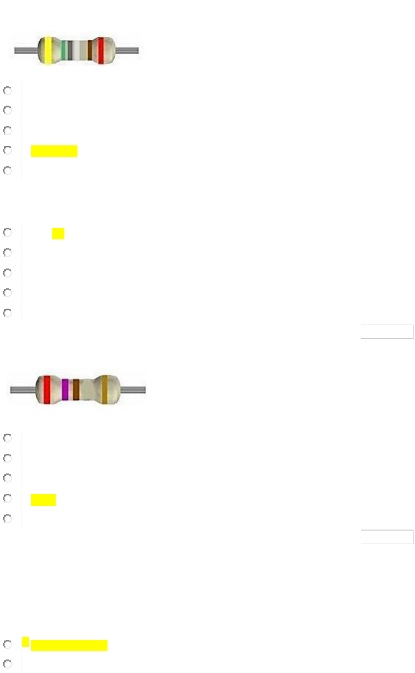 Pergunta 1 No resistor de 6 faixas abaixo, temos que valor de coeficiente de temperatura? a. Resistência = 4,98 Ω e Coeficiente de Temperatura = 10 PPM/°C b. Resistência = 4,32 Ω e Coeficiente de Temperatura = 50 PPM/°C c. Resistência = 3,98 Ω e Coeficiente de Temperatura = 15 PPM/°C d. Resistência = 4,58 Ω e Coeficiente de Temperatura = 50 PPM/°C e. Resistência = 5,00 Ω e Coeficiente de Temperatura = 25 PPM/°C Pergunta 2 (errada) Possuindo um circuito com três resistências de 150Ω, de que forma essas resistências devem ser dispostas para que a resistência equivalente seja 225Ω? Assinale a alternativa correta: a. Dois em série, ligados em paralelo com o terceiro. b. Dois em paralelo, ligados em série com o terceiro. c. Não é possível chegar a esse valor de resistência equivalente com esses resistores. d. Os três resistores em paralelo. e. Os três resistores em série. 0,2 pontos Pergunta 3 Identifique o valor da resistência do resistor de 4 faixas da imagem a seguir: Assinale a alternativa correta: a. 210 Ω b. 260 Ω c. 290 Ω d. 270 Ω e. 220 Ω 0,2 pontos Pergunta 4 Avalie as afirmativas a seguir e as analise quanto à veracidade (V – verdadeiro ou F – falso): I. Os componentes de um circuito em série compartilham a mesma corrente. II. A resistência total em um circuito em série é igual à soma das resistências individuais. III. A tensão total em um circuito em paralelo é igual à soma das quedas individuais de tensão. As assertivas são respectivamente: a. I = V; II = V; III = F. b. I = F; II = F; III = V. c. I = V; II = F; III = V. d. I = F; II = V; III = F. e. I = V; II = V; III = V. Um circuito em série que possui resistores R1 = 4Ω, R2 = 8Ω e R3 = 10Ω, possui uma resistência equivalente de: a. Req = 15Ω b. Req = 22Ω c. Req = 20Ω d. Req = 30Ω e. Req = 27Ω Pergunta 1 Identifique o conceito incorreto sobre as aplicações dos indutores: a. São usados extensivamente em circuitos analógicos e processamento de sinais. b. Indutores acoplados formam um capacitor. c. Carregado para uma fração específica da frequência de troca do regulador e descarregado pelo restante do ciclo. d. Um filtro eletrônico pode usar indutores em conjunto com capacitores. e. Usado como saída de uma fonte chaveada de alimentação. 0,2 pontos Pergunta 2 Identifique o conceito incorreto sobre magnetismo e eletromagnetismo: a. Os polos magnéticos – norte e sul – estão sempre presentes no mesmo corpo. b. Os fenômenos elétricos apresentem natureza efêmera, os magnéticos são geralmente duradouros. c. A força magnética mostra-se menos intensa do que a elétrica. d. Os polos elétricos – positivo e negativo – podem ser separados. e. O magnetismo pode orientar os corpos em direções definidas. 0,2 pontos Pergunta 3 Identifique a afirmativa correta: a. A capacitância é maior quando há uma separação menor entre os condutores e quando os condutores têm uma área de superfície maior. b. A capacitância é maior quando há uma separação maior entre os condutores e quando os condutores têm uma área de superfície maior. c. A capacitância é maior quando há uma separação menor entre os condutores e quando os condutores têm uma área de superfície menor. d. A capacitância é maior quando há uma separação maior entre os condutores e quando os condutores têm uma área de superfície maior. e. A capacitância é maior quando há uma separação menor entre os condutores e quando os condutores têm uma área de superfície menor. 0,2 pontos Pergunta 4 O capacitor ideal é caracterizado por: a. Proporção entre a diferença de potencial Q em cada um dos condutores e a carga eléctrica V entre eles. b. Proporção entre a carga eléctrica Q em cada um dos condutores e a diferença de corrente V entre eles. c. Diferença entre a carga eléctrica Q em cada um dos condutores e a diferença de potencial V entre eles. d. Proporção entre a carga eléctrica Q em cada um dos condutores e a diferença de potencial V entre eles. e. Proporção entre a carga eléctrica Q em cada um dos indutores e a diferença de potencial V entre eles. PERGUNTA 1 Calcule o circuito equivalente de Thévenin (para ambos os lados) relativamente aos pontos A e B no circuito dado. No circuito equivalente, determine a corrente que flui entre os pontos A e B: a. i = -2mA. b. i = -1mA. c. i = -1,5mA. d. i = 2mA. e. i = 1mA. 0,2 pontos PERGUNTA 2 Analise as assertivas a seguir quanto à sua veracidade (V para VERDADEIRA e F para FALSA). I. As resistências de Thévenin e Norton são opostas. II. A tensão de Thévenin será igual à corrente de Norton multiplicada pela resistência de Norton. III. A corrente de Norton é igual à tensão de Thévenin dividida pela resistência de Thévenin. As assertivas I, II e III são RESPECTIVAMENTE: a. F; V; V. b. F; V; F. c. V; F; F. d. V; F; V. e. F; F; V. 0,2 pontos PERGUNTA 3 A respeito da análise de circuitos usando as leis de Kirchhoff, considere as seguintes afirmativas: I. A soma algébrica das tensões é igual a zero. II. Apenas os sentidos reais de correntes devem ser usados. III. A soma algébrica das quedas de tensão é igual à soma algébrica das elevações de tensão. IV. Apenas os sentidos convencionais de correntes devem ser usados. V. A soma algébrica das correntes em um nó é igual a zero. Assinale a alternativa CORRETA. a. Apenas as afirmativas III e V estão corretas. b. Apenas a afirmativa III está correta. c. Apenas a afirmativa II está correta. d. Apenas as afirmativas II e V estão corretas. e. Apenas as afirmativas I, III e V estão corretas. 0,2 pontos PERGUNTA 4 Sobre o teorema de Thévenin, qual a CORRETA sequência dos passos para a resolução de um exercício? I. Construir um novo circuito identificado como circuito equivalente de Thévenin, somente com a fonte de tensão e o resistor de Théve nin que voltam a estar ligados entre os nós.ok 3 II. Identificar a fonte de tensão de Thévenin,