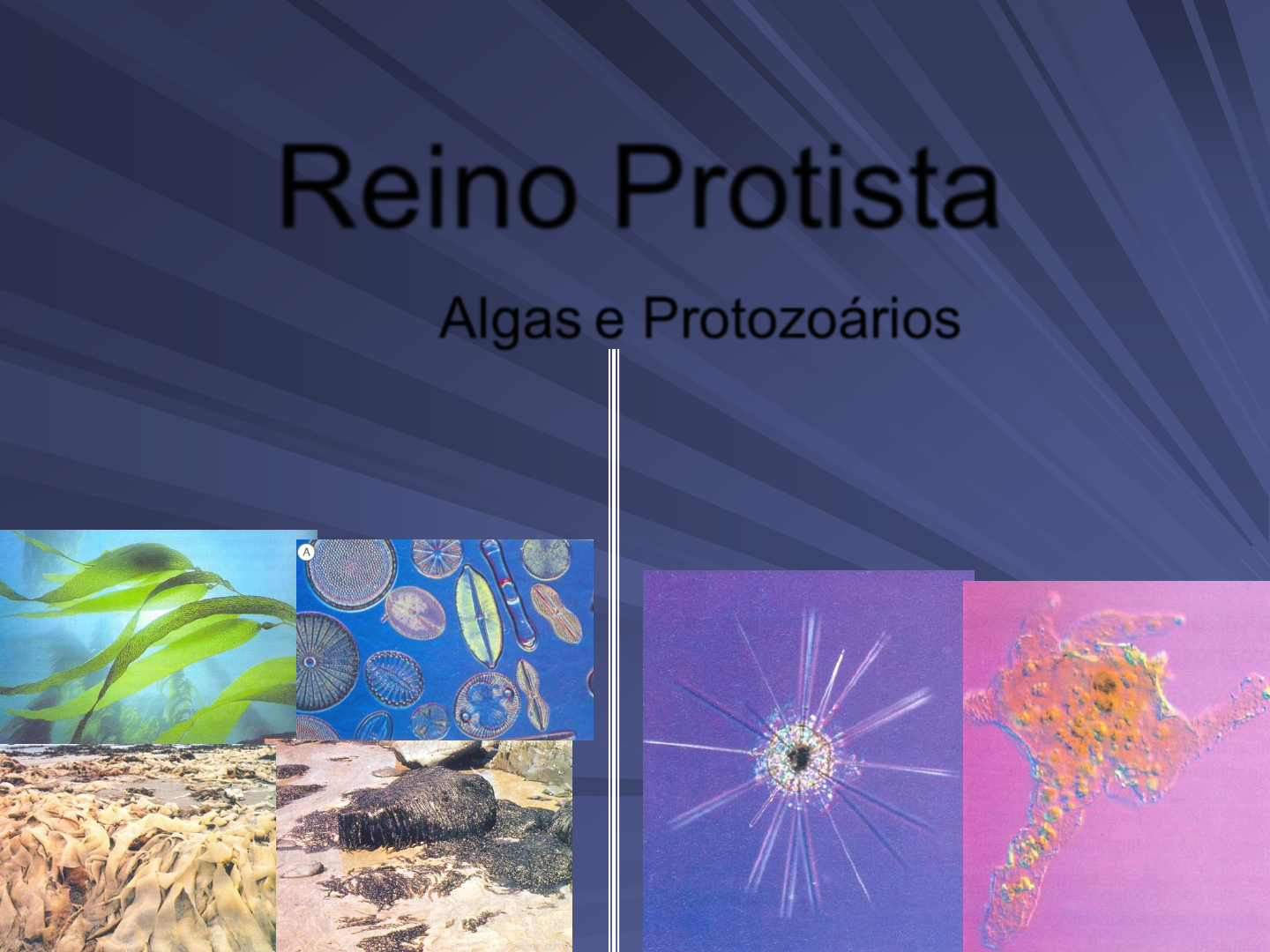* Reino Protista Algas e Protozoários Eucariontes Unicelulares ou pluricelulares Autótrofos Eucariontes Unicelulares Heterótrofos * Filo Euglenophyta: euglenóides - É a única alga que não possui parede celular e que apresenta vacúolo contrátil; - Vive exclusivamente em ambiente de água doce; - É mixotrófica, ou seja, pode se comportar de forma autotrófica na presença de luz ou de forma heterotrófica na ausência dela; * Os flagelados conhecidos como euglenófitas, ou euglenoides, compreendem mais de 80 gêneros e 800 a 1.000 espécies Os euglenóides são algas unicelulares que não possuem parede celular. As semelhanças entre os cloroplastos de euglenófitas e algas verdes – ambos apresentam clorofila a e b, além de vários carotenoides As células natantes de Euglena têm um único flagelo longo O vacúolo contrátil coleta o excesso de água de todas as partes da célula. Características * * Reprodução As euglenófitas reproduzem-se por mitose e citocinese longitudinal Reprodução sexuada e meiose não parecem ocorrer em euglenófitas, sugerindo que esses processos ainda não ha-viam surgido quando este grupo divergiu da linhagem principal de protistas. * Filo Cryptophyta (criptomônadas) Existem 200 espécies conhecidas de criptófitas As células de criptófitas são particularmente ricas em ácidos graxos poli-insaturados * São unicelulares, mas também podem formar colônias As criptófitas constituem uma das melhores evidências de que um hospedeiro eucariótico e incolor pode ter adquirido cloroplastos a partir de endossimbiontes eucarióticos. Além das clorofilas a e c e carotenos, os cloroplastos de algumas criptófitas contêm ficobilinas, podendo ser ficocianina ou, então, ficoeritrina. * * Filo Haptophyta - Haptófitas Existem cerca de 300 espécies conhecidas e distribuídas em 80 gêneros. A característica mais distintiva das haptófitas é o haptonema. * A maioria das haptófitas é fotossintetizante, com clorofila a, uma variante da clorofila c, e carotenoides, incluindo fucoxantina. Como em criptófitas, o retículo endoplasmático do cloroplasto é uma evidência de que os plastos foram adquiridos por endossimbiose secundária. * Reprodução Reprodução sexuada e alternância de gerações heteromórficas ocorrem nas haptófitas, mas o número de cromossomos e os históricos de vida de muitas formas são ainda desconhecidos. * Ecologia São importantes meios de transporte do carbono orgânico e de dois terços do carbonato de cálcio para o fundo dos oceanos. Além disso, as haptófitas marinhas são importantes produtoras de óxidos sulfúricos relacionados com a chuva ácida. O estágio colonial, gelatinoso, de Phaeocystis domina o fitoplâncton das zonas marginais de regiões polares e contribui com cerca de 10% dos compostos sulfúricos atmosféricos que são gerados pelo fitoplâncton. * * Filo Dinophyta - Dinoflagelados * Incluem cerca de 4000 espécies. Ocorrem em ambientes marinhos e água doce. São organismos unicelulares com dois flagelos * Os dinoflagelados encontrados no alto mar apresentam, com frequência, grandes e complexas placas tecais que se assemelham a velas de caravelas e auxiliam na flutuação. Outros dinoflagelados não têm placas celulósicas, ou estas são tão finas que parecem ausentes. * Diatomáceas – Classe Bacillariophyceae Existem 285 gêneros e 10.000 a 12.000 espécies reconhecidas de diatomáceas. Frústulas Não têm flagelos As diatomáceas secretam mucilagem pela fenda, possibilitando sua movimentação. (rafe) * Reprodução * BIBLIOGRÁFIA Raven | Biologia vegetal / Ray F. Evert e Susan E. Eichhorn; revisão técnica Jane Elizabeth Kraus; tradução Ana Claudia M. Vieira... [et.al.]. – 8. ed. – Rio de Janeiro: Guanabara Koogan, 2014. BICUDO, Carlos E. de M.; MENEZES, Mariângela (Org.). Gêneros de algas de águas continentais do Brasil: chave para identificação e descrições. 2. ed. São Carlos, SP: RiMa, 2006. JUDD, Walter S. et al. Sistemática Vegetal-: Um Enfoque Filogenético. Artmed Editora, 2009. MUNDOCIANO. Euglenophyta. Disponível em: <http://mundociano.blogspot.com/2011/12/euglenophyta.html>. Acesso em: 23 set. 2018. * 2 Sugerem que os cloroplastos das euglenófitas derivaram de uma alga verde endossimbiótica. Cerca de dois terços dos gêneros são incolores heterotróficos que se alimentam de partículas sólidas ou pela absorção de compostos orgânicos dissolvidos. Esses hábitos alimentares, além de maior necessidade por vitaminas, explicam por que muitas euglenófitas vivem em corpos d’água doce ricos em partículas ou compostos orgânicos Emerge da base de uma depressão anterior chamada reservatório e um segundo flagelo, não emergente. Uma intumescência na base do flagelo emergente, junto com a mancha ocelar ou estigma, no citoplasma, constitui o sistema fotossensível das euglenófitas. Ao contrário dos cloroplastos das algas verdes, os plastos das euglenófitas não estocam amido. Em vez disso, grânulos de um polissacarídio único conhecido como paramido formam-se no citosol. * A. Fotomicrografia mostrando dois grandes grãos de paramido e a película com estrias de proteínas helicoidalmente dispostas. A mancha ocelar vermelha, ou estigma, é visível no polo superior da célula. B. Estrutura de Euglena como interpretada a partir de micrografias eletrônicas. * continuando a nadar enquanto se dividem. O envoltório nuclear permanece intacto durante a mitose, como ocorre em muitos outros protistas e em fungos. Isso sugere que um envoltório nuclear mitótico intacto é uma característica primitiva e que o envoltório nuclear que se desintegra durante a mitose, como ocorre em plantas, animais e vários protistas, é uma característica derivada. * 2 que são essenciais para o crescimento e o desenvolvimento do zooplâncton. As criptófitas são algas fitoplanctônicas de grande importância ecológica por causa da sua palatabilidade e porque são frequen