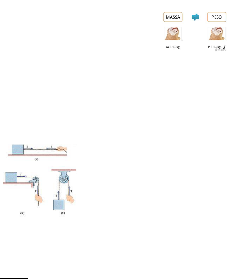1 FÍSICA I LEIS DE NEWTON (3ª Lei – AÇÃO E REAÇÃO) - 3ª LISTA DE EXERCÍCIOS Algumas forças especiais: FORÇA GRAVITACIONAL 𝐹𝑔⃗⃗ ⃗ – atrai os corpos em direção ao centro da Terra. (𝐹𝑔 = 𝑚𝑔) PESO P – módulo da força necessária para impedir que o corpo caia livremente, medida em relação ao solo. (𝑃 = 𝑚𝑔) FORÇA NORMAL 𝐹𝑁⃗⃗ ⃗⃗ – quando um corpo exerce uma força sobre uma superfície, a superfície (ainda que aparentemente rígida) se deforma e empurra o corpo com uma força normal 𝐹𝑁⃗⃗ ⃗⃗ que é perpendicular à superfície. ATRITO OU FORÇA DE ATRITO 𝑓 – resistência ao movimento. Ocorre devido às interações atômicas do corpo com a superfície. TRAÇÃO �⃗� – quando uma corda, cabo ou fio, preso a um corpo é esticada e puxada, aplica ao corpo uma força �⃗� , orientada ao longo da corda. A tensão da corda é o módulo da força exercida sobre o corpo (a corda é frequentemente considerada sem massa e inextensível, ela é somente uma ligação entre os dois corpos). Na figura (a), as forças estão em equilíbrio, isto significa que elas têm o mesmo módulo, mas sentidos opostos. Na figura (b), as forças estão em equilíbrio, ou seja, tem o mesmo módulo. O corpo suspenso na figura (c) pesa 75 N. A tensão T é igual, maior ou menor que 75 N quando o corpo se move para cima (a) com velocidade constante, (b) com velocidade crescente e (c) com velocidade decrescente? POLIAS OU ROLDANAS: São dispositivos que têm por função mudar a direção e o sentido (mas mantendo a intensidade) da força que traciona ou tensiona um fio ou uma corda ou podem ser usadas para aumentar ou diminuir a intensidade de uma força. Podem ser fixas ou móveis: POLIA FIXA: Muda a direção e sentido de uma força, mantendo sua intensidade. Está presa a um suporte rígido, fixo e executa apenas movimento de rotação, não de translação. Exemplos de polia fixa: Na figura 1, a força aplicada pelo homem que tem direção vertical e sentido para baixo passa a agir sobre o bloco na direção horizontal e sentido para a direita, mas com a mesma intensidade. Na figura 2, passa de vertical e para baixo (aplicada pelo homem) para vertical e para cima (agindo sobre o bloco). Na figura 3 a força aplicada pelo homem é transmitida ao bloco como vertical e para cima. Nas figuras 2 e 3, se os blocos estiverem em equilíbrio, a intensidade da força aplicada é sempre igual ao peso do bloco. Observe que, se o homem puxar a corda de 1 metro, cada bloco também se deslocará de 1 metro. 2 POLIA MÓVEL Assim, uma polia móvel consegue aumentar ou diminuir a intensidade de forças, mas tem a inconveniência de diminuir o deslocamento do corpo, ou seja, se sua mão subir de 2 metros, o bloco subirá metade, apenas 1 metro. ASSOCIAÇÃO DE POLIAS Uma polia fixa e outra móvel 3 Uma polia fixa e várias polias móveis (talha exponencial) O que você deve saber, informações e dicas Polia fixa muda a direção e sentido de uma força, mantendo sua intensidade. Está presa a um suporte rígido, fixo e executa apenas movimento de rotação, não de translação. Polia móvel aumenta ou diminui a intensidade de forças, mas tem a inconveniência de diminuir o deslocamento do corpo. Associação de polias A expressão abaixo é válida para n polias móveis, com n = 1, 2, 3, … 4 3ª LEI DE NEWTON – interação entre dois corpos. Quando dois corpos interagem, as forças que cada corpo exerce sobre o outro são iguais em módulo e tem sentidos opostos. 𝐹𝐵𝐴⃗⃗ ⃗⃗ ⃗⃗ = − 𝐹𝐴𝐵⃗⃗ ⃗⃗ ⃗⃗ |𝐹𝐵𝐴⃗⃗ ⃗⃗ ⃗⃗ | = |𝐹𝐴𝐵⃗⃗ ⃗⃗ ⃗⃗ | Chamamos as forças entre dois corpos que interagem de par de forças da terceira lei. Sempre que dois corpos interagem, um par de forças da terceira lei está presente, não importa que estejam em repouso, em movimento uniforme ou acelerado. OBS: O quilograma força, é definido como a intensidade da força peso de um corpo de 1kg de massa, próximo à superfície terrestre. 1𝑘𝑔𝑓 = 9,8𝑁 A B A B 𝐹𝐵𝐴⃗⃗ ⃗⃗ ⃗⃗ 𝐹𝐴𝐵⃗⃗ ⃗⃗ ⃗⃗ 5 1) Se duas forças agirem sobre um corpo, a que condições essas forças precisam obedecer para que o corpo fique em equilíbrio? 2) Uma pequena esfera pende de um fio preso ao teto de um trem que realiza movimento retilíneo. Explique como fica a inclinação do fio se: a) o movimento do trem for uniforme; b) o trem se acelerar; c) o trem frear. 3) A gravidade sobre a superfície da lua é apenas 1/6 da gravidade sobre a superfície da terra. Qual é o peso de um objeto de 10kg sobre a lua e sobre a terra? Qual é a massa do objeto em cada superfície? (RESPOSTA 𝑃𝐿𝑢𝑎 = 16,33𝑁; 𝑃𝑇𝑒𝑟𝑟𝑎 = 98𝑁; 𝑚𝐿𝑢𝑎 = 𝑚𝑇𝑒𝑟𝑟𝑎 = 10𝑘𝑔) 4) Em termos da 1ª lei de Newton, como o encosto de cabeça do banco de um automóvel ajuda a prevenir lesões no pescoço causadas quando seu carro sofre uma colisão pela traseira? 5) Por que você cambaleia para frente num ônibus que para subitamente? Por que cambaleia para trás quando ele se torna mais rápido? 6) Um bloco de 10kg encontra-se inicialmente em repouso sobre uma superfície plana e sem atrito. Calcule a aceleração adquirida pelo bloco ao ser empurrado com uma força horizontal constante de 8N. (RESPOSTA a=0,8m/s2) 7) A velocidade de um corpo de massa 1kg aumentou de 20m/s para 40m/s em 5s. Qual a força que atuou sobre esse corpo? (RESPOSTA: 4N) 8) A figura mostra vistas superiores de quatro situações nas quais forças atuam sobre um bloco que está em um piso sem atrito. Se o módulo das forças forem escolhidos apropriadamente, em que situações é possível que o bloco (a) esteja em repouso, (b) se movendo com velocidade constante? 9) Uma força vertical 𝐹 é aplicada a um bloco de massa 𝑚 que está sobre um piso. O que acontece com o módulo da