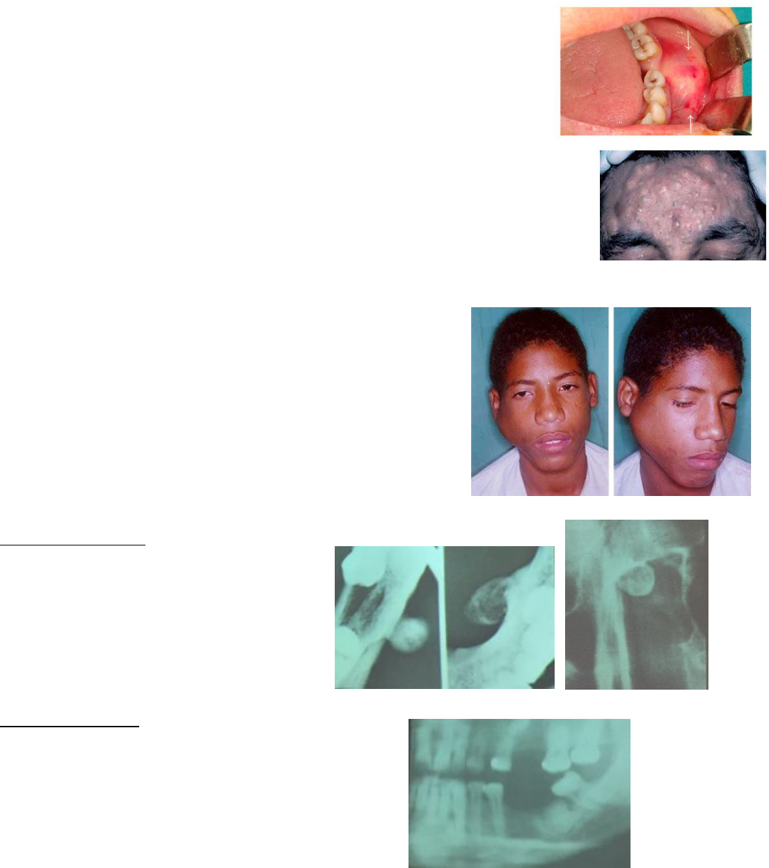 PSD III Vanessa Silveira PATOLOGIAS ÓSSEAS Lesões benignas OSTEOMA » Tumor benigno caracterizado pela proliferação de osso compacto ou esponjoso. » O DNA da célula para de funcionar (se inativa), fazendo com que ela não faça mais o ciclo de vida a fim de ser eliminada e começa a se proliferar. » Classificado como: Osteoma Perióstico (mais superficial); Osteoma Endósteo ou Osteoma central; OSTEOMA DOS TECIDOS MOLES: - Lesão semelhante ao tecido ósseo, localizado na derme ou na submucosa oral. - MUCOSA JULGAL. » SÍNDROME DE GARDNER Distúrbio raro; Paciente com pólipos adenomatosos múltiplos de cólon e reto – ENDOSCOPIA (gastro); Cistos epidermóides cutâneos e fibromas (pode-se ver na pele); LESÕES COMUNS: - Osteomas (central ou periósteo); - Odontomas múltiplos; Dentes supranumerários e impactos. Características CLÍNICAS: ▪ LOCALIZAÇÃO: Corpo da mandíbula ou côndilo; ▪ Rara localização em tecidos moles; ▪ Lesões solitárias; ▪ Assintomáticas; ▪ Crescimento lento; ▪ Pediculado (inserção menor que a lesão, sendo seu corpo maior) ou séssil (inserção maior que a lesão, sendo seu corpo menor); Características RADIOGRÁFICAS: OSTEOMA PERIÓSTICO ▪ Massa esclerótica circunscrita; ▪ Padrão trabecular central (NUVEM - mistura de radiopaco/radiolúcido). OSTEOMA ENDÓSTEO ▪ Massa radiopaca; ▪ Pode ser confundido com ODONTOMA COMPLEXO. ▪ Halo radiolúcido e bem delimitado. PSD III Vanessa Silveira Características HISTOPATOLÓGICAS: OSTEOMAS COMPACTOS ▪ Tecido ósseo compacto (preenchimento completo com presença de osteoblastos) OSTEOMAS ESPONJOSO ▪ Presença de trabéculas ósseas TRATAMENTO: ▪ Baixa recidiva; ▪ Periósteo: fácil de remover sem deixar sequela ao paciente; Central: o osso todo pode ir junto. OSTEOMA OSTEÓIDE » Pode ser confundido com uma neoplasia (proliferação tecidual) ou uma lesão reativa inflamatória (desgaste do tecido ósseo); Características CLÍNICAS: ▪ Raro na mandíbula; ▪ Mais comum nos ossos longos; ▪ Acomete indivíduos jovens; ▪ Dor noturna; ▪ Localizado dentro do osso; Características RADIOGRÁFICAS: ▪ Área radiolúcida bem circunscrita; ▪ Menor que 1 cm; ▪ Zona de esclerose reativa circundante; ▪ Presença de ninho radiopaco; Características HISTOPATOLÓGICAS: ▪ Trabéculas ósseas em estroma fibrovascular celular; ▪ Osteoblastos proeminentes; ▪ A lesão é ricamente celular – LESÃO INFLAMATÓRIA. ▪ Zonas de tecido ósseo compacto destruído (área circunscrito). HEMANGIOMA DO OSSO Características CLÍNICAS: ▪ Dor ou parestesia; ▪ Pulsação (devido a área pequena); ▪ Aumento de volume (aumento vascular do tecido ósseo); ▪ Sangramento espontâneo (aglomerado de vasos no local); ▪ Mais comum na mandíbula. PSD III Vanessa Silveira Características RADIOGRÁFICAS: ▪ Variável (pode ser apresentada em BOLAS DE SABÃO ▪ Reabsorção e deslocamento das raízes dos dentes (para dar espaços aos ossos); ▪ Grandes lesões causam expansão cortical. Lesão maligna OSTEOSSARCOMA » Lesão maligna de células mesenquimais que tem a capacidade de produzir osso imaturo ou osteóide. FATORES PREDISPONENTES: ▪ Terapia por irradiação em DISPLASIA FIBROSA; ▪ Desordens ósseas pré-existentes: DISPLASIA FIBROSA; DOENÇA DE PAGET; DOENÇAS CARTILAGINOSAS; ▪ Traumatismo na área. Características CLÍNICAS: ▪ Ossos longos (2ª e 3ª década); ▪ Ossos gnáticos (3ª década); ▪ Crescimento rápido (se duplica a cada semana); ▪ Aumento de volume e dor (por compressão); ▪ Reabsorção radicular; ▪ Pode impedir o paciente de abrir a boca (área de côndilo). ▪ FORMAS CLÍNICAS: Central (mais comum) Justacortical ou periférico (mais esterno); - Tecido mole (área de gengiva). Telangectásico (prognóstico pior – infiltrado inflamatório envolvido). Características RADIOGRÁFICAS: ▪ Osteolítico (destruição de tecido ósseo compacto – fica com aparência de trabecular); ▪ Esclerótico (margens não definidas); ▪ Misto (tem áreas escleróticas e tem áreas que se dá para diferenciar); ▪ Aspecto de RAIOS DE SOL (na oclusal); Características HISTOPATOLÓGICAS: ▪ Atipias celulares. ▪ TIPOS: > Osteoblástico – osso envolvido >> ROSA > Condroblástico – cartilagem envolvido >> LILÁS > Fibroblástico – fibroblastos envolvidos