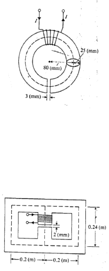 Exercícios Eletromagnetismo: Um toróide com núcleo de aço possui permeabilidade relativa igual a 3000 e tem um raio médio igual a 80 mm. A seção circular tem raio igual a 25 mm. O entreferro de ar é de 3mm e a corrente percorre uma espira de 500 voltas e produz um fluxo magnético de Wb. Calcule: A relutância do entreferro e do núcleo de aço. B e H no entreferro e no núcleo de aço. A corrente I quer percorre o toróide. Considere o circuito magnético abaixo. Uma corrente de 3A circula através do enrolamento central de 200 voltas. Assuma que o núcleo tem uma área constante transversal de m² e uma permeabilidade relativa de 5000. Determine o fluxo magnético em cada lado da figura. Determine a intensidade de fluxo magnético do núcleo e no entreferro. Considere uma região de fronteira y=0 entre o ar com µr=1 na região 1 e aço na região 2 com µr=5000. Se B1 = (0.5 ax -10 ay) mT, encontre B2 e o ângulo que B2 faz com a interface. Se B2 = (10 ax + 0.5 ay) mT, encontre B1 e o ângulo que B1 faz com a normal da interface. O circuito magnético tem uma parte na forma de um C em aço fundido e uma parte 2 em ferro fundido. Encontre a corrente necessária cujo enrolamento tem 150 espiras e com densidade de fluxo magnético B2 = 0,45T.