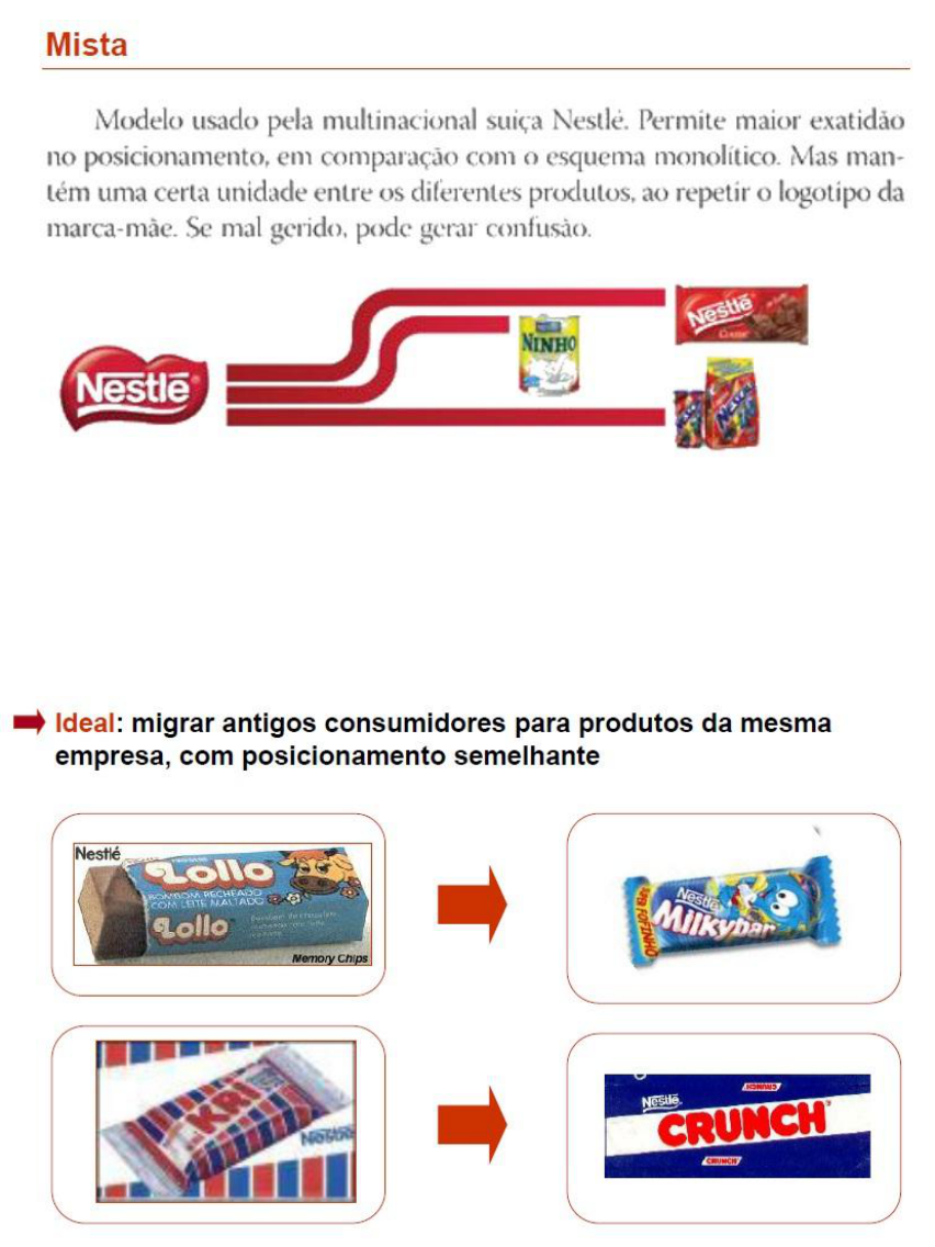 Produtos – Nestlé Marca: Mudanças incrementais da marca e do produto: Cada Produto da Nestlé está segmentado por marcas, onde um produto pioneiro é o carro chefe da linha de produtos. São mais de 61 marcas distribuídas em achocolatados, biscoitos, lacticínios, sorvetes, etc. Ex: Leite Moça: A marca Leite Moça é segmentada por categorias e tipos: Categorias: Praça e mercados de atuação: Assim como nos produtos, a Nestlé atua em seus segmentos de mercados com diversas marcas, e tem atuação tanto no mercado doméstico (marcas a esquerda) como no mercado comercial e industrial (marca à direita) e tem como praças de distribuições dos seus produtos (mercado para os produtos domésticos), os principais atacadistas, supermercados, bares e lanchonetes, também atua como fornecedor (mercados comerciais e industriaias) de mantimentos para companhias áreas, fast-foods, hotelaria e restaurantes, hospitais, industrias, confeitarias e panificadores, cozinhas industriais e diversos órgãos públicos.