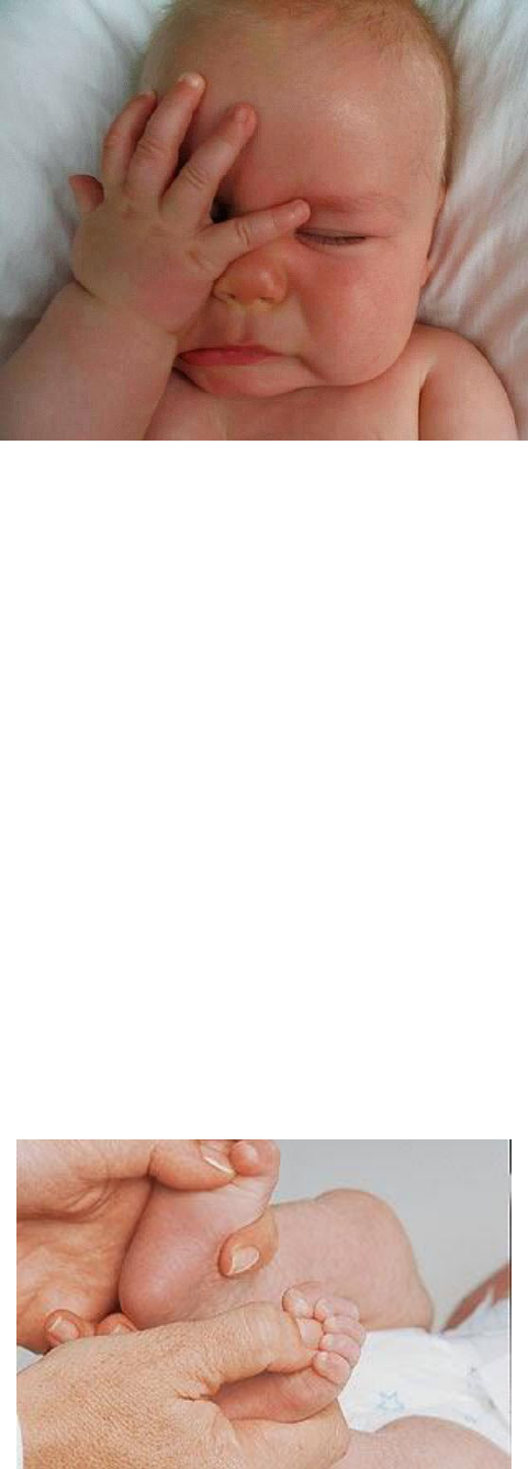 Reflexos Primitivos Os reflexos primitivos são movimentos automáticos, estereotipados, dirigidos desde o tronco-encéfalo e executados sem implicação cortical. Assim, o movimento que se desenvolve pelo estímulo de um reflexo primitivo é inconsciente. Reflexos são reações involuntárias em resposta a um estímulo externo e consistem nas primeiras formas de movimento humano. Dessa forma, servem como fonte primária de informações, as quais se armazenam no córtex em desenvolvimento. Nos primeiros meses de vida, a presença, intensidade e simetria desses reflexos podem ser usadas para avaliar a integridade do sistema nervoso central e para detectar anormalidades periféricas, como alterações músculo-esqueléticas congênitas ou lesões nervosas. Por outro lado, a persistência da maioria desses reflexos no segundo semestre de vida, também indica anormalidades do desenvolvimento. São denominados reflexos primitivos, aqueles relacionados à sobrevivência, com funções de busca de alimentação e de proteção. Já os chamados reflexos posturais, são os precursores de movimentos voluntários. Alguns desses reflexos, como o de sucção, preensão palmar, plantar e o da marcha serão substituídos por atividades voluntárias; outros, como o de Moro simplesmente desaparecerão. Reflexo de Preensão Palmar e Plantar (Preênsil) Para testar o reflexo de preensão palmar aplica-se ligeira pressão na face palmar da mão do bebê junto da zona distal dos metacarpos. Como resposta a criança fecha os dedos (fecha a mão).Para testar o reflexo plantar aplica-se pressão na face plantar do pé do bebé na região mais distal dos metatarsos.Como resposta o bebê vai flectir os dedos do pé. Reflexo de Sucção Quando um objecto é colocado na boca do recém-nascido, ele começa a succionar imediatamente. Reflexo de busca Quando qualquer um dos extremos da boca de recém-nascido é tocado, ele vira a cabeça para esse lado. Este reflexo permite que o recém-nascido encontre o mamilo. Reflexo de Moro Aparece com o recém-nascido e desaparece por volta dos 4/6 meses. Testa-se deslocando-se o centro de gravidade da criança, ou dando um estímulo visual ou sonoro. Como resposta vai haver uma abdução e extensão dos membros, com extensão e abertura dos dedos, exceto as falanges distais dos indicadores e polegares que permanecem em flexão. Em seguida ocorre a adução e flexão dos membros. Reflexo da Marcha Automática Testa-se levantando a criança e pressionando a face dorsal de um dos pés contra o bordo de uma mesa. Como resposta teremos a flexão dos diferentes segmentos da perna, trazendo o pé acima da mesa e assim que se estabelece o contato ativo ou passivo da face plantar do pé com a mesa, ocorre a extensão do membro inferior. Placing Nos membros superiores tem início por volta do segundo mês, tornando-se um reflexo de extensão protetiva por volta do sexto mês. A criança é segurada pelo examinador e a face dorsal de uma das mãos é pressionada sob a borda de uma mesa. Como resposta temos a flexão dos membros superiores que trazem a mão para cima da mesa. Reação positiva de apoio Aparece entre o 1º e o 3º mês e desaparece por volta do oitavo mês. É provocado através de estímulo proprioceptivo (dorsiflexão das partes distais dos membros) ou exteroceptivo (provocado pelo contacto das plantas dos pés com o solo). Como resposta teremos a contração simultânea de extensores e flexores. Reação Cervical de Retificação Está presente ao nascimento e desaparece por volta do segundo mês. É obtida virando-se a cabeça do bebê para um lado (pode ser ativa ou passivamente). Como resposta vamos ter um aumento do tônus do tronco e o bebé vira para o lado oposto em bloco. Reação Labiríntica de Retificação Está presente no recém-nascido e começa a ficar mais presente por volta do quarto mês. Esta reação permite a elevação da cabeça na posição prona. No início a cabeça pode ser mantida levantada fraca ou intermitentemente, mas, o bebê irá mantê-la bem na linha média, a partir da oitava semana (2 meses). Ao conseguir levantar a cabeça na posição prona, inicia-se um processo de extensão geral do tronco e dos membros, contra a gravidade, que começa céfalo-caudal e alcança a pélvis e joelhos por volta do sexto mês. Reação Óptica de Retificação Quando os olhos se movem, a cabeça e o corpo também giram em direção ao objecto, ao qual a atenção foi direcionada. Com a maturação das vias ópticas por volta dos seis meses de idade, é que se inicia a reação de retificação pela visão. Reação de Landau Esta reação é uma combinação das reações de retificação e dos reflexos tônicos. Aparece por volta dos seis meses de idade. Quando se levanta uma criança de bruços da mesa, apoiada apenas com a mão do examinador sob o tórax, a criança primeiro ergue a cabeça, de maneira que a face esteja numa posição vertical, após esta elevação da cabeça ocorre uma extensão tônica da coluna e membros inferiores, que pode ser tão forte que todo o corpo da criança torna-se curvado para trás. Reflexo de Galant Um estímulo doloroso na região lombar do bebê em prono, provocará a flexão do tronco para o lado estimulado. Nos primeiros dias de vida a resposta é frequentemente ausente ou fraca. Este reflexo desaparece geralmente durante o segundo mês. Reação de Anfíbio Esta reação torna o indivíduo capaz fazer flexão dos membros inferiores na preparação para o arrastar, proporcionando a dissociação entre tronco, ombros e pélvis. Esta reação inicia-se no quarto mês e permanece para a toda a vida. O teste é realizado levantando-se um lado da pélvis, sob a virilha. O membro inferior deste lado flexiona e abduz, enquanto que o membro do lado oposto entra em extensão. Reflexo Tônico Cervical Assimétrico (RTCA) É estimulado pela rotação da cabeça e causa a extensão dos membros para o lado em que a cab