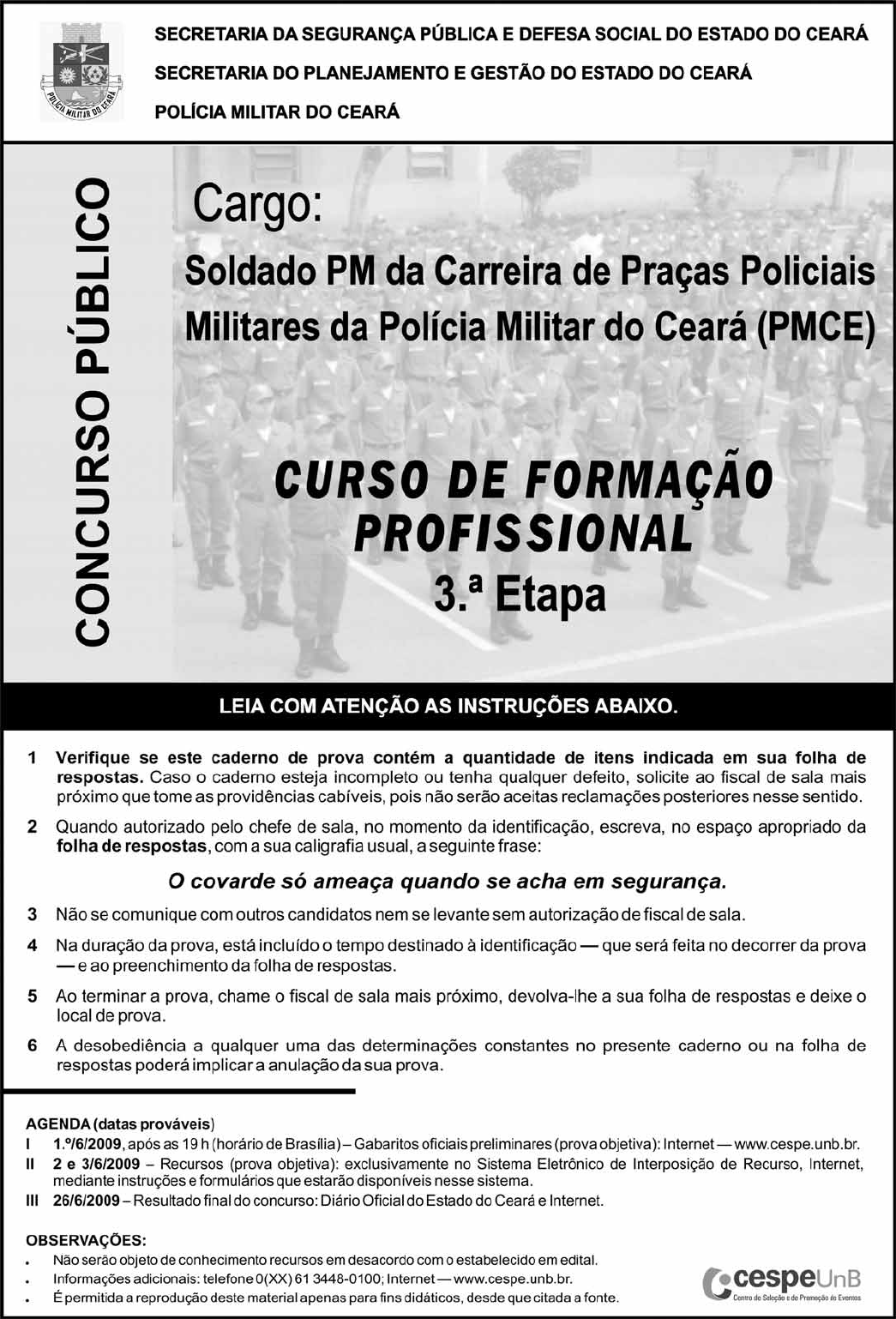 UnB/CESPE – PMCE Curso de Formação Profissional – 1 – • De acordo com o comando a que cada um dos itens a seguir se refira, marque na folha de respostas, para cada item: o campo designado com o código C, caso julgue o item CERTO; ou o campo designado com o código E, caso julgue o item ERRADO. Para as devidas marcações, use a folha de respostas, único documento válido para a correção das suas respostas. • Os itens desta prova devem ser julgados exclusivamente à luz das apostilas do Curso de Formação, deixando de parte quaisquer divergências entre estas e outras fontes. PROVA OBJETIVA No que se refere a ética, moral e justiça segundo Platão e Aristóteles, julgue os seguintes itens. 1 Em resposta ao clamor para que fosse resgatado o sentido de ética, de moral e de justiça que se havia perdido durante o período de crescimento e enriquecimento de Atenas, Platão propôs que se resgatassem os mitos pré-socráticos. 2 Para Platão, a lei devia moldar o real; para Aristóteles, o real é que devia moldar a lei. No que tange aos conceitos de ética e de sociedade, julgue os itens a seguir. 3 A palavra sociedade vem da palavra latina societas, que significa uma associação conflituosa entre indivíduos. Por sua vez, a palavra societas é derivada de socius, que significa competidor. Desse modo, o significado de sociedade está intimamente relacionado à ideia de competição e de conflito social. 4 É por meio da ética que são estabelecidos os códigos públicos ou privados de conduta, ou seja, é por intermédio dela que são determinados quais comportamentos concretos e objetivos são considerados morais. É a reflexão de cunho ético que suscita perguntas como: que ações produzem mais felicidade que sofrimento e merecem ser realizadas por nós? Que ações criam condições efetivas de bem-estar social, e não de injustiças? Com referência à moral e à ética, julgue os próximos itens. 5 Moral e ética são palavras empregadas como sinônimos no sentido de conjunto de princípios ou padrões de conduta. Ambas as palavras são empregadas também para fazer referência ao pensamento reflexivo sobre as ações humanas involuntárias ou, ainda, sobre o efeito dessas ações nas condutas adotadas pelos profissionais no exercício de suas profissões. 6 A ética é uma disciplina que objetiva o exercício da cidadania. Nesse sentido, pode-se constatar elementos que identificam questões morais ao se analisar o artigo 1.º da Constituição Federal de 1988 (CF), como um dos objetivos da República, a supressão dos direitos fundamentais. No que concerne à cidadania, julgue os itens subsequentes. 7 A cidadania pode ser corretamente definida como um status jurídico e político mediante o qual o cidadão adquire os seus direitos como indivíduo — os chamados direitos sociais, políticos e civis — e os seus deveres relativos a uma coletividade política, além de adquirir a faculdade de participar na vida coletiva do Estado. 8 São duas as grandes transformações que questionam o Estado-Nação contemporâneo e o conceito de cidadania que lhe é inerente: a globalização e o surgimento de sociedades cada vez mais multiculturais. Quanto ao disposto no artigo 5.º da CF, julgue os itens que se seguem. 9 Embora todos sejam iguais perante a lei, sem distinção de qualquer natureza, os estrangeiros residentes no país não possuem garantias de inviolabilidade do direito à liberdade e à segurança, exceto quando contraírem núpcias com brasileiro nato. 10 São invioláveis a intimidade, a vida privada, a honra e a imagem das pessoas. Além disso, a casa é o asilo inviolável do indivíduo, ninguém podendo nela penetrar sem o consentimento do morador, salvo em caso de flagrante delito ou desastre, ou para prestar socorro, ou, durante o dia, por determinação judicial. Acerca de direito processual penal, julgue os itens seguintes. 11 Nos crimes de ação penal pública, a autoridade policial tem o dever de apresentar em juízo a denúncia contra o suspeito. 12 Um auto de prisão em flagrante originado de um inquérito vicioso pode ser corretamente considerado inválido e ineficaz. 13 A queixa-crime é uma petição inicial que expõe detalhadamente um fato criminoso e com a qual se inicia a ação penal privada, ao passo que a denúncia é peça apresentada pelo Ministério Público em que se formula acusação contra alguém, imputando-lhe a prática de um crime. 14 No interrogatório, que só pode ser feito no início do processo, o acusado tem o direito de permanecer calado, e o seu silêncio não pode ser interpretado contra sua defesa. 15 Flagrante esperado é aquele que se realiza quando se toma conhecimento de que vai ocorrer uma infração penal, e a autoridade policial desloca-se para o local, apenas aguardando e observando a atuação do agente, sem induzir ou provocar o crime. UnB/CESPE – PMCE Curso de Formação Profissional – 2 – Em cada um dos itens abaixo, é apresentada uma situação hipotética, seguida de uma assertiva a ser julgada à luz do direito penal. 16 João, com 17 anos, 11 meses e 29 dias de idade, atirou no coração de Pedro. Este, em decorrência do referido disparo, veio a falecer no dia seguinte. Nessa situação, João responderá pelo resultado morte. 17 Lívia, mãe de um recém-nascido, decidida a não mais cuidar da criança, deixou de amamentá-la, vindo o bebê a falecer por inanição. Nessa situação, Lívia responderá por omissão de socorro. 18 Leonardo ameaçou matar Guilherme, o qual, para se defender, adquiriu um revólver e, assim que avistou Leonardo na rua, alvejou-o por duas vezes, provocando-lhe a morte. Nessa situação, não se configurou hipótese de legítima defesa. 19 Alan é matador de aluguel e foi contratado por Leôncio para matar Filomeno. Ao avistar a vítima, Alan constatou tratar-se de antigo desafeto seu, razão por que decidiu matá-lo com emprego de meio cruel. Nessa situação, L