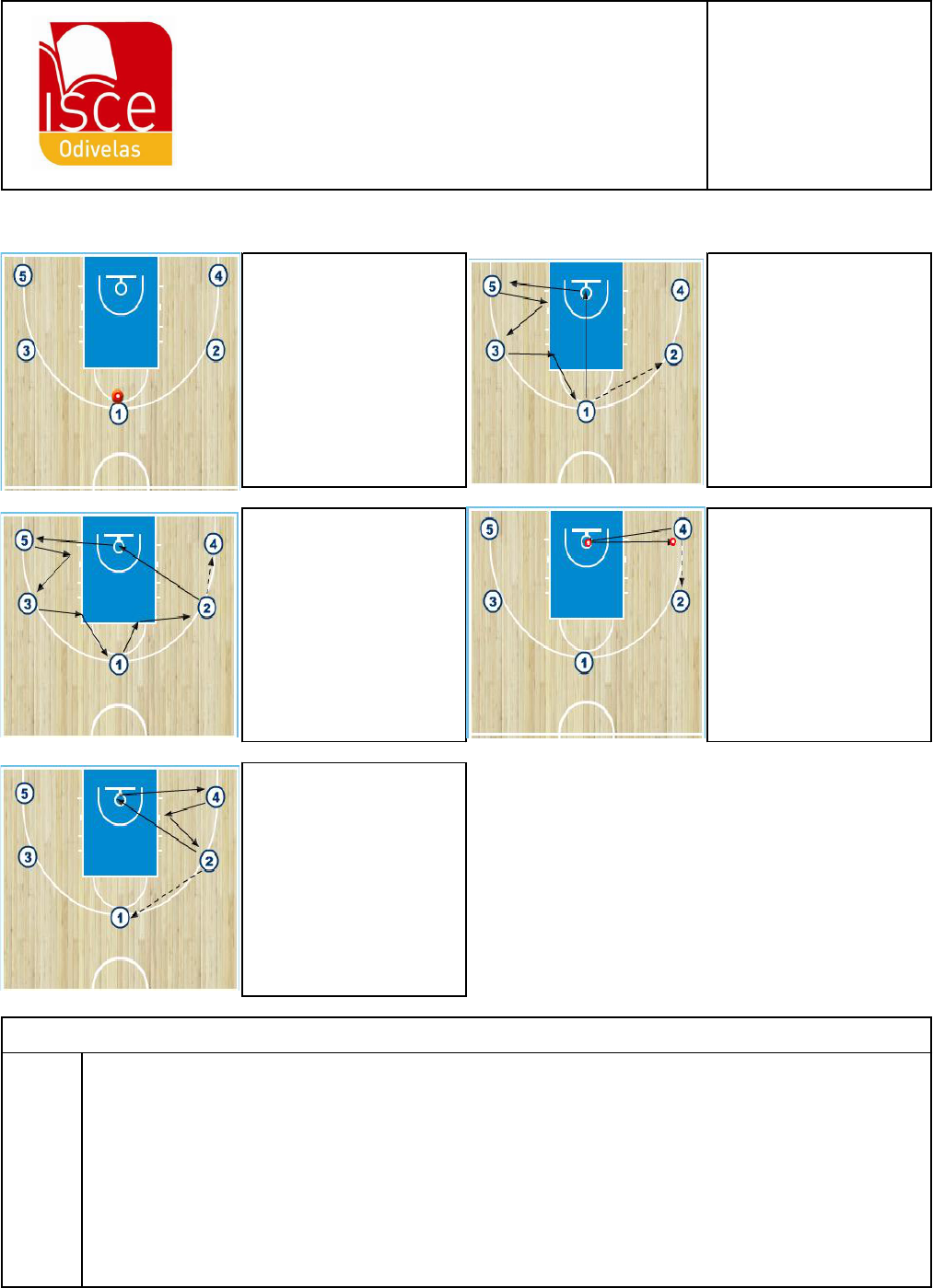 Opções 1 2 3 4 5 6 7 8 9 Combinações Básicas Ofensivas Instituto Superior de Ciências Educativas Curso de Eucação Física e Desporto 5x5 em meio campo 5 jogadores abertos debaixo do cesto. 1 na posição de base e 4 nas Se não receber sai para o lado Dispositivo inicial com 01 passa a 02 e corta até 03 e 05 repõem posições... posições de extremo contrário. receber sai para o lado receber, sai para o mesmo 02 passa a 04 e corta até 04 passa a 02 e corta até debaixo do cesto. Se não debaixo do cesto. Se não 02 passa a 01 e corta até contrário. lado. 05, 03 e 01 repõem… receber, sai para o mesmo lado e 04 repõe posição livre. debaixo do cesto. Se não PRINCÍPIOS Ao passe penetrante, corte e sai para o lado contrário. Os restantes jogadores repõem as posições livres. Ao passe não penetrante, corte e sai para o mesmo lado. Os restantes jogadores repõem as posições livres. Posição de Tripla Ameaça: Enquadramento e protecção da bola. Passe e corte pela frente, não sendo possível, corte nas costas. Passe e corte com saída para o lado contrário. Jogadores sem bola em movimento permanente. Movimentos em função da bola e em função do cesto, mas sempre mantendo a distância de 4 passos dos colegas. Quando defendido, corte à sobremarcação. Quando o portador da bola dribla sobre um colega, este reage fazendo o aclarado. Quando o jogador com bola Ao repor uma posição, se a Dribla para uma posição linha de passe estiver aclarado fazer um corte nas costas. Mantêm-se os princípios. "Back Door" já ocupada, faz-se o fechada, devemos Corte nas costas de 01 corta saindo para o lado para o lado contrário. contrário; 04 repõe a posição livre de 02 Progressão 04 passa a bola a 02 e o2 passa a 01 e corta saindo 05 repõe aposição livre 05 repõe a posição livre de 04 Podemos manter os mesmos Podemos alterar o dispositivo ofensivo de 1x2x2 para 2x2x1 - Posteriormente podemos introduzir os bloqueios Indiretos Deverão manter-se os mesmos principios, só alterando os do passe de retorno. Assim introduzimos: - o corte para o cesto e para abola; Princípios.