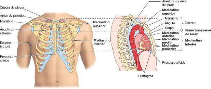 ANATOMIA DO CORAÇÃO Mediastino Porção central do tórax, o mediastino é o espaço compreendido entre os pulmões (mais especificamente a pleura parietal) bilateralmente e entre o esterno+cartilagens costais e vértebras torácicas, antero-posteriormente. Vai da abertura superior do tórax até o diagfragma inferiormente. É uma região com alta mobilidade, visto que compreende vísceras cavitárias (com líquido ou ar). Nele, estão todas as vísceras torácicas, exceto os pulmões. Pode ainda ser subdividido em superior, que vai da abertura superior do tórax até o plano do ângulo esternal (que transpassa as vértebras T IV e V posteriormente, constituindo o chamado plano transverso do tórax), e inferior, que vai do plano transverso do tórax até o diafragma.Esse pode ser subdividido em mediastino anterior, médio e posterior. Pericárdio e seu conteúdo constituem mediastino médio. Pericárdio É uma membrana "fibrosserosa" que envolve como um saco fechado o coração e o início de seus grandes vasos. É formado por duas camadas: pericárdio fibroso, mais externo, e pericárdio seroso, mais interno. O pericárdio fibroso possui mobilidade reduzida, e está fixado por meio de ligamentos a algumas estruturas. Anteriormente conecta-se com o esterno pelos ligamentos esternopericárdicos superior e inferior (ao manúbrio e processo xifóide) e inferiormente ao diafragma pelo ligamento pericárdicofrênico. O pericárdio seroso está intimamente ligado ao coração, constituindo o epicárdio. Entre as duas camadas pericárdicas há um espaço virtual, a cavidade do pericárdio, preenchido por líquido, de modo a diminuir o atrito entre as membranas. A irrigação e drenagem é dada pelas artérias e veias pericárdiofrênicas. Coração "Bomba dupla, autoajustável, de sucção e pressão, cujas partes trabalham em conjunto para impulsionar sangue para todos os locais do corpo". É composto por quatro câmaras: átrios direito e esquerdo e ventrículos direito e esquerdo. Suas fibras musculares estão aderidas ao esqueleto fibroso do coração, composto por quatro anéis fibrosos que circundam os óstios das valvas, dois trígonos fibrosos, formados por conexões entre os anéis e as partes membranáceas dos septos interatrial e interventricular. Externamente, os átrios são demarcados dos ventrículos pelo sulco coronário ou sulco atrioventricular, enquanto que os ventrículos são demarcados entre si pelos septos interventriculares (anterior e posterior). O ápice do coração é formado pela porção infero-lateral do ventrículo esquerdo, permanecendo imóvel durante o ciclo cardíaco e é o local de maior intensidade dos sons de fechamento da válvula mitral, constituindo o ictus cordis. O coração possui quatro faces. A esternocostal é formada principalmente pelo VD, a diafragmática formada principalmente por VE, a pulmonar direita formada principalmente por AD e a pulmonar esquerda formada por VE, que forma a impressão cardíaca no pulmão esquerdo. O coração possui, ainda, quatro margens. A direita (AD), a inferior (VD, quase horizontal), esquerda (oblíqua, quase vertical, formada pelo VE e aurícula esquerda) e superior (AD,AE e aurículas). O átrio direito forma a margem direita do coração e recebe sangue das VC superior e inferior e o seio coronário. Possui a aurícula direita, projeção muscular cônica que se projeta do átrio direito para aumentar sua capacidade. Em seu interior tem-se uma parede posterior lisa, o seio das cavas, onde se abrem as VCI e VCS além do seio coronário. Há também uma parede muscular rugosa, composta pelos músculos pectíneos. Essas paredes lisa e rugosa são delimitadas externamente pelo sulco terminal e internamente pela crista terminal. O sangue é passado ao ventrículo direito pelo óstio atrioventricular direito, onde está a valva tricúspide. O ventrículo direito é a cavidade que recebe o sangue do átrio direito durante a diástole. A comunicação entre as duas cavidades é dada pela valva tricúspide, composta pelas válvulas anterior, posterior e septal. As bases das válvulas estão fixadas nos anéis fibrosos ao redor do óstio. As cordas tendíneas fixam-se nas margens livres e às superfícies ventriculares das válvulas. Tais cordas se originam dos músculos pectíneos e agem em sincronia com o ciclo cardíaco. Isso é especialmente importante, pois na sístole, quando há aumento da pressão intraventricular, poderia haver refluxo de sangue para os átrios. Além dos músculos papilares, existem as trabéculas cárneas, as quais conferem um aspecto rugoso à parede de VD. Há o septo interventricular que separa fortemente os ventrículos. Superiormente e à esquerda, o ventrículo sofre um afunilamento para formar o cone arterial, por onde haverá ejeção de sangue para o tronco pulmonar, através da valva pulmonar semilunar. Devido ao movimento "em U" realizado pelo coração, existe uma crista supraventricular que direciona esse fluxo sanguíneo ao tronco pulmonar. O átrio esquerdo forma a maior parte da base do coração e recebe o sangue oriundo das 4 veias pulmonares. Em seu interior há uma parte maior com paredes lisas e uma aurícula menor, com músculos pectíneos. Vale ressaltar que a parede atrial esquerda é ligeiramente mais espessa que a do átrio direito. O ventrículo esquerdo forma o ápice do coração e quase toda a sua face pulmonar esquerda. Recebe o sangue do átrio esquerdo que passa através da valva bicúspide ou mitral. Assim como o VD, o VE possui músculos papilares e cordas tendíneas fixadas às válvulas, sendo mais numerosos. Há também paredes recobertas por trabéculas cárneas, que são mais finas e numerosas do que no VD. Há uma parte não muscular, na saída, de parede lisa, o vestíbulo da aorta. A valva da aorta é semelhante à valva pulmonar, possuindo três formações semilunares, posterior, direita e esquerda. Imediatamente acima das válvulas direita e es