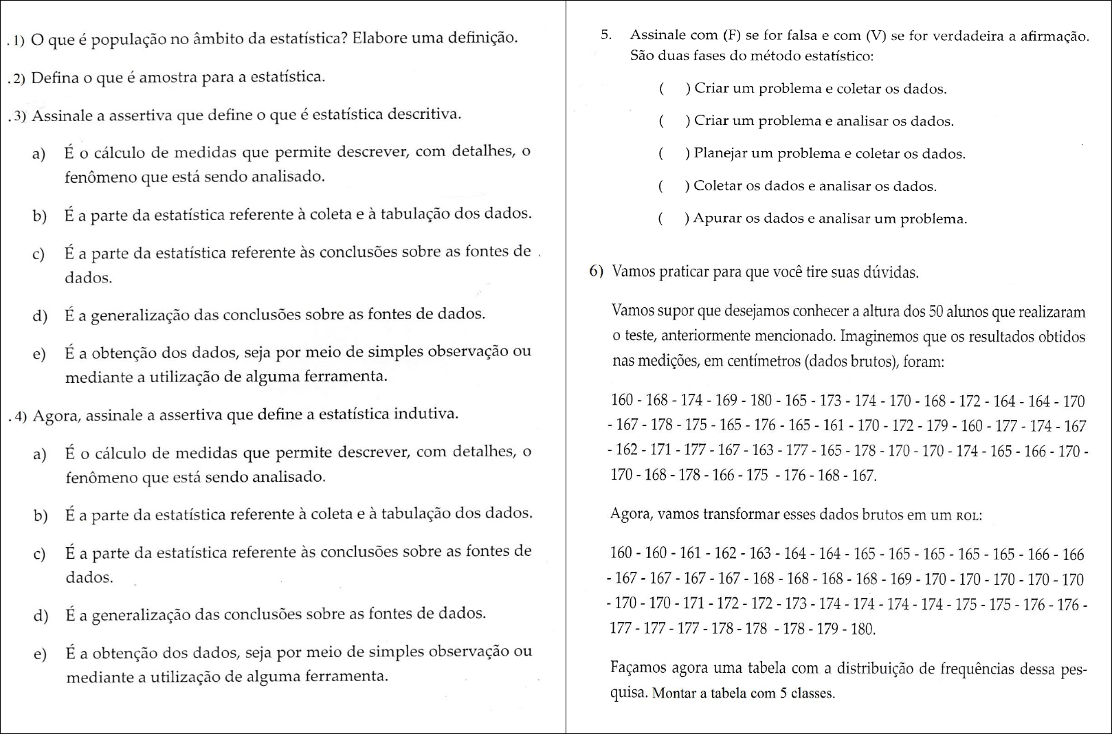 Exercício 15: Nesse caso onde a variável está representada por classes. xi – Pontos médios das classes Pmi N – É a somatória das frequências Exercício 18. Mediana Quando os dados estão em série, ou seja, não agrupados. 1º passo: colocar os dados na série em ordem crescente ou decrescente. 2º passo: se a quantidade de dados da serie for impar a mediana é o valor central. Se a quantidade de dados da serie for par a mediana é a média dos valores centrais da serie. Quando os dados estão agrupados, ou seja, na forma de tabelas em classes (ou intervalos): 1º passo: determinar 2º passo: identificar a classe onde a mediana se encontra. 3º passo: calcular a mediana: onde: Li – limite inferior da classe que contém a mediana. n – tamanho da amostra ou da população pesquisada () – soma das frequências anteriores à classe que contém a mediana. A – amplitude da classe Ls – Li. – frequência (fi) da classe que contém a mediana. Exercício 19 Moda Sabemos que a a Moda é o valor que aparece com mais frequência em uma sequência de dados não agrupados, e que a moda pode ser: amodal, bimodal Estou colocando algumas fórmulas que talvez não tenham conhecimento das mesmas, a maior parte destas que estou adicionando são para resolverem os exercícios relacionados às tabelas de frequência. Para resolver o exercício 7. Utilizar o método de Sturges para obter o número de classes a ser usada. onde “n” é número total de observações , ou é a quantidade de dados do rol. Exercício 12, fórmula para o ponto médio: onde: ls – limite final li – limite inicial Média aritmética: onde: n – Quantidade de variáveis Média aritmética ponderada: onde: xi – Valor das variável fi – frequências N – É a somatória das frequências ou multimodal. Moda em dados agrupados por classes: 1º passo: identificar a classe modal, ou a moda, ela se encontra onde esta a maior frequência. 2º passo: aplicar a fórmula: onde: Li – limite inferior da classe que contém a mediana. – soma da frequência anterior à classe que contém a moda. – soma da frequência posterior à classe que contém a moda. A – amplitude da classe Ls – Li. Exercício 21 é para calcular a média aritmética ponderada. Exercício 23 é para calcular a mediana da distribuição apresentada no exercício 21 e não 2. Exercício 25, 26, 27, 28 e 29, calcular a média aritmética. Confirmem a fórmula do desvio padrão e da variância Desvio Padrão Variância