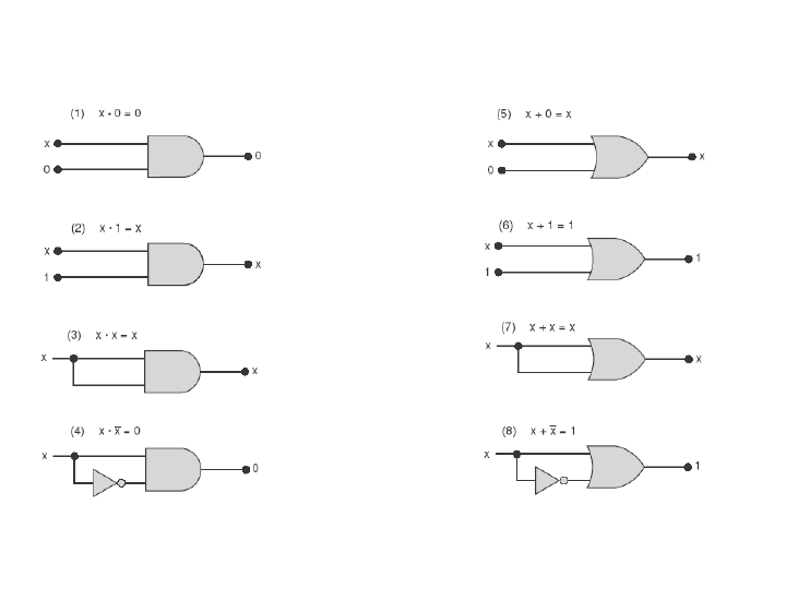 Teoremas para uma variável Teoremas para mais de uma variável 9 𝑥 + 𝑦 = 𝑦 + 𝑥 10 𝑥. 𝑦 = 𝑦. 𝑥 11 𝑥 + 𝑦 + 𝑧 = 𝑥 + 𝑦 + 𝑧 = 𝑥 + 𝑦 + z 12 𝑥. 𝑦. 𝑧 = (x.y).z = x.y.z 13a 𝑥. 𝑦 + 𝑧 = 𝑥. 𝑦 + 𝑥. 𝑧 13b (w+x).(y+z) = w.y + x.y +w.z+x.z 14 𝑥 + 𝑥. 𝑦 =x 15𝑎 𝑥 + 𝑥 . 𝑦 =x+y 15𝑏 𝑥 + 𝑥. 𝑦 = 𝑥 + 𝑦 Exemplo 1: • Simplifique a expressão 𝑦 = 𝐴. 𝐵 . 𝐷 + 𝐴. 𝐵 . 𝐷 Usando o teorema (13), coloca-se 𝐴. 𝐵 em evidência: 𝑦 = 𝐴. 𝐵 (𝐷 + 𝐷 ) Usando-se o teorema (8), o termo entre parêntesis vale 1. Assim: 𝑦 = 𝐴. 𝐵 . 1 Usando-se o teorema (2): 𝑦 = 𝐴. 𝐵 Exemplo 2: • Simplifique a expressão z = 𝐴 + 𝐵 . (𝐴 + 𝐵) Usando o teorema (13), expande-se a expressão: 𝑧 = 𝐴. 𝐴 + 𝐴 . 𝐵 + 𝐵. 𝐴 + 𝐵. 𝐵 Aplicando-se o teorema (4): 𝐴 . 𝐴 = 0 e 𝐵. 𝐵 = 𝐵 [teorema (3)] 𝑍 = 0 + 𝐴 . 𝐵 + 𝐵. 𝐴 + 𝐵 = 𝐴 . 𝐵 + 𝐴. 𝐵 + 𝐵 Colocando-se em evidência a variável B [teorema (13]): 𝑧 = 𝐵(𝐴 + 𝐴 + 1) Finalmente, usando-se os teoremas (2) e (6), temos: Z = B Exemplo 3: • Simplifique a expressão x = 𝐴. 𝐶. 𝐷 + 𝐴 . 𝐵. 𝐶. 𝐷 Colocando-se em evidência os termos comuns CD, temos: 𝑥 = 𝐶. 𝐷. (𝐴 + 𝐴 . 𝐵) Usando-se o teorema (15a): 𝑋 = 𝐶.𝐷. (𝐴 + 𝐴 . 𝐵) Ou: 𝑋 = 𝐴. 𝐶. 𝐷 + 𝐵. 𝐶. 𝐷 Teoremas de DeMorgan 16 (𝑥 + 𝑦) = 𝑥 . 𝑦 17 (𝑥. 𝑦) = 𝑥 + 𝑦 Exemplo 4: • Simplifique a expressão z = 𝐴 + 𝐶 . (𝐵 + 𝐷 ) Usando o teorema (17): 𝑧 = (𝐴 + 𝐶) + (𝐵 + 𝐷 ) Usando-se o teorema (16): 𝑍 = (𝐴 + 𝐶) + 𝐵 + 𝐷 = 𝐴 . 𝐶 + 𝐵 . 𝐷 Cancelando-se as inversões duplas: 𝑧 = 𝐴. 𝐶 + 𝐵 . 𝐷 Exercícios • Simplique: 1 - 𝑦 = 𝐴. 𝐶 + 𝐴. 𝐵. 𝐶 Use: (13) e (14) 2 - 𝑦 = 𝐴 . 𝐵 . 𝐶. 𝐷 + 𝐴 . 𝐵 . 𝐶 . 𝐷 Use: (13) e (8) 3 - 𝑦 = 𝐴 . 𝐷 + 𝐴. 𝐵. 𝐷 Use: (13) e (15b)