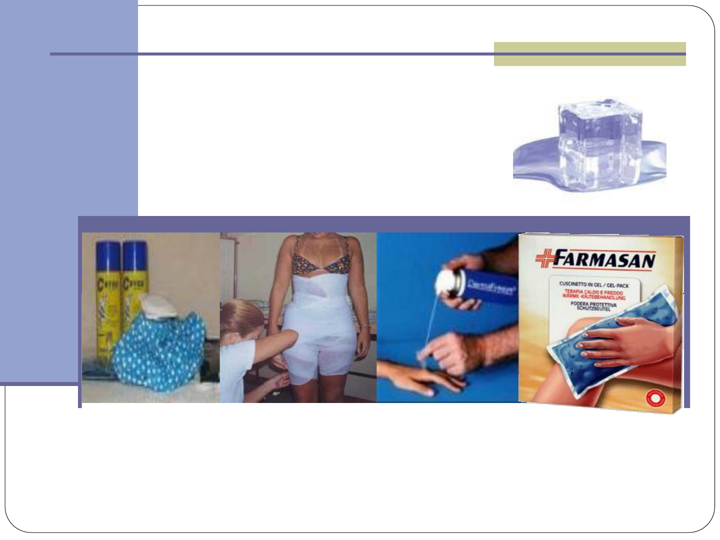 HIPOTERMOTERAPIA PROFESSOR GABRIEL MAURIZ CRÉDITOS DA AULA PROFESSORA VERUSKA CRONEMBERGER NOGUEIRA E PROFESSOR VAGNER SÁ CRIOTERAPIA É o uso do resfriamento local ou geral do corpo com fins terapêuticos(00C a 18,30C) Redução do fluxo sanguíneo local- 13,80C Analgesia- 14,40C Efeitos Hemodinâmicos Cameron, 2009 AÇÕES GERAIS E EFEITOS DA CRIOTERAPIA: Sensações da aplicação da crioterapia: formigamento, cócegas, frio, e perda da sensação tátil. Knight: dimunuição da dor, espasmo muscular, hipóxia secundária, espasticidade e edema. Nível vascular: vasoconstrição. Ação do gelo sobre o SNA (via simpática) ou atuação direta sobre os vasos. O sangue torna mais viscoso Diminuição da permeabilidade celular dor Diminuição significativa do metabolismo Restringe o extravasamento sanguíneo Diminui a intensidade da hemorragia Redução do edema Diminuição da dor Aumento da rigidez do tecido local ALÍVIO DA DOR: Decréscimo na transmissão das fibras de dor; Diminuição da excitabilidade nas terminações nervosas livres; Redução no metabolismo tecidual, aumentando limiar das fibras de dor; Ação contra irritante; Promove a liberação de endorfinas. o DICA CLÍNICA “Como a força muscular pode ser temporariamente influenciada pela crioterapia, o teste de força deve ser, de preferência, realizado antes do tratamento”. DIMINUIÇÃO DO ESPASMO MUSCULAR: Diminuição da entrada sensorial Via estimulação simpática, promovendo a diminuição na descarga via aferente durante o Quebrando o ciclo dor-espasmo-dor resfriamento EFEITOS NEUROMUSCULARES Queda na velocidade de condução nervosa Elevação do limiar de dor Diminuição da espasticidade Modificação da geração da força muscular os esclerose em placa) OUTROS EFEITOS DA CRIOTERAPIA: Pacientes espásticos (hemiplégicos, paraplégic , : apresentam diminuição do quadro álgico após aplicação da crioterapia Pacientes reumáticos: diminuição da atividade metabólica após a crio Hunter: aumento da rigidez e dificuldade de movimento com a diminuição da temperatura Músculo: diminuição do tônus e da espasticidade, após a crio Knight: “A vasoconstrição permanece por um período relativamente longo após a retirada do estímulo hipotérmico” (Vasodilatação induzida pela crio x redução parcial da vasoconstrição) O diâmetro do vaso não ultrapassa o inicial após o uso da crio Lentell et al: Usar a crio após a realização de alongamentos muscular, para resfriamento dos tecidos moles e minimização da dor DICA CLÍNICA “Quando o objetivo da intervenção for a vasodilatação, não se recomenda o uso da crioterapia, que não apresenta esse efeito de forma consistente”. TRAUMA AGUDO E INFLAMAÇÃO: Inflamação: Resposta corporal aos agente agressores. É sempre a mesma, independente da localização ou natureza do agente. Trauma: Ruptura dos vasos (hemorragia direta nos espaços intersticiais = hematoma). Liberação de histamina (vasodilatação e aumento da permeabilidade). Extravasamento de plasma e proteínas. Após o trauma: lesões de ligamentos, músculos, nervos. Presença de dor, espasmo, rubor, calor Edema: Após o trauma. vasos e PROTOCOLO GERAL FRIO COMPRESSÃO ELEVAÇÃO REPOUSO TÉCNICAS DE CRIOTERAPIA: Bandagem Fria: - - Patologias estéticas Reduzir a temperatura normal subcutâneos dos tecidos - Tempo: 20 a 40 minutos. TÉCNICAS DE CRIOTERAPIA: - - - - - Compressas Frias ou Segmentares: Cuba com água e gelo Temperatura: 0 a 4 graus centígrados Toalhas imersas Troca constante de toalhas Não se usa mais ultimamente 10 TÉCNICAS DE CRIOTERAPIA: - - - - - “Panquecas”: Tolha grande e gelo miúdo Gelo fica dentro da toalha (ou bolsa) Quadro álgico muito intenso (cervical e lombar). Atualmente: coluna, articulações... Tempo: 20 a 30 min. TÉCNICAS DE CRIOTERAPIA: - - - - Imersão: Cuba (ou algo maior) com água e gelo Temperatura: 0 a 4 graus Tempo: máximo 3 min. Repetição: 7 a 8 vezes 12 TÉCNICAS DE CRIOTERAPIA: - - - - - - Banho de Imersão: Banheira com + ou – 20 Kg de gelo e água Temperatura: 0 a 1 grau Imerso até o nível da cicatriz umbilical Tempo: 7 a 15 min. (se suportar) TÉCNICAS DE CRIOTERAPIA: - - - Criomassagem: Pedra de gelo com toalha ou luva para segurá-lo Escolha da região a ser tratada Sensações relatadas pelo pac.: # # # # Sensação Sensação Sensação Sensação de de de de frio queimação dor anestesia - - - Nem todos os pacs. têm essas sensações Tempo: 16 a 30 minutos Objetivo: Analgesia 13 berger Nogueira 14 BOLSAS TÉRMICAS MAIS UTILIZADAS: Veruska Cronem CUIDADOS ESPECIAIS COM A CRIOTERAPIA: Não Não Não molhar o local onde se expor ao sol foi feito a crioterapia cobrir a área tratada (dificultará a evaporação) Não realizar conjuntamente com outra conduta eletroterápica CONTRA INDICAÇÕES: Aplicação abdominal transtornos gástricos Afecções cutâneas na em indivíduos com ou intestinais (úlcera) área a ser tratada Após refeições (bandagens abdominais) Sobre área cardíaca Presença de tumores ou transtornos circulatórios sob a área a ser tratada Intolerância ao frio ou alergia aos gelo produtos utilizados e aos Criocinética Crioinibição Crioinibição Crioinibição Crioalongamento Crioimersão