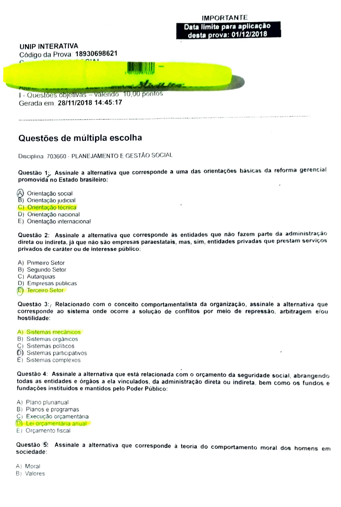 IMPORTANTE UNIP INTERATIVA Código da Prova 18930698621 ( ' ~ ~ s12!2 ~mm1◊Bt- tYitlfo§ q!,8.t ~, . hiM!< Gerada ern . 28/11/2018 14:45:17 -----------------------------··--------------------------· ~----· __ .. ----- ., . ---. -·· Questões de múltipla escolha D1sc1pl111a 7036G0 - PLANEJAMENTO E G ESTÃO SOCIAL Questão 1 · Assinale a alternativa que corresponde a uma das orientações hái.icas da reforma gerencial prornovidino Estado brasileiro: (À} Orienlaçao social ~ Orientação 1ud1c1a l C l 0 11 e11taç.'10 técnica D) Onentaç~o nacional E) Orienlaç~o internacional Questão 2: Assinale a alternativa que corresponde ás entidades que não fazem parte da administração direta ou indireta, já que nào são empresas paraestataia, mas, sim, entidades privadas que pregtam aervlç011 privados de caráter ou de intoreue público : A) Primeiro Setor B) Segundo Setor C) Autarquias D) Empresas publicas ~ Tercc_11 0 Setrn Questão 3: 1 Relacionado com o conceito comportamentaliata da organização, assinale a alternativa que corresponde ao sistema onde ocorre a solução de conflitos por meio de repressão, arbit ragem e/ou hostilidade: A l Sistemas 111<'t:J1111 n· . B) Sistemas orgânicos C ) Sistemas pol íticos õ) Sistemas part1c1pa t1vos E ) Sistemas complexos Questào 4: Assinale a alternativa que está relacionada com o orçamento da seguridade soc ial , abra ngendo todas as entidades e órgãos a ela vinculados, da administração direta ou indireta, bem como os fundos e fundações instituídos e mantidos pelo Poder Público : A; Plano plurianual B) Planos e programas C J Execuçao orcamentána f\ LL, ,, ça11 enta1 ,a a1 u·11 E ) Orçamento fiscal Questào '~ Assinale a alternativa que corresponde à teoria do comportamento moral dos homens em sociedade: A ) Mora l 8 ) Valores eJ Ética Dl Dest ino E) Organização Questão 6/ Das alternativas abaixo, qual não corresponde a uma das características das organizações civis sem fins lucrativos ligadas à administração pública? A ) F1nal1dade exclusivamente lucra tiva 63) A prática de valqres que motivam os indivíduos 'eí O esmero das qualidades ou virtudes sociais D) O aprimoramento das aptidões e habilidades profissionais E) O amadurecimento da cidadania Questão J;. Elaborar um sistema social que garanta emprego, segurança social e respeito a outras culturas e erradique a miséria, o preconceito e o massacre de populações oprimidas, possui relação com : @ Apelo humanitário B) Preservação da identidade cultural Cj Desenvolvimento sustentável D) Concretização da ação social E) Crença na formação de empreendedores Questão-'~ Assinale a alternativa que está relaciônada ao crescimento quantitativo e qualitativo das tarefas administrativas do Estado moderno: ' A) Economia solidária §J, Responsabilidade social O Burocracia moderna D) Legislação trabalhista E) Direitos trabalhistas Questão 9: Fayol partiu de uma abordagem sintética, global e universal da empresa e inaugurou uma abordagem anatômica e estrutural, superando, portanto, a abordagem analítica e concreta de Taylor. Nesse sentido, assinale a alternativa que não corresponde a uma das cinco funções do administrador, segundo Fayol: fi:l Prever 8Í Organizar C) Comandar D) Coordenar E) Pesquisar Questão 101/ Assinale a alternativa que não corresponde a uma das funções do gestor no interior da organizaçãó: A) Desenvolver os planos estratégicos ~ Desenvolve os planos operacionais C) Conceber as estruturas D) Estabelecer as regras EL Interpretar os objetivos propostos pela concorrência