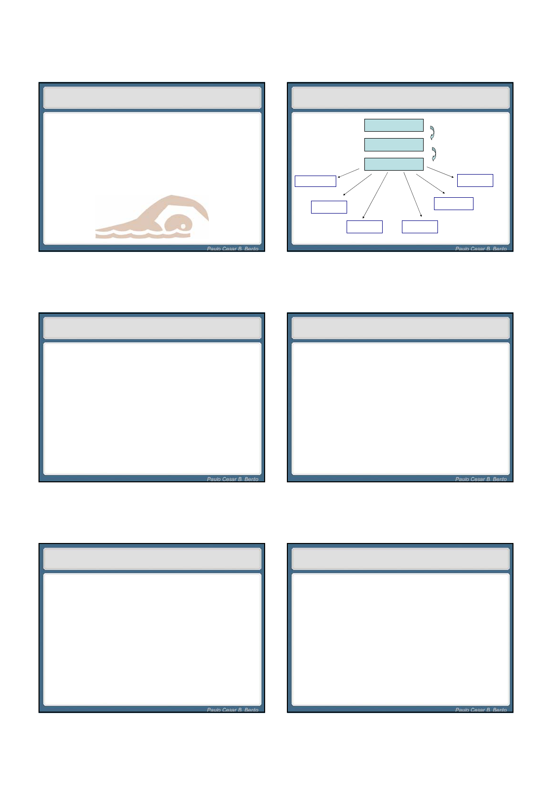 1 Modelos de periodização Módulo III Prescrição de Exercício Avaliação Modalidade Freqüência Duração Intensidade Precauções Progressão ACSM, Guidelines for exercise testing and prescription,(2006). Interpretação Prescrição Progressão I – Estágio Inicial II- Fase de Incremento III- Fase de Manutenção Progressão I – Estágio Inicial 1 – 6 semanas Aquecimento: 10-15 min / 10-15 Volta à calma Exercícios Aeróbios: (40 – 60% FCR);Intervalado 15 – 30 estímulo aeróbio 3 – 4 x semana Tolerância ao stress articular do exercício Progressão II – Incremento Aumento progressivo > 50 % - 80% FCR Duração: até 20 % aumento / semana até 20-30 min de exercício moderado a intenso. Intensidade: até 5% de aumento / 6 sessões (pelo menos) Treinamento intervalado com maior intensidade Progressão III- Fase de Manutenção Variedade de exercícios Manter motivação Incluir exercícios de caráter recreativo 2 Progressão Modelos de Periodização • Periodização Tradicional • Sistema A T R (cargas concentradas) • Esporte coletivo com longo período competitivo Modelo de Matveyev (1965) Transi- ção CompetiçãoPreparação Competições principais Pré- competitivo EspecíficaBásica I V 100% Resistência aeróbia F. Máxima Resistência de força Velocidade Resistência anaeróbia e mista Fase básica • Predomina o volume sobre a intensidade • Ênfase sobre a preparação física • Componente geral do treinamento • Visa preparar para o treino • Atleta não apresenta condição competitiva • Dura aproximação o dobro da específica Fase específica • Predomina a intensidade sobre o volume • Ênfase sobre a preparação técnico-tática • Trabalho com alto grau de especialização • Visa a preparar para a competição • Atleta apresenta condição competitiva incipiente Período de competição • Competição alvo • A carga de trabalho é reduzida em 20 à 30% • Predomina a preparação técnica e tática • Evita-se alterações bruscas de trabalho • Ênfase na preparação específica • Manter a condição até o final da fase competitiva deve ser o objetivo 3 Componentes do Macrociclo MACROCICLO I FASE BÁSICA ESPECÍFICA PRÉ-COMPETITIVA COMPETITIVA PERÍODO PREPARATÓRIO PERÓDO COMPETITIVO PERÍODO TRANSITÓRIO MESOCICLO I MESOCICLO II MESOCICLO III MESOCICLO IV MESOCICLO V 2A FEIRA 3A FEIRA 4A FEIRA 5A FEIRA 6A FEIRA SÁBADO DOMINGO SESSÃO: 4A FEIRA DATA: OBJETIVO: AQUECIMENTO: P. PRINCIPAL: PARTE CONCLUSIVA: Mesociclos • Representa o elemento da estrutura da preparação do desportista que inclui uma série de ciclos menores (microciclos), orientados para solução de tarefas, em certos períodos de treinamento. • Normalmente , utilizam-se de 04 a 05 microciclos (semanas) para compor o mesociclo. Classificação • Mesociclo de Incorporação • Mesociclo de Desenvolvimento • Mesociclo Estabilizador • Mesociclo Recuperativo • Mesociclo Pré-Competitivo • Mesociclo de Competição Mesociclo de Incorporação • Utilizado no início da temporada, é composto de 03 a 04 semanas com cargas moderadas para baixas. Incorporação 0% 10% 20% 30% 40% 50% 60% 70% Micro I Micro II Micro III Micro IV Mesociclo Desenvolvimento • Objetiva elevar os níveis de aptidão pelo uso de cargas altas, que vão obrigar o organismo a certa adaptação fisiológica. Segundo a distribuição das cargas, os mesociclos de desenvolvimento podem ser classificados em crescente/decrescente e em oscilatório. 4 Desenvolvimento (crescente/decrescente) 0% 10% 20% 30% 40% 50% 60% 70% 80% Micro I Micro II Micro III Micro IV 0% 10% 20% 30% 40% 50% 60% 70% 80% Micro I Micro II Micro III Micro IV Desenvolvimento (oscilatório) Mesociclo Estabilizador • O objetivo deste mesociclo é após uma série de cargas crescentes, estabilizá-las, permitindo, assim, que elas sejam assimiladas pelo organismo. • A sua estrutura é semelhante ao mesociclo de incorporação, ou seja, pode ser com cargas crescentes / decrescentes e ou oscilatórias. Mesociclo Recuperativo • Tem como objetivos permitir uma recuperação do organismo. As cargas são diminuídas, propiciando um estado de recuperação e um possível incremento da performance do atleta. • Este modelo é utilizado na chamada fase de polimento nas semanas que antecedem a competição principal. Mesociclo Pré-competitivo • Sua estrutura é em função das competições que serão realizadas, o objetivo é criar um modelo competitivo respeitando fatores que serão intervenientes na performance: altitude, horário, forma de disputa, etc. normalmente se organiza 04 a 06 semanas antes da competição. (pré- competitivo) Mesociclo de Competição • Representa a base do período competitivo, a estrutura e os conteúdos dele são determinados pela especificidade da modalidade desportiva, pelo sistema de preparação escolhido e pelo calendário de competições. 5 Microciclos • É a forma de organizar as influências do treinamento no organismo do desportista durante uma série de dias de treinamento consecutivos que variam de 03 a 14 dias. Baixa intensidadeRecuperativo Teste / competiçãoControle Forma de disputaCompetitivo Base no calendárioPré-competitivo 80% - 100 %Choque 60% - 80%Ordinário 40% - 60%Estabilizador Classificação dos microciclos Microciclo estabilizador 0% 10% 20% 30% 40% 50% 60% SEG TER QUA QUI SEX SÁB Microciclo ordinário 0% 10% 20% 30% 40% 50% 60% 70% 80% SEG TER QUA QUI SEX SÁB Microciclo choque 0% 10% 20% 30% 40% 50% 60% 70% 80% 90% 100% SEG TER QUA QUI SEX SÁB Microciclo pré-competição 0% 10% 20% 30% 40% 50% 60% 70% 80% 90% 100% SEG TER QUA QUI SEX SÁB DOM Competição 6 Microciclo com 1 jogo / semana Platonov, V. (1997) Microciclo c/ 2 jogos semanais Platonov, V. (1997) apud Gomes, (2002) Sessão de treinamento • É um processo pedagogicamente organizado, representa um sistema de exercícios que visam a solução de tarefas de um microcicl