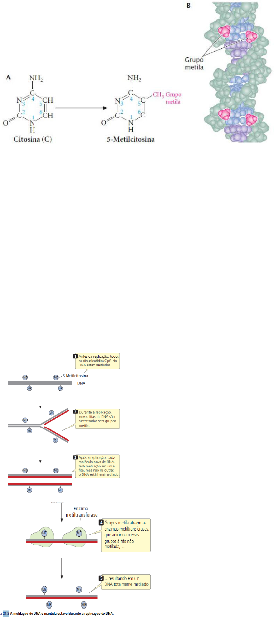 O que é epigenética? Atualmente, a epigenética se refere, de modo geral, aos fenótipos e processos que são transmitidos para outras células e às vezes, a futuras gerações, mas não são o resultado das diferenças na sequência de bases do DNA. Os efeitos epigenéticos são causados por mudanças na expressão gênica resultantes de alterações à estrutura de cromatina ou outros aspectos da estrutura do DNA, como a metilação do DNA. Uma definição de um traço epigenético é: um fenótipo herdado com estabilidade resultante de mudanças na cromatina sem alterações na sequência de DNA. Alguns pesquisadores ampliaram a definição de epigenética de modo a incluir qualquer alteração da estrutura da cromatina ou do DNA que afete a expressão gênica. Aqui, usaremos a epigenética para se referir às mudanças na expressão gênica e/ou em um fenótipo que são potencialmente herdados sem alteração da sequência de bases de DNA envolvida. Muitas mudanças epigenéticas são estáveis, persistindo por divisões celulares ou até gerações. Entretanto, as alterações epigenéticas também são potencialmente influenciadas por fatores ambientais. Por exemplo, foi demonstrado que o estresse ambiental altera a metilação do gene Bdnf do rato, que codifica um fator de crescimento importante no desenvolvimento do cérebro. A metilação do DNA foi correlacionada com a expressão de genes e os fenótipos produzidos. Vários processos moleculares levam a mudanças epigenéticas A epigenética altera a expressão dos genes; essas alterações são estáveis o suficiente para serem transmitidas por mitose (e, às vezes, por meiose), mas também podem ser alteradas. A maioria das evidências sugere que os efeitos genéticos são produzidos por mudanças físicas na estrutura da cromatina. Vamos analisar três tipos de mecanismos moleculares que alteram a estrutura da cromatina e sustentam muitos fenótipos epigenéticos: (1) mudanças nos padrões de metilação do DNA; (2) modificações químicas das proteínas histona e (3) moléculas RNA que afetam a estrutura da cromatina e a expressão gênica. Metilação do DNA O mecanismo mais bem compreendido da mudança epigenética é a metilação do DNA. A metilação do DNA refere-se ao acréscimo de grupos metila às bases de nucleotídios. Nos eucariotos, o tipo predominante de metilação de DNA é a metilação da citosina para produzir 5-metilcitosina (Figura 21.1 A). A metilação do DNA está associada à repressão da transcrição. Ela ocorre, com frequência, nas bases citosina que estão imediatamente adjacentes aos nucleotídios guanina, chamados de dinucleotídios CpG (em que p representa o grupo fosfato que conecta os nucleotídios C e G). Nos dinucleotídios CpG, os nucleotídios citosina nas duas fitas de DNA estão em diagonal um em relação ao outro. Em geral, ambas as bases citosina estão metiladas, então os grupos metila surgem em ambas as fitas de DNA, como apresentado a seguir e na Figura 21.1 B. Algumas regiões do DNA têm mais dinucleotídios CpG e são chamados de ilhas de CpG. Nas células de mamíferos, as ilhas de CpG estão localizadas nos promotores de genes ou próximas a estes. Essas ilhas de CpG não estão metiladas quando os genes são transcritos de forma ativa. Entretanto, a metilação das ilhas de CPG próximas de um gene leva a repressão da transcrição. As células reprimem e ativam os genes ao metilar e desmetilar as bases citosina. Enzimas chamadas DNA metiltransferases metilam DNA ao adicionar grupos metila a bases de citosina para criar 5-metilcitosina. Outras enzimas chamadas de desmetilases removem os grupos metila, convertendo 5-metilcitosina de volta para citosina Manutenção da metilação. O fato de que as mudanças epigenéticas são transmitidas para outras células e (às vezes) para gerações futuras significa que as mudanças na estrutura da cromatina associadas aos fenótipos epigenéticos têm de ser fielmente mantidas quando os cromossomos se replicarem. Como as mudanças epigenéticas são mantidas e replicadas durante o processo de divisão celular? A metilação de sequências CpG significa que duas bases citosina metiladas estão em diagonal uma da outra em fitas opostas. Antes da replicação, as bases citosina em ambas as fitas são metiladas (Figura 21.2). Imediatamente após a replicação semiconservativa, a base citosina na fita molde estará metilada, mas a base citosina na fita recém-replicada, não. Enzimas metiltransferases especiais reconhecem o estado hemimetilado dos dinucleotídios CpG e adicionam grupos metila a bases citosina não metiladas, criando duas novas moléculas de DNA totalmente metiladas. Dessa forma, o padrão de metilação do DNA é mantido durante a divisão celular. Repressão da transcrição pela metilação do DNA. Como a metilação do DNA suprime a expressão gênica? O grupo metila da 5-metilcitosina se localiza no sulco principal do DNA, que é reconhecido por muitas proteínas ligadoras de DNA. A localização do grupo metila no sulco principal inibe a ligação de fatores de transcrição e outras proteínas necessárias para que ocorra a transcrição. A 5-metilcitosina também atrai algumas proteínas que reprimem diretamente a transcrição. Além disso, a metilação do DNA atrai as enzimas histona desacetilase, que removem os grupos acetila das caudas das proteínas histona, alterando a estrutura da cromatina de forma que reprime a transcrição Modificações da histona As mudanças epigenéticas também podem ocorrer pela modificação das proteínas histona. Nas células eucarióticas, o DNA é complexado a proteínas histona na forma de nucleossomos, que são as unidades repetidas básicas da estrutura da cromatina. Já foram detectadas mais de 100 diferentes modificações pós-tradução das proteínas histona. Muitas dessas modificações ocorrem nas caudas com carga elétrica positiva das proteínas histona