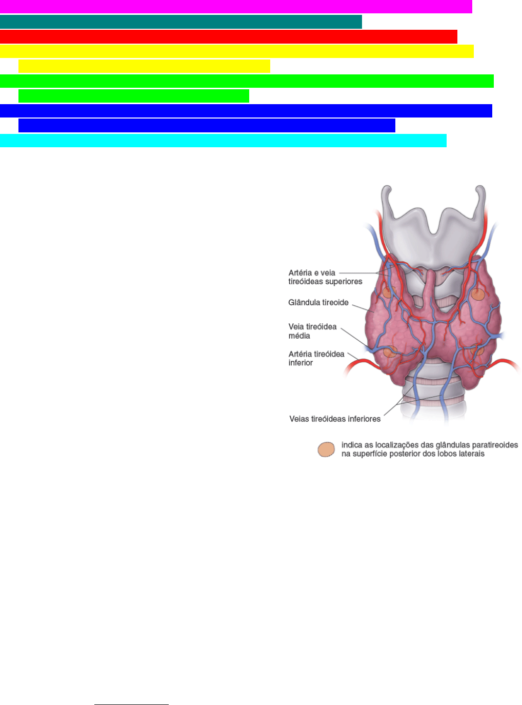 HISTOLOGIA DO SISTEMA ENDÓCRINO Apresentação e resolução dos objetivos de aprendizagem baseado no livro “HISTOLOGIA – Texto e Atlas: Correlações com Biologia Celular e Molecular” Ross & Pawlina Identificar através de fotomicrografias e/ou cortes histológicos a estrutura dos folículos da tireoide. Entender a importância das relações entre as faces celulares dos tireócitos. Identificar através de fotomicrografias e/ou cortes histológicos a estrutura geral da suprarrenal. Diferenciar as regiões: cortical e medular, a irrigação sanguínea e a função de cada camada celular. (Glomerular, fascicular e reticular) e células medulares. Identificar através de fotomicrografias e/ou cortes histológicos a estrutura geral do pâncreas endócrino, destacando a estrutura das ilhotas de Langerhans. Identificar através de fotomicrografias e/ou cortes histológicos a estrutura geral da hipófise, incluindo a diferenciação da neuro e adenohipófise reconhecendo os principais tipos celulares. Identificar através de fotomicrografias e/ou cortes histológicos a estrutura geral paratireoide. Glândula tireoide A glândula tireoide está localizada na região anterior do pescoço, adjacente à laringe e à traqueia consiste em dois grandes lobos laterais conectados por um istmo, uma fina faixa de tecido tireoidiano. Os dois lobos, medindo, cada um deles, aproximadamente 5 cm de comprimento, 2,5 cm de largura e 20 a 30 g de peso, estão situados em cada lado da laringe e parte superior da traqueia. O istmo cruza a superfície anterior da segunda e terceira cartilagens traqueais. Com frequência, um lobo piramidal estende-se superiormente a partir do istmo. A glândula é circundada por uma cápsula fina de tecido conjuntivo A glândula tireoide desenvolve-se a partir do revestimento endodérmico do assoalho da faringe primitiva. A glândula tireoide começa a se desenvolver durante a quarta semana de gestação, a partir de um primórdio que se origina como um espessamento endodérmico do assoalho da faringe primitiva. O primórdio cresce no sentido caudal e forma uma invaginação semelhante a um ducto, conhecida como ducto tireoglosso. Este desce pelo tecido do pescoço até o seu destino final, em frente da traqueia, onde se divide em dois lobos. Durante essa migração descendente, o ducto tireoglosso sofre atrofia, deixando um remanescente embriológico, o lobo piramidal da tireoide, que está presente em cerca de 40% da população. Em torno de 9 semanas de gestação, as células endodérmicas diferenciam-se em placas de células foliculares, que se dispõem em folículos. Em aproximadamente 14 semanas, os folículos bem desenvolvidos revestidos por células foliculares contêm coloide dentro do lúmen. Durante a sétima semana, as células epiteliais que revestem a invaginação das quartas bolsas faríngeas (branquiais) (algumas vezes denominada quintas bolsas faríngeas), conhecidas como corpos ultimobranquiais, começam a sua migração em direção à glândula tireoide em desenvolvimento e são incorporadas nos lobos laterais. Após a sua fusão com a tireoide, as células do corpo ultimobranquial se dispersam entre os folículos, dando origem às células parafoliculares, que se tornam incorporadas no epitélio folicular. O folículo tireoidiano constitui a unidade estrutural e funcional da glândula tireoide. Composição do folículo: Epitélio folicular (parede formada por epitélio simples cuboide ou colunar baixo) Coloide (massa gelatinosa que preenche o interior dos folículos, composta majoritariamente por tireoglobulinas) Obs.: As superfícies apicais das células foliculares estão em contato com o coloide, enquanto as superfícies basais repousam sobre uma lâmina basal típica. O epitélio folicular é composto de dois tipos de células: foliculares e células parafoliculares. Células foliculares (principais): produção dos hormônios tireoidianos T4 e T3 Células parafoliculares (céls. C): secretam calcitonina, um hormônio que regula o metabolismo do cálcio Obs.: observa-se uma extensa rede de capilares fenestrados, derivados das artérias tireóideas superior e inferior, circundando os folículos, responsável - junto com capilares linfáticos de fundo cego no TC interfolicular - por transportar os hormônios a partir da glândula A função da glândula tireoide é essencial para o crescimento e o desenvolvimento normais. O principal componente do coloide é a tireoglobulina, uma forma inativa de armazenamento dos hormônios tireoidianos. O principal componente do coloide é uma grande glicoproteína (660 kDa) iodada, denominada tireoglobulina, que contém cerca de 120 resíduos de tirosina. É uma forma inativa de armazenamento dos hormônios tireoidianos, e não um hormônio. A síntese de hormônio tireoidiano envolve diversas etapas. 1- O precursor da tireoglobulina é sintetizado no RER das células epiteliais foliculares. A tireoglobulina é glicosilada no complexo de Golgi após tradução no RER, antes de ser acondicionada em vesículas e secretada por exocitose no lúmen do folículo. 2- As células epiteliais foliculares transportam ativamente o iodeto do sangue para dentro de seu citoplasma, utilizando simportadores de sódio/iodeto (NIS; do inglês, sodium/iodide symporters) dependentes de ATPase. O NIS é uma proteína transmembrana de 87 kDa que medeia a captação ativa de iodeto na membrana basolateral das células epiteliais foliculares. Em seguida, os íons iodeto sofrem rápida difusão para a membrana celular apical. A partir desse local, os íons iodeto são transportados até o lúmen do folículo pelo transportador de iodeto/cloretode 86 kDa, denominado pendrina, que se localiza na membrana apical da célula. Em seguida, o iodeto é imediatamente oxidado a iodo, a forma ativa do iodeto. Esse processo ocorre no coloide e é catalisado pela enzima tireoide peroxidase (TPO) ligada à membrana. 3- Um ou dois átomos de iodo são 