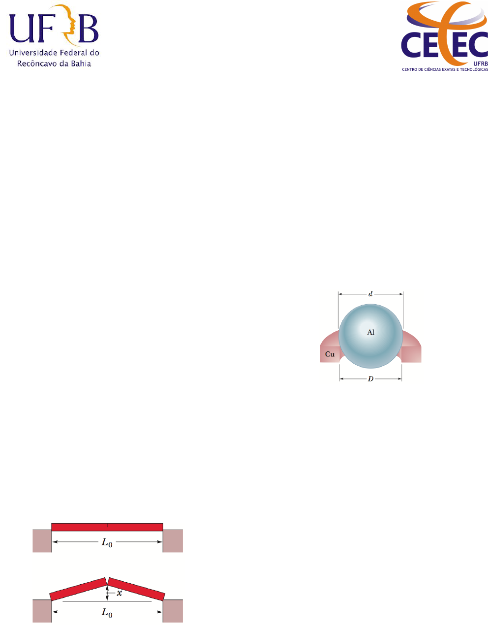 UFRB - Universidade Federal do Recôncavo da Bahia CETEC - Centro de Ciências Exatas e Tecnológicas CET099 - Física Geral e Experimental II Lista de Problemas Temperatura e Calor Questão 1 Em que temperatura a leitura na escala Fahrenheit é igual (a) duas vezes a leitura na escala Celsius e (b) a metade da leitura na escala Celsius. Questão 2 Em uma escala linear de temperatura X, a água congela a −125, 0◦X e evapora a 375, 0◦X. Em uma escala linear de temperatura Y, a água congela a −70, 00◦Y e evapora a −30, 00◦Y. Uma temperatura de 50, 00◦Y corresponde a que temperatura na escala X? Questão 3 Determine a variação de volume de uma esfera de alumínio com um raio inicial de 10 cm quando a esfera é aquecida de 0, 0◦C para 100◦C. Questão 4 Como resultado de um aumento de temperatura de 32◦C, uma barra com rachadura no centro dobra para cima (Fig. a seguir). Se a distância fixa L0 é 3, 77 m e o coeficiente de dilatação linear da barra é 25×10−6/◦C, determine a altura x da barra. Questão 5 A 20◦C, um cubo de bronze tem 30 cm de aresta. Qual é o aumento da área superficial do cubo quando ele é aquecido de 20◦C para 75◦C? Questão 6 Um anel de cobre de 20, 0 g a 0, 000◦C tem um diâmetro in- terno D = 2, 54000 cm. Uma esfera de alumínio a 100, 0◦C tem um diâmetro d = 2, 54508 cm. A esfera é colocada acima do anel (Fig. a seguir) até que os dois atinjam o equilí- brio térmico, sem perda de calor para o ambiente. A esfera se ajusta exatamente ao anel na temperatura de equilíbrio. Qual é a massa da esfera? Questão 7 Quando a temperatura de uma moeda de cobre é aumen- tada de 100◦C, o diâmetro aumenta de 0, 18%. Com pre- cisão de dois algarismos significativos, determine o aumento percentual (a) da área, (b) da espessura e (c) do volume. (d) Calcule o coeficiente de dilatação linear da moeda. Questão 8 Duas amostras A e B, estão a diferentes temperaturas quando são colocadas em contato em um recipiente termi- camente isolado até entrarem em equilíbrio térmico. A Fig. (a) a seguir mostra as temperaturas T das duas amostras em função do tempo t. A amostra A tem uma massa de 5, 0 kg; a amostra B tem uma massa de 1, 5 kg. A Fig. (b) é um gráfico do material da amostra B que indica a variação de temperatura ∆T que o material sofre quando recebe uma energia Q na forma de calor. A variação ∆T está plotada em função da energia Q por unidade de massa do material, e a escala vertical é definida por ∆Ts = 4, 0◦C. Qual é o calor específico da amostra A? Questão 9 Uma xícara de alumínio de volume 100 cm3 está cheia de glicerina a 22◦C. Que volume de glicerina é derramado se a temperatura da glicerina e da xícara aumenta para 28◦C? Questão 10 Um pequeno aquecedor elétrico de imersão é usado para esquentar 100 g de água, com o objetivo de preparar uma xícara de café solúvel. Trata-se de um aquecedor de “200 watts” (esta é a taxa de conversão de energia elétrica em energia térmica). Calcule o tempo necessário para aquecer a água de 23◦C para 100◦C, desprezando as perdas de calor. Questão 11 Que massa de vapor a 100◦C deve ser misturada com 150 g de gelo no ponto de fusão, em um recipiente isolado termi- camente, para produzir água a 50◦C? Questão 12 Uma garrafa térmica contém 130 cm3 de café a 80, 0◦C. Um cubo de gelo de 12, 0 g à temperatura de fusão é usado para esfriar o café. De quantos graus o café esfria depois que todo o gelo derrete e o equilíbrio térmico é atingido? Trate o café como se fosse água pura e despreze as trocas de energia com o ambiente. Questão 13 O álcool etílico tem ponto de ebulição de 78, 0◦C e ponto de congelamento de −114◦C. Quanta energia deve ser removida de 0, 510 kg de álcool etílico que está inicialmente na forma de gás a 78, 0◦C para que ele se torne um sólido a −114◦C? Questão 14 Calcule o calor específico de um metal a partir dos dados a seguir. Um recipiente feito de metal tem uma massa de 3, 6 kg e contém 14 kg de água. Um pedaço de 1, 8 kg do me- tal, inicialmente à temperatura de 180◦C, é mergulhado na água. O recipiente e a água estão inicialmente a 16, 0◦C, e a temperatura final do sistema é 18, 0◦C. Questão 15 Na figura (a) a seguir, duas barras retangulares iguais de um mesmo metal são soldadas nas extremidades e mantidas a uma temperatura T1 = 0◦C do lado esquerdo e uma tem- peratura T2 = 100◦C do lado direito. Em 2, 0 min, 10 J são conduzidos a uma taxa constante do lado direito para o lado esquerdo. Que tempo seria necessário para conduzir 10 J se as placas fossem soldadas lado a lado como na figura (b)? Questão 16 (a) Qual é a taxa de perda de emergia em watts por metro quadrado através de uma janela de vidro de 3, 0 mm de es- pessura se a temperatura externa é −20◦F e a temperatura interna é +72◦F? (b) Uma janela para tempestades, feita com a mesma espessura de vidro, é instalada do lado de fora da primeira, com um espaço de 7, 5 cm entre as duas janelas. Qual é a nova taxa de perda de energia se a condução é o único mecanismo importante de perda de energia? Questão 17 A figura a seguir mostra uma parede feita de quatro cama- das, de condutividade térmica k1 = 0, 060 W/m ·K, k3 = 0, 040 W/m ·K e k4 = 0, 12 W/m · K (k2 não é conhecida). As espessuras das camadas são L1 = 1, 5 cm, L3 = 2, 8 cm e L4 = 3, 5 cm (L2 não é conhecida). As temperaturas co- nhecidas são T1 = 30◦C, T12 = 25◦C e T4 = −10◦C. A transferência de energia está no regime estacionário. Qual é o valor da temperatura T34? Questão 18 Uma barra de aço de 10, 0 cm de comprimento é soldada pela extremidade a uma barra de cobre de 20, 0 cm de compri- mento. As duas barras são perfeitamente isoladas nas suas partes laterais. A seção reta das duas barras é um quadrado de lado igual a 2, 0 cm. A extremidade livre da barra de aço é mantida a 100◦C e a extre