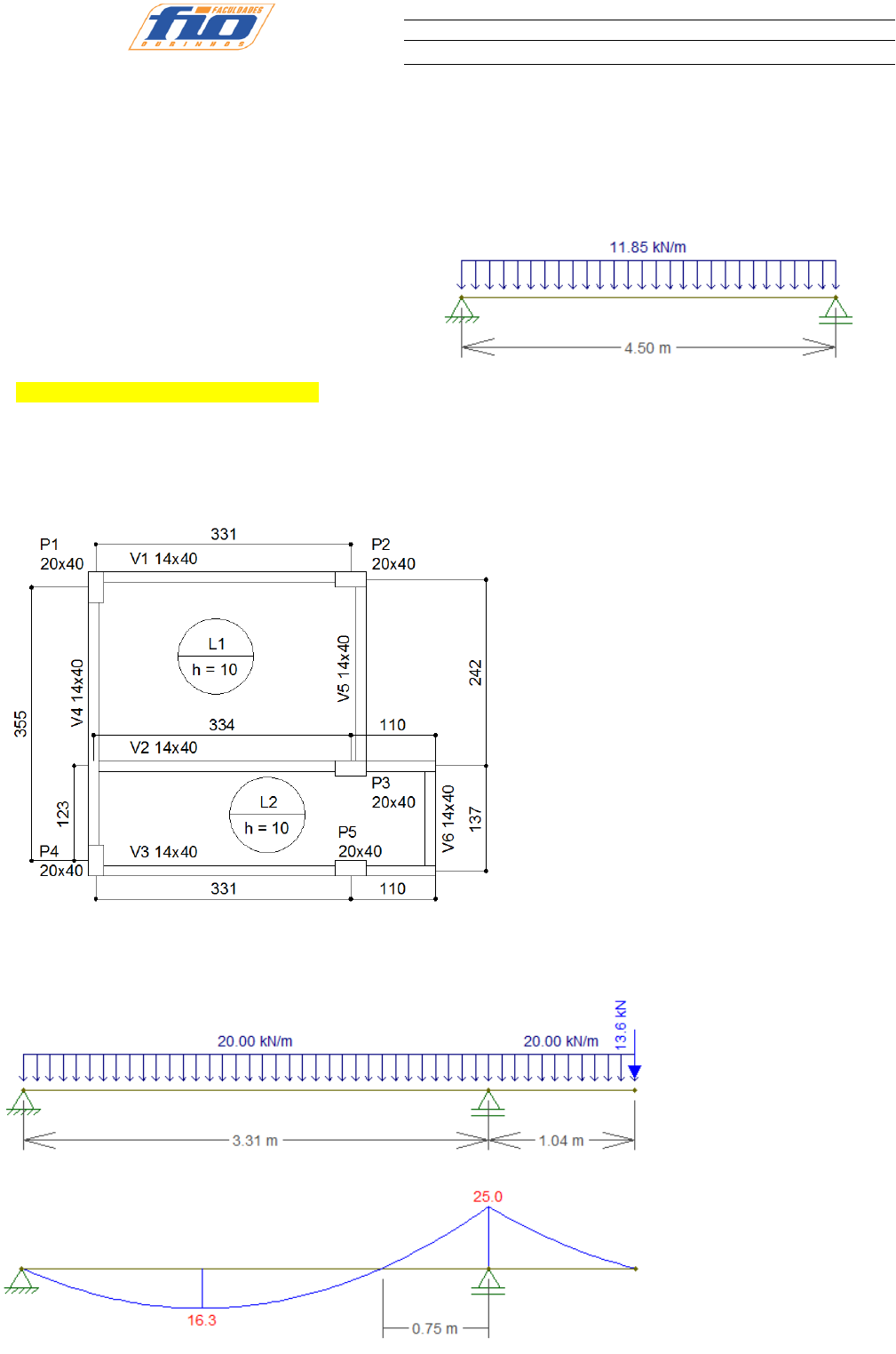 Disciplina: Estruturas de Concreto Armado I Assunto: Lista de Exercícios 1 - Cálculo de Armaduras Simples Data : 1o Semestre/ 2018 Prof: Luiz Gustavo Cruz Trindade _______________________________________________________________________________________ 1) Dada a viga abaixo, pede-se o cálculo das armaduras de flexão para projeto e o detalhamento da seção transversal. 2) Dada a planta de forma, o esquema estático das vigas e seus diagramas de momento fletor, pede-se o cálculo das armaduras de flexão para projeto e o detalhamento da seção transversal. V3: Mk (KN.m) Dados: Seção: 15x40 Pk = 11,85kN/m fck = 25Mpa Aço: CA-50 d = 35cm c = 2,5cm ∅𝑒𝑠𝑡𝑟𝑖𝑏𝑜 = 6,3𝑚𝑚 brita 1: 19mm As = 3,00cm² / As,proj = 4∅10 = 3,20cm² Dados: Seções indicadas na planta fck = 25Mpa Aço: CA-50 d = 35cm c = 3cm ∅𝑒𝑠𝑡𝑟𝑖𝑏𝑜 = 5𝑚𝑚 Brita 1: 19mm Disciplina: Estruturas de Concreto Armado I Assunto: Lista de Exercícios 1 - Cálculo de Armaduras Simples Data : 1o Semestre/ 2018 Prof: Luiz Gustavo Cruz Trindade _______________________________________________________________________________________ V6: V4: Mk (KN.m) V1: Mk (KN.m) Disciplina: Estruturas de Concreto Armado I Assunto: Lista de Exercícios 1 - Cálculo de Armaduras Simples Data : 1o Semestre/ 2018 Prof: Luiz Gustavo Cruz Trindade _______________________________________________________________________________________ Disciplina: Estruturas de Concreto Armado I Assunto: Lista de Exercícios 1 - Cálculo de Armaduras Simples Data : 1o Semestre/ 2018 Prof: Luiz Gustavo Cruz Trindade _______________________________________________________________________________________ 3) Dada a planta de forma, dimensionar e detalhar as vigas V1 e V2, para suportar o peso de uma laje de cobertura, cotas em cm. As + = 4,15cm² As - = 0,55cm² As,proj + = 4∅12,5 = 4,91cm² / 6∅10 = 4,71cm² As,proj - = 2∅10 = 1,57cm² As,mín = 1,50cm² As, máx = 40cm² 4) Dimensionar a viga V2 da planta de forma e verificar se é possível posicionar uma tubulação de 50mm na posição indicada, cotas em cm. fck = 20Mpa Aço CA-50 c = 3cm d = 45cm ∅𝑒𝑠𝑡 = 5mm Brita 1 = 19mm Laje: Peso Próprio: 220kgf/m² Revestimento: 100kgf/m² Carga Acidental: 50kgf/m² Vigas: 𝛾𝑎𝑙𝑣𝑒𝑛𝑎𝑟𝑖𝑎 = 1300kgf/m³ Altura platibanda = 1,20m Espessura parede = 25cm Pilares: seção 20x20 Pé-direito: 280cm fck = 30Mpa Aço CA-50 c = 3cm d = 40cm ∅𝑒𝑠𝑡 = 5mm Brita 1 = 19mm Laje: Peso Próprio: 217kgf/m² Revestimento: 100kgf/m² Carga Acidental: 150kgf/m² Alvenaria: 𝛾𝑎𝑙𝑣𝑒𝑛𝑎𝑟𝑖𝑎 = 1300kgf/m³ Altura alvenaria = 3,00m Espessura parede = 15cm Pilares: seção 20x40 Pé-direito: 300cm Disciplina: Estruturas de Concreto Armado I Assunto: Lista de Exercícios 1 - Cálculo de Armaduras Simples Data : 1o Semestre/ 2018 Prof: Luiz Gustavo Cruz Trindade _______________________________________________________________________________________ 5) Dimensionar e detalhar as vigas V2 e V4. Cotas em cm. V4 As + = 2,42cm² As,proj + = 2∅12,5 = 2,45cm² As,mín = 1,24cm² As, máx = 33cm² V2: As + = 8,25cm² As - = 1,92cm² As,proj + = 7∅12,5 = 8,59cm² As,proj - = 2∅12,5 = 2,45cm² As,mín = 2,06cm² As, máx = 55cm² fck = 20Mpa Aço CA-50 c = 2,5cm d = 50cm ∅𝑒𝑠𝑡 = 5mm Brita 1 = 19mm Laje: Peso Próprio: 257kgf/m² Revestimento: 115kgf/m² Carga Acidental: 300kgf/m² Alvenaria: 𝛾𝑎𝑙𝑣𝑒𝑛𝑎𝑟𝑖𝑎 = 1300kgf/m³ Altura alvenaria = 3,00m Esp. Parede interna = 15cm Esp. Parede externa = 25cm Pilares: seção 25x25 Pé-direito: 300cm Disciplina: Estruturas de Concreto Armado I Assunto: Lista de Exercícios 1 - Cálculo de Armaduras Simples Data : 1o Semestre/ 2018 Prof: Luiz Gustavo Cruz Trindade _______________________________________________________________________________________ 6) Obter os carregamentos e o esquema estático das vigas da planta de forma, cotas em cm. V1=V3 7) Dimensionar as vigas V1 e V2 para suportar o peso de 3 caixas d’água sobre a laje. fck = 25Mpa Aço CA-50 c = 2,5cm d = 45cm ∅𝑒𝑠𝑡 = 5mm Brita 1 = 19mm Laje: Peso Próprio: 211kgf/m² Revestimento: 140kgf/m² 𝛾á𝑔𝑢𝑎 = 1000kgf/m³ Capacidade dos tanques: 1000l Peso de cada tanque: 136kg Vigas: 𝛾𝑎𝑙𝑣𝑒𝑛𝑎𝑟𝑖𝑎 = 1300kgf/m³ Altura parede = 3m Espessura parede = 15cm Pilares: seção 20x20 Comprimento: 3m Laje: Peso Próprio: 150kgf/m² Revestimento: 100kgf/m² Carga Acidental: 200kgf/m² Alvenaria: 𝛾𝑎𝑙𝑣𝑒𝑛𝑎𝑟𝑖𝑎 = 1300kgf/m³ Altura alvenaria = 3,00m Esp. Parede interna = 15cm Esp. Parede externa = 25cm Vigas: Internas: 14x50 Externas: 19x50 Pilares: extremidade: 19x19 canto: 19x55 comprimento: 3m As + = 4,29cm² As - = 1,12cm² As,proj + = 4∅12,5 = 4,91cm² As,proj - = 2∅10 = 1,57cm² As,mín = 1,01cm² As, máx = 27cm² Disciplina: Estruturas de Concreto Armado I Assunto: Lista de Exercícios 1 - Cálculo de Armaduras Simples Data : 1o Semestre/ 2018 Prof: Luiz Gustavo Cruz Trindade _______________________________________________________________________________________ 8) Seja a viga abaixo de uma estrutura já concluída, projeta um carregamento pk = 8kN/m e armada a flexão com 3Ф12,5mm. Pergunta-se qual o carregamento de serviço que poderá ser acrescido ao elemento, em função de uma reforma na edificação? Resp: 10,48KN/m. Obs: Ler o item 3.7.5 do Capítulo 3 do livro “Cálculo e Detalhamento de Estruturas Usuais de Concreto Armado” do autor Roberto Chust de Carvalho. Dados: fck = 25Mpa brita: 19mm ∅𝑒𝑠𝑡𝑟𝑖𝑏𝑜 = 5𝑚𝑚 Aço: CA-50 Seção (15x40) c = 3cm