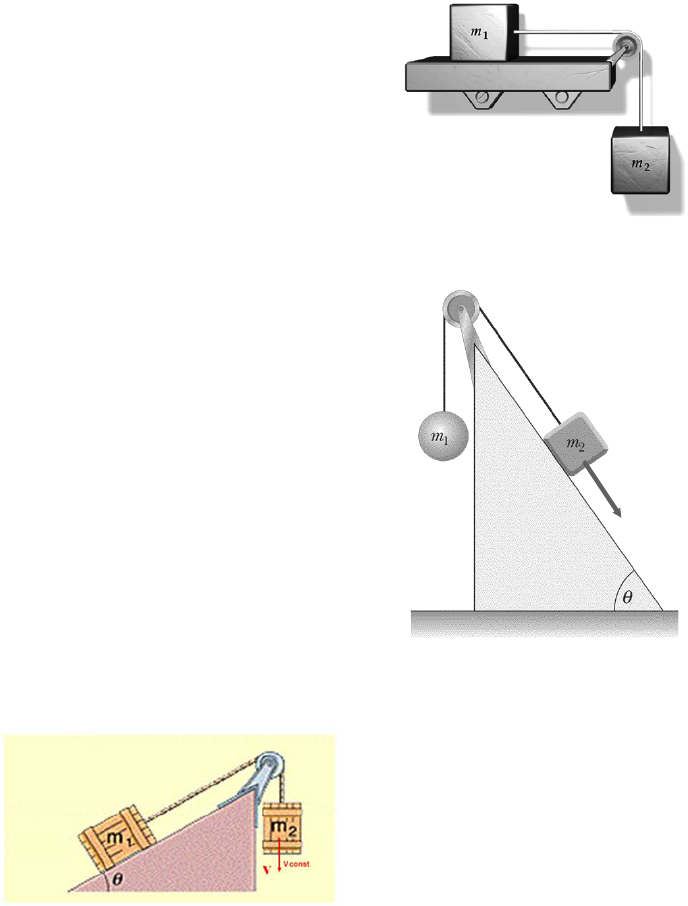 Universidade Tecnológica Federal do Paraná UTFPR Disciplina de Física I Prof. Nelson Elias 19ª Lista de Exercícios: Cap. 6 Força e Movimento II - Atrito. Aluno: ________________________________________________ Turma: _______ Data: ______/_____/______. 1) Um armário de quarto com massa de 45 kg, incluindo gavetas e roupas, está em repouso sobre o assoalho. (a) Se o coeficiente de atrito estático entre o móvel e o chão for 0,45, qual a menor força horizontal que uma pessoa deverá aplicar sobre o armário para colocá-lo em movimento? (b) Se as gavetas e as roupas, que têm 17 kg de massa, forem removidas antes do armário ser empurrado, qual a nova força mínima? Resp. a) F = 198,45 N, b) F = 123,48 N. 2) Considere que o bloco m1 = 5 kg, está em movimento sobre a mesa, o bloco m2 tem massa de m2 = 10 kg, sabendo que o coeficiente de atrito cinético entre o bloco m1 e a mesa é mc = 0,25. a) Qual a aceleração do sistema e qual a tensão na corda durante o movimento. (o atrito entre a corda e polia é desprezível). b) Se por algum processo conseguirmos eliminar o atrito entre m1 e a mesa qual seria a aceleração dos blocos ? Resp. a) a = 5,71 m/s2 e T = 40,8 N b) a = 6,5 m/s2 3) Considere a figura abaixo onde a bola de chumbo possui massa m1 = 5 kg e o bloco massa de m2 = 7 kg uma força F = 60 N é aplicada a m2 paralela ao plano inclinado cujo ângulo é θ = 63º . A força F puxa o corpo m2 para baixo. Entre o corpo m2 e o plano inclinado existe atrito com μk = 0,25. F Determine: a) Qual a força de atrito entre m2 e o plano inclinado? b) A aceleração do sistema. c) A tensão na corda que une m1 e m2. Resp.: a) fk = 7,78 N b) a = 5,36 m/s2 e c) T = 75,8N 4) Os blocos estão em movimento com velocidade constante. m1=m2=14 Kg; θ = 300 - Calcule: fk e μk. 5) Uma pessoa empurra horizontalmente uma caixa de 55 kg, para movê-la sobre o chão, com uma força de 220 N. O coeficiente de atrito cinético é 0,35. (a) Qual o módulo da força de atrito ? (b) Qual a aceleração da caixa ? Resp. a) FA = 188,65N, b) a = 0,57 m/s2. 6)Calcular a aceleração de um bloco que desce por um plano inclinado 35º com a horizontal, sabendo que o coeficiente de atrito cinético entre o bloco e o plano é 0,35. Resp. a = 2,81 m/s2 7) Uma caixa de 68 kg é puxada pelo chão por uma corda que faz um ângulo de 15º acima da horizontal. (a) Se o coeficiente de atrito estático é 0,50, qual a tensão mínima necessária para iniciar o movimento da caixa? (b) Se μk = 0,35. qual a aceleração inicial ? Resp.: a) T = 302,9 N, b) a = 1,29 m/s2. 8) O bloco B da figura abaixo pesa 711 N. o coeficiente de atrito estático entre o bloco e a superfície da mesa é de 0,25; suponha que o cabo entre B e o nó seja horizontal. Determine o peso máximo do bloco A, para o qual o sistema ficará em equilíbrio. Resp. PA = 102,7 N. 30º B A 9) Considere que o bloco m1 está em movimento sobre a mesa e que o valor da massa é m1 = 7 kg, o bloco m2 tem massa de m2 = 5 kg, sabendo que o coeficiente de atrito cinético entre o bloco m1 e a mesa é μk = 0,54. 1 a) Qual a tensão na corda durante o movimento. (o atrito entre a corda e polia é desprezível). b) Suponha que o valor da massa m2 foi escolhido de modo que o a massa m1 está na iminência 2 de movimento. Determine o coeficiente de atrito estático μe entre o bloco m1 e a mesa, neste caso. Resp.: a) T = 44 N, b) μe = 0,71. 10) Uma pessoa arrasta um bloco de mármore de massa igual a m = 50,0 kg que está em repouso em um plano horizontal, exercendo uma força F = 400 N que faz um ângulo de θ = 30º com a horizontal. Se o coeficiente de atrito cinético entre o bloco e a superfície for μk = 0,3, determine a velocidade do bloco 3 s após ter sido posto em movimento. Resp. a = 5,19 m/s2 e v(3s) = 15,6 m/s 11) Um bloco de massa m1 = 2,0 kg e o bloco 2 de massa m2 = 1,0 kg estão ligados por um fio de massa desprezível. O bloco 2 é empurrado por uma força F de módulo 20 N formando um ângulo θ = 35º conforme a figura abaixo indica. O coeficiente de atrito cinético entre cada bloco e a superfície é μk = 0,2. Qual a tração no fio? Resp.: T = 9,35 N 12) Um bloco de massa m = 2,00 kg é solto do repouso de uma altura h = 0,5 m acima da superfície de uma mesa, do alto de um plano inclinado com θ = 30º como mostrado na figura abaixo. O plano inclinado sem atrito está fixo sobre a mesa que tem altura de H = 2,0 m. a) Qual a velocidade do bloco quando ele deixa o plano inclinado? b) A que distância “R” da mesa o bloco vai atingir o solo? v = 3,13 m/s R = 1,3 m Resp. a = 5,19 m/s2 e v(3s) = 15,6 m/s