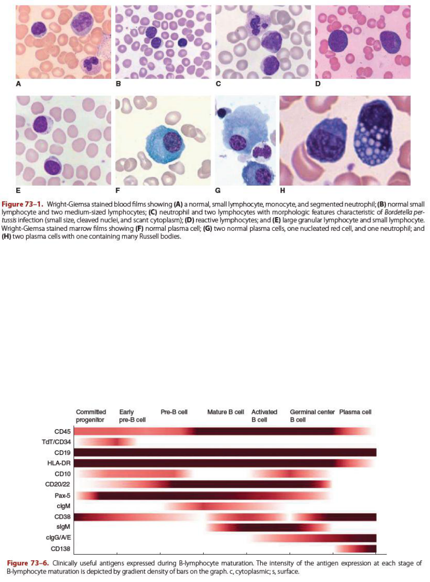 AULA HEMATOLOGIA 6 LINFÓCITOS Citoplasma muito azul: indica intensa produção de proteína. Núcleo mais redondo Não tem como diferenciar linfócito T de linfócito B Cluster de Diferenciação (CD): conjunto de proteínas expressas na superfície (moléculas marcadoras de superfície) que são exclusivas daquela célula. É como se fosse a impressão digital, e possibilita a identificação e diferenciação de células jovens ou velhas. É feita através de um ensaio imunológico baseado no conjunto de proteínas. É importante na identificação de doenças malignas clonais que fazem com que todas a células percam diferenciação, fiquem muito parecidas (linfomas e leucemias). A partir de um painel de antígenos, é possível identificar qual linfócito é. Esse conjunto de proteínas recebe um número. Ex: linfócitos T CD4. As células podem expressar diversos conjuntos de CD, porém existem CD específicos que permitem diferenciar células que contenham CD iguais. Portanto, é necessário utilizar o perfil de CD para determinar o tipo celular que está sendo observado. - Linfopoiese: Célula pluripotente célula multipotente progenitor linfóide comum (linfócitos, NK cells, células dendríticas) Diferenciação: No timo: linfócitos T e NK cells Na medula óssea: linfócitos B, NK cells e células dendríticas - Evolução: Progenitor linfoide comum Linfoblasto Pró-linfócito Linfócito médio (um pouco mais de citoplasma) Linfócito pequeno (quase sem citoplasma) A leucemia pode atingir as células em qualquer ponto. Porém, quando acomete as células iniciais da diferenciação, o resto acaba sendo comprometido e não é produzido. Então, a pessoa fica com um monte de células indiferenciadas acumulada que perdem a capacidade de diferenciação (leucemia linfoblástica aguda) e a inibição por contato (percebe quando o tecido está cheio e para de se dividir) - Diferenciação: Para diferenciação de linfócitos T e linfócitos B, é necessário acionar uma série de fatores de transcrição: IKAROS, PU 1 e E2A: fatores de transcrição COMUNS a todos os linfócitos PAX 5 e EBF: linfócitos B GATA-3 e NOCTH: linfócitos T - Câncer: Muitas doenças podem acometer esse sistema, como câncer. Existem neoplasias de células B e de células T. No timo, podem ter neoplasia de células mais indiferenciadas (linfomas e leucemias de células precursoras); depois que está mais madura, pode ser linfoma periférico de células T. Esses são os mais frequentes em células T. Já nas células B, as possibilidades aumentam: dentro da medula óssea, no processo de diferenciação, tem linfoma ou leucemia de células precursoras, linfoma de pequenos linfócitos (tratamento parecido com leucemia linfocítica crônica), mieloma múltiplo (acomete mais idosos, leucemia nos plasmócitos que faz com que haja muita produção de muito anticorpos). Considerando o linfonodo: linfomas de células do manto, linfoma folicular (centro germinativo), linfoma de Hodgkin e não Hodgkin, etc. Cada uma dessas leucemias, vai ter um perfil de marcadores. E para isso utiliza o cluster de diferenciação, para auxiliar o diagnóstico.