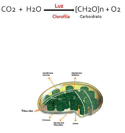 Fotossíntese A atividade fotossintética das plantas e de cianobactérias promove a conversão e armazenamento de energia solar em moléculas orgânicas ricas em energia, a partir de moléculas inorgânicas simples, como o CO2 e o H2O. Somente esses seres são capazes de fazer isso, aumentando assim a energia livre disponível para os seres vivos como um todo. A reação global da fotossíntese: As unidades ou pacotes de energia da luz são denominados fótons. A energia carregada por um fóton é denominada quantum (plural = quanta). Em seres vivos, a energia pode ser armazenada nas ligações das moléculas dos carboidratos (energia química). A conversão de gás carbônico e água em carboidratos se dá pela absorção de energia radiante pelos pigmentos fotossintéticos existentes dentro de organelas complexas chamadas cloroplastos. O pigmento da clorofila se encontra dentro dos tilacoides. A fotossíntese transforma moléculas oxidadas, com baixo conteúdo energético em moléculas com elevado poder redutor e conteúdo de energia. Nesse processo a luz excita elétrons para níveis mais energéticos, caracterizando um processo termodinâmico não espontâneo. O O2 eliminado no processo é somente uma consequência desse processo. Outras organelas complexas muito importantes, as mitocôndrias, degradam os carboidratos, transferindo a energia anteriormente armazenada nas ligações de carbono para moléculas de ATP (adenosina trifosfato). O ciclo se completa com a respiração, consumindo O2 e produzindo CO2 e água. Em cada transformação, parte da energia é dissipada para o ambiente na forma de calor. Com isso o fluxo de energia biológica tem um sentido único e só podendo ter continuidade se houver influxo permanente de energia solar. Processo de Oxi-Redução Tanto a fotossíntese quanto a respiração celular, são processos de reações de redução e oxidação. A redução é a transferência de um elétron de uma molécula doadora (D) para uma molécula receptora (R). A molécula doadora foi oxidada e a molécula receptora reduzida. A reação primária da fotossíntese é uma reação de transferência de elétrons entre uma forma especial de clorofila e uma molécula receptora específica. Ao receberem luz, os elétrons das moléculas de clorofila são excitados. Dessa forma as moléculas são oxidadas e os elétrons são transferidos para carregadores do processo fotoquímico, gerando assim energia química. As moléculas oxidadas são automaticamente reduzidas por elétrons tendo sua neutralidade restaurada. Na maioria das vezes a molécula doadora de elétrons é a água. Percebe-se que há um acúmulo da quantidade de H + dentro dos cloroplastos. Esse fato é importante, pois esse produto é responsável pela força motriz para a síntese das ligações de alta energia do ATP. Fotossíntese: Um processo em duas etapas As reações responsáveis pela transformação da energia solar em energia química correspondem a etapa fotoquímica. A etapa seguinte é conhecida como etapa bioquímica. Etapa fotoquímica Etapa bioquímica Os carboidratos produzidos na Etapa bioquímica, quando entram em contato com NO3 + , NH4 - e outros sais inorgânicos proveniente do solo, acabam por produzir importantes aminoácidos, lipídios, pigmentos, celulose, proteínas, ácidos nucléicos, hormônios, dentre muitos outros compostos. Pigmentos Os pigmentos fotossintéticos mais importantes são as clorofilas, que são encontradas dentro dos cloroplastos. Existe mais de um tipo de clorofila. As clorofilas possuem grandes estruturas carbônicas, bastante complexas. A energia luminosa utilizada na fotossíntese é captada através das clorofilas (a, b, c e d), carotenóides e ficobilinas (ficoeritrina e ficocianina). Os diferentes tipos de pigmentos fotossintéticos possuem estruturas diversas, permitindo que cada um seja capaz de captar radiações de vários comprimentos de onda. Os seres fotossintéticos possuem um ou mais pigmentos, incrustados nas membranas dos tilacóides. Nas plantas superiores, os principais pigmentos fotossintéticos são as clorofilas (a e b) e os carotenóides: as clorofilas são responsáveis pela cor verde característica das plantas, enquanto que os carotenóides, também chamados pigmentos acessórios, são amarelados ou alaranjados. Clorofila a: Formada por um anel de porfirina ao qual se liga um hidrocarboneto de 20 carbonos denominado fitol. Chamada de clorofila a, por ser a estrutura padrão – encontrada em todos os eucariontes fotossintetizantes. Clorofila b: Encontrada em plantas, algas verdes e euglenófitas, difere da a pela substituição do grupo metila (-CH3), ligado ao anel II da porfirina pelo grupo formila (- CHO). Em cada molécula de clorofila existe um átomo de magnésio (Mg) que se encontra no centro de uma estrutura em anel (anel porfirínico) que é estimulado pela luz. Há também uma “cauda” na molécula, formada por cadeias hidrofóbicas. As principais e mais abundantes clorofilas são a a e a b. Clorofila "a" e Clorofila "b", uma pequena diferença na estrutura, a troca de um radical metil por um radical etil, é o suficiente por designar funções diferentes como a transdução da energia da fotossíntese. Carotenóides Os mais de 600 tipos de carotenóides conhecidos são divididos em dois grupos: Carotenos e Xantofilas. Os carotenos são pigmentos alaranjados, que dão cor à cenoura, por exemplo; são puramente hidrocarbonetos e não contêm oxigênio. Já as xantofilas podem variar de amarelo a marrom-avermelhado e contêm oxigênio. Os carotenóides são o segundo dentre os pigmentos mais importantes para a fotossíntese. Estas moléculas protegem a clorofila do excesso da luz. Entretanto, os carotenóides podem ser incapazes de lidar com excitação excessiva do fotossistema II. A etapa fotoquímica: O Fotossistema Ele é dividido em duas partes, I e II. Estão presentes nas membranas dos tilacoides. O Fotossistema I e 
