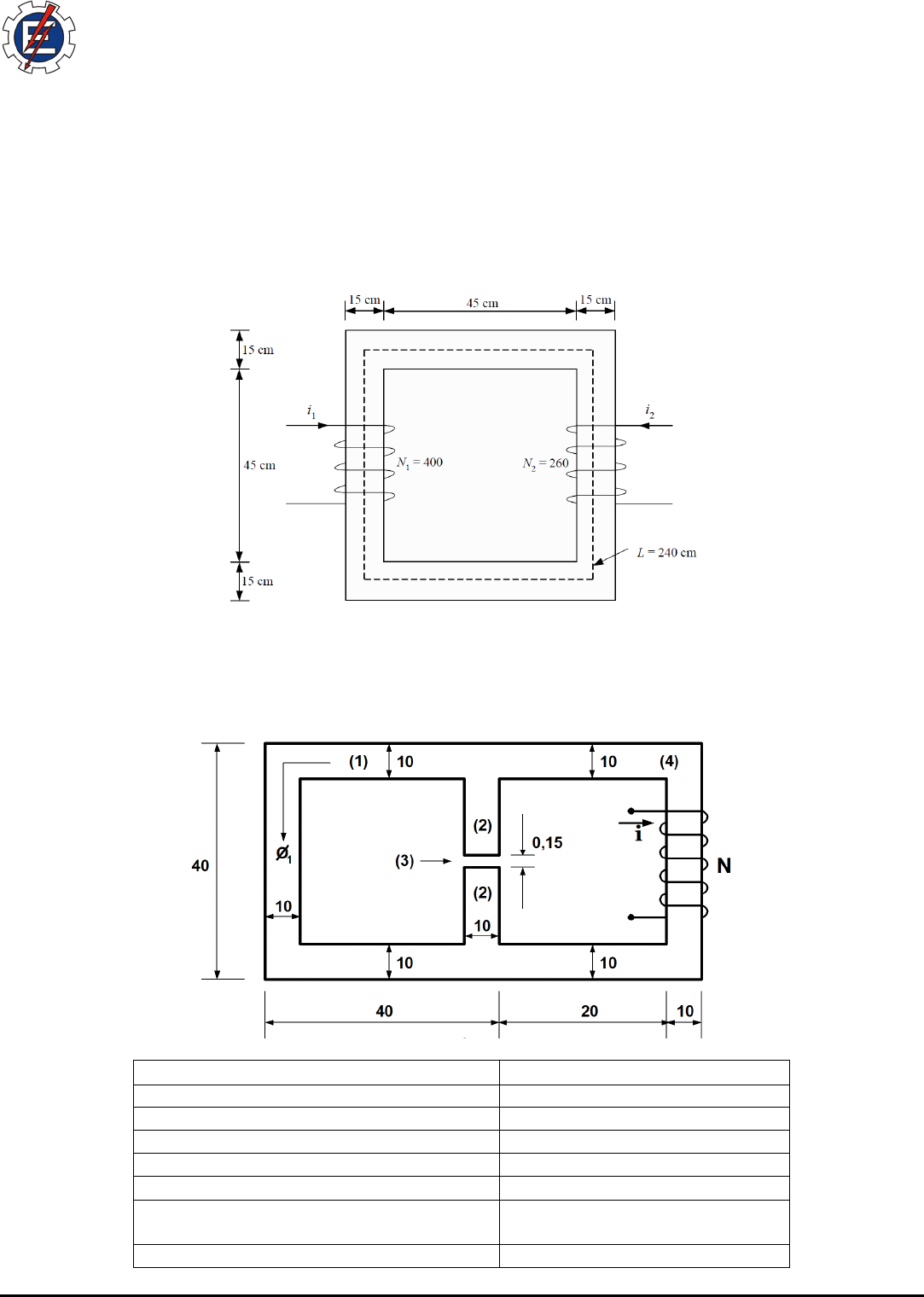 UNIFEI – Universidade Federal de Itajubá ELE 401 – Circuitos Magnéticos 2º Semestre 2018 Prof. Gustavo Lopes – ISEE 7/11/2018 1 / 8 Exercícios Extras Capítulos III, IV e V 1) A figura a seguir apresenta um circuito magnético com duas bobinas. A bobina da esquerda apresenta 400 espiras enquanto a bobina da direita possui 260 espiras. A largura do núcleo é de 15 cm. Calcule o fluxo que será produzido quando as correntes i1 = 0,5 A e i2 = 0,75 A. Assuma µr = 1000 constante. 2) Considere o circuito magnético da figura a seguir dividido em 4 partes [(1) parte da esquerda, (2) parte central de material ferromagnético, (3) entreferro constituído por um certo material diamagnético e (4) parte da direita]. A figura correspondente ao circuito magnético não é apresentada em escala. As medidas da figura estão em centímetros. Fluxo Magnético na Parte 1 (1) 0,0050 Wb Número de Espiras (N) 400 espiras Corrente na Bobina (i) 2,25 A Espessura do Núcleo 10 cm Espraiamento na Área do Gap Desprezado Permeabilidade Magnética do Vácuo 4·10-7 H/m Efeito da Dispersão, resistência da bobina perdas por histerese e Foucault Desprezadas Permeabilidade do núcleo Curva de saturação a seguir UNIFEI – Universidade Federal de Itajubá ELE 401 – Circuitos Magnéticos 2º Semestre 2018 Prof. Gustavo Lopes – ISEE 7/11/2018 2 / 8 a) Determine os comprimentos das linhas médias e as áreas das seções retas transversais do núcleo magnético, que está dividido em 4 partes. b) Desenvolva o circuito elétrico análogo correspondente. Faça uma representação completa. c) Desenvolva a tabela de valores para as quatro partes. d) Determine a indutância da bobina. 3) Uma bateria de 10 V alimenta uma bobina com impedância de 50 ohms e que possui 700 espiras. Esta bobina está montada em um núcleo de ferro de 20 cm de comprimento. Considere a curva de saturação do material a seguir (com saturação e linearizada). a) Determine a força magnetomotriz e a intensidade de campo magnético. b) Determine o campo magnético no núcleo admitindo a não linearidade da curva de saturação. c) Determine o fluxo magnético no núcleo admitindo uma seção reta transversal de 4 cm2 e a não linearidade da curva de saturação. d) Determine o campo magnético no núcleo desprezando o efeito da saturação. e) Determine a indutância da bobina para as duas condições, com e sem o efeito da saturação. f) Explique qual foi o impacto da linearização da curva de saturação no valor da indutância. Os valores obtidos no item são coerentes? UNIFEI – Universidade Federal de Itajubá ELE 401 – Circuitos Magnéticos 2º Semestre 2018 Prof. Gustavo Lopes – ISEE 7/11/2018 3 / 8 4) A figura a seguir mostra de forma simplificada o rotor e o estator de um motor CC. O comprimento do caminho médio do estator é 50 cm e a área de sua seção reta é 12 cm2. O comprimento do caminho médio do rotor é 5 cm e pode-se assumir que a área de sua seção reta é também 12 cm2. Cada entreferro entre o rotor e o estator tem 0,05 cm e área da seção reta de 14 cm2 (incluindo o espraiamento). O ferro do núcleo tem permeabilidade relativa de 2000 e há 200 espiras de fio sobre o núcleo. Se a corrente na bobina for ajustada para 1 A, qual será a densidade de fluxo resultante nos entreferros? 5) Um núcleo ferromagnético com uma permeabilidade relativa de 1500 está mostrado na Figura P1-3. As dimensões são as mostradas no diagrama e a profundidade do núcleo é 5 cm. Os entreferros nos lados esquerdo e direito do núcleo são 0,050 cm e 0,070 cm, respectivamente. Devido ao efeito de espraiamento, a área efetiva dos entreferros é 5% maior do que o seu tamanho físico. Se na bobina houver 300 espiras enroladas em torno da perna central do núcleo e se a corrente na bobina for 1,0 A, quais serão os valores de fluxo para as pernas esquerda, central e direita do núcleo? Qual é a densidade de fluxo em cada entreferro? UNIFEI – Universidade Federal de Itajubá ELE 401 – Circuitos Magnéticos 2º Semestre 2018 Prof. Gustavo Lopes – ISEE 7/11/2018 4 / 8 6) A figura a seguir apresenta um corte de uma máquina rotativa, na qual é possível visualizar os polos, o estator e o rotor desta máquina. O rotor tem raio de 120 mm e comprimento axial de 200 mm. Cada polo tem um arco de 40° e a mesma largura do rotor. O comprimento de cada gap em ar é de 1,5 mm. Todas as partes metálicas (rotor, estator e polos) são constituídas de aço laminado conforme curva de saturação a seguir. Cada polo desta máquina possui uma bobina de 360 espiras conectadas em série. Com base nestes dados, responda as questões a seguir. a) Desenhe o circuito elétrico análogo para esta máquina. b) Determine a relutância aproximada de cada gap. c) Calcule o fluxo em cada polo para um campo magnético de 0,8 T no gap. d) Ignorando as relutâncias de todas as partes em aço laminado, determine a corrente necessária nas bobinas para produzir o fluxo do item c). e) O estator possui raio externo de 210 mm e espessura de 25 mm. Determine o campo magnético no estator. f) Determine a corrente necessária para produzir o campo magnético de 0,8 T no gap considerando a FMM do estator e desconsiderando as FMM dos polos e do rotor. UNIFEI – Universidade Federal de Itajubá ELE 401 – Circuitos Magnéticos 2º Semestre 2018 Prof. Gustavo Lopes – ISEE 7/11/2018 5 / 8 7) Considere o circuito magnético série da figura a seguir alimentado por uma fonte de tensão alternada. Este circuito apresenta os seguintes dados: - u = 326,68·sen (375,73·t) V; - Potência ativa total fornecida pela fonte = 532 W; - Fator de potência de todo o conjunto = 0,34 indutivo; - Resistência da bobina = 1,2 Ω; - Indutância de dispersão = 15 mH; - Número de espiras da bobina = 500; - Perdas por histerese = 1,5 x (Perdas por Foucault); - Efeito da saturação foi desprezado. a) Desenhe o circuito elétrico equivalente considerando os dados fornec