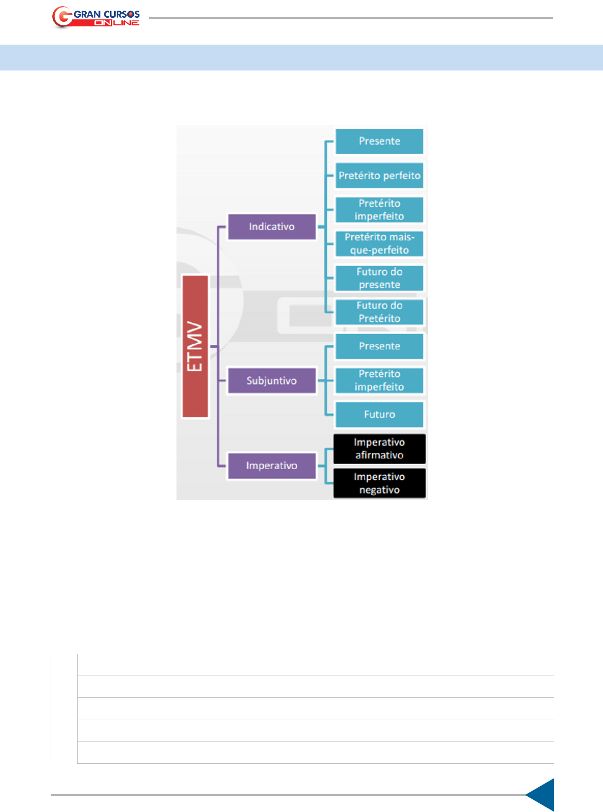 1 Empregos dos Tempos e Modos Verbais – GRAMÁTICA www.grancursosonline.com.br AN O TA Ç Õ ES Produção: Equipe Pedagógica Gran Cursos Online EMPREGO DOS TEMPOS E MODOS VERBAIS Modos e Tempos Verbais 2 GRAMÁTICA – Empregos dos Tempos e Modos Verbais www.grancursosonline.com.br AN O TA Ç Õ ES Produção: Equipe Pedagógica Gran Cursos Online INDICATIVO Os tempos verbais apresentam as seguintes características: Presente • Ação atual: Verbo marca a ação que está ocorrendo exatamente no momento da fala. • Presente histórico: Verbo marca fato já ocorrido e conhecido pelo falante. • Ideias passadas que são consideradas presentes: Ideias com caráter atem- poral. • Futuro próximo: Com o verbo no presente, o adjunto adverbial que identifi- cará o futuro. 3 Empregos dos Tempos e Modos Verbais – GRAMÁTICA www.grancursosonline.com.br AN O TA Ç Õ ES Produção: Equipe Pedagógica Gran Cursos Online Pretérito Perfeito • Ação que teve início e fim no passado: O ato ocorreu e terminou no passado. • Noticiar fato consumado (pretérito consumado): Verbo marca um passado imediato. Pretérito Imperfeito • Ação passada, mas inconclusa: Informa que a ação ocorria no pretérito, mas não informa a conclusão da ação. • Descrição em narrativas: Descrição não temporal. • Ação passada simultânea a outra ação no passado: Ação no passado simultânea a outra ação passada. Pretérito mais-que-perfeito • Uma ação no passado anterior a outra ação no passado: Ação passada encerrada antes de outra ação no passado. • Construções descritivas: Descrição temporal. • Frases optativas: Frases que expressam desejo. Futuro do Presente • Fato posterior ao momento em que se fala: Ato futuro ao ato da fala. • Frases dubitativas, no lugar do presente: Frases que expressam dúvida. • Frases interrogativas: Questões. 4 GRAMÁTICA – Empregos dos Tempos e Modos Verbais www.grancursosonline.com.br AN O TA Ç Õ ES Produção: Equipe Pedagógica Gran Cursos Online Futuro do Pretérito • Fato hipotético posterior a um fato passado: Ato de fala no presente sobre uma hipótese ocorrida no passado. • Frases de surpresa: Que expressam fatos de surpresa. • Orações que expressam cortesia: Indica polidez. SUBJUNTIVO Presente • Dúvida, desejo: Apresenta desejo, porém não apresenta certeza sobre o conteúdo. Pretérito Imperfeito • Correlação com o período composto por subordinação. 5 Empregos dos Tempos e Modos Verbais – GRAMÁTICA www.grancursosonline.com.br AN O TA Ç Õ ES Produção: Equipe Pedagógica Gran Cursos Online Futuro • Correlação com o período composto por subordinação. Obss.:� Este material foi elaborado pela equipe pedagógica do Gran Cursos Online, de acordo com a aula preparada e ministrada pelo professor Elias Santana.