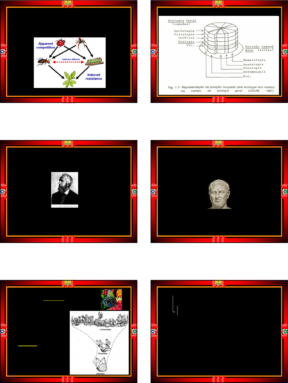 Ecologia dos Insetos Ecologia dos Insetos • Ecologia como entidade científica � ± recente ECOLOGIA - postulou � oekologie - oikos - habitação/ambiente o estudo das relações: organismos entre si e o meio ambiente Descrita pela 1ª vez � Ernest Haekel (1869) conhecimentos mais antigos primeiro a descrever inter-relações � organismos Aristóteles séc. IV a.C. Ecologia autoecologia - âmbito de espécie sinecologia - população, comunidade e ecossistema AUTOECOLOGIA � estudo das espécies individualmente observando-se - distribuição na comunidade - influência dos fatores ambientais sobre - nicho ecológico - acha-se sujeita a fatores do meio ambiente - apresenta tolerância ecológica e reações próprias cada espécie: Fatores ecológicos - qualquer elemento do M.A. � diretamente (seres vivos) - influência direta na distribuição e abundância - insetos - tempo, temperatura, umidade, luz, vento, alimento (interações) Tempo e clima O conjunto de elementos físicos da atmosfera de um determinado local constitui o clima da região. período menor � tempo Clima: constante para uma determinada região Tempo� variável � inconstância � espécies Temperatura representação visual da energia do corpo insetos � pecilotérmicos � ajustamento de temperatura do corpo x ambiente Ciclotérmicos: temperatura do corpo acompanha faixa 10-30ºC � (>>>) Heliotérmicos: usam os raios solares para � T do corpo posições - máximo da energia Ex.: Orthoptera Acrididae Quimiotérmicos: Obs: abelhas - homeotérmicos facultativos Ex.: Sphingidae � T do corpo por meio da atividade muscular Estenotérmicas : limites mais estreitos (aquáticos) Euritérmicas: amplos limites de tolerância (20ºC ou mais) - terrestres � faixa de temperatura em que o inseto se desenvolve Ex.: broca do café larvas dípteras - desenvolve a 55ºC besouro silfídeo - entre 1ºC a - 1,7ºC ovos em Collembola - 7 a 27ºC faixas favoráveis � Orthoptera - 15 a 34ºC exceções: - 7 semanas a 7ºC - 3 semanas a 4ºC - 2 semanas a 1ºC Ex.: Ovos e larvas C. capitata morrem quando expostos: • intensidade - temperatura em si, que é letal • quantidade - tempo de exposição à temperatura letal � Influência letal da temperatura fora da faixa favorável: Umidade animais � 70 a 90% H2O grãos armazenados (baixas umidades) � 52,6% (larvas de T. molitor) � classificação de acordo com a necessidade de H2O: aquáticos� vivem dentro d’água água doce �� evita acúmulo nos tecidos salgada �� resistência à perda d’água Salinidade � efeito limitante nos insetos � (estenoalinos) higrófilos� vivem em ambiente muito úmidos ou saturados insetos higrófilos � (estenohídrico) Oryzophagus oryzae - bicheira da raiz do arroz mesófilos� moderada necessidade de água (>>> das pragas ) (eurihídricos) - suportam grandes variações de umidade xerófilos� vivem em ambientes secos (estenohídricos) Análise da influência conjunta da umidade e temperatura (zoneamento ecológico) - Climogramas Ex.: Ceratitis - Balanço hídrico: Mahanarva fimbriolata Ex.: Luz • fonte universal de energia, também limitante • (excesso ou falta são ambos mortais) - regulador de atividades ≠ T e UR � luz pode ser favorável ou desfavorável escuro claro (+) � prejudicial aos que desenvolvem na escuridão (-) � limitante para os que reproduzem na luz direta (curuquerê-da- couve) deve ser estudada sob 2 aspectos: ação sobre os insetos - fotoperíodo (duração do dia) - regulação dos ritmos biológicos - tropismo (ou tactismo) � reação a um estímulo qualquer (padrões de comportamento) • externos (fatores do meio ambiente) • internos (hormônios) comportamento dos insetos Principais Tropismos Fototropismo: reação à luz fototrópicos (+) � abelhas, mariposas fototrópicos (-) � baratas variam com o estádio adulto (+) Ex.: mosca doméstica larva (-) reagem ≠ aos diversos comprimentos de ondas � + amplos Geotropismo� reação à gravidade (+) � aprofundar no solo - formigas, cupins, larvas de besouros (-) � cigarrinhas, Hymenoptera Parasítica Geotropismo� reação à gravidade Fonotropismo� reação ao som homem - 0,02 a 20 khz de freqüência insetos - até 150 khz � de 20 khz - ultra-sons (+) �atraentes sexuais • cigarra (órgão estridulatório abdome) • grilos (raspar de asas) (+) �atraentes sexuais • pernilongos (vibração de asas) (+) �atraentes sexuais (-) � ultra-sons 25 a 60 khz � repelentes Ex.: mariposas x predadores (morcegos) Tigmotropismo� reação ao contato BC � só perfura o fruto na depressão deixada pelo cálice Termotropismo� reação à temperatura. Ex.: pernilongos Quimiotropismo� reação a substâncias químicas pelo odor ou olfato (+) � reagem aos atraentes (-) � reagem aos repelentes atraentes mais comuns: • alimentação - proteína hidrolisada - mosca de fruta • sexual - feromônio atraentes mais comuns: atraentes mais comuns: • direcional - CO2 x pernilongo; H2O x barata d’água Repelentes óleo de andiroba cânfora sorbitol / ácido bórico enxofre Vento� movimento de ar em relação à superfície da terra vento x altura � dispersão Influi diretamente além de afetar Alimento - processos biológicos - processos morfológicos - processos comportamentais distribuição abundância monocultura (cana) � Migdolus fryanus (cipós) Distribuição e abundância de acordo com disponibilidade de alimento • atróficos - não se alimentam (Ephemeroptera na fase adulta) Hábitos alimentares: • monófagos - uma espécie (broca café) Hábitos alimentares: • polífagos (oligófagos) 2 ou + espécies (Mocis) Hábitos alimentares: • pantófagos (onívoros) - qualquer tipo (barata) Hábitos alimentares: Qualidade: a) Fitófagos (origem vegetal) • xilófagos - lenho - galerias (cupim-de-madeira) • carpófagos - frutos - Ceratitis • fleófagos - madeira (galeria entre a ca