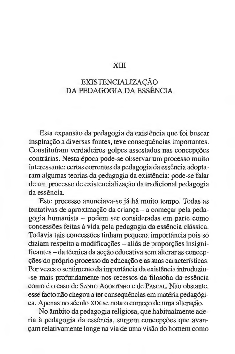 XIII EXISTENCIALIZAÇÃO DA PEDAGOGIA DA ESSÊNCIA Esta expansão da pedagogia da existência que foi buscar inspiração a diversas fontes, teve consequências importantes. Constituíram verdadeiros golpes assestados nas concepções contrárias. Nesta época pode-se observar hlm processo muito interessante: certas correntes da pedagogia da essência adopta- ram algumas teorias da pedagogia da existência: pode-se falar de um processo de existencialização da tradicional pedagogia da essência. Este processo anunciava-se já há muito tempo. Todas as tentativas de aproximação da criança- a começar pela peda- gogia humanista - podem ser consideradas em parte como concessões feitas à vida pela pedagogia da essência clássica. Todavia tais concessões tinham pequena importância pois só diziam re~peito a modificações- aliás de proporções insigni- ficantes- da técnica da acção educativa sem alterar as concep- ções do próprio processo da educação eras suas características. Por vezes o sentimento da importância da existência introduziu- -se mais profundamente •nos recessos da filosofia da essência como é o caso de SANTO AGOsTINHo e de PASCAL. Não obstante, esse facto não chegou a ter consequências em matéria pedagógi- ca. Apenas no século XIX se nota o começo de uma alteração. No âmbito da pedagogia religiosa, que habitualmente ade- ria à pedagogia da essência, surgem concepções que avan- çam relativamente longe na via de uma visão do homem como 60 BOGDANSUCHODOLS~ é e não apenas tal como deve ser. Já referimos a posição per- feitamente excepcional de KIERKEGAARD, que se mostrava quase mais atormentado pela sua inquietação existencialista do que pela sua fé em dogmas e instituições objectivas. Mas convém lembrar que se formou uma corrente muito menos radical que, todavia, se afastava de modo notável da pedago- gia religiosa clássica. Os iniciadores desta corrente são SCHLEIRMACHEER, na pedagogia protestante, e J. H. NEWMAN (1801-1890), na pedagogia católica. Manifesta-se mais ener- gicamente no fim do século sob a designação de modernis- mo. Um dos seus criadores, A. LmsY, interessa-se directamente pela problemática da educação e estabelece com precisão a maneira de tratar os problemas morais. O representante mais famoso da pedagogia religiosa, W. FoERSTER, adoptou e desenvolveu quase toda a técnica da dita educação nova, afastando-se nitidamente dos métodos tradi- cionais de imposição e repressão. Nos Estados Unidos, Georges-Albert CoER (nascido em 1862) formulou um pro- grama análogo de transformação da pedagogia religiosa; no livro Social Theory of Religious Education aconselha a fir- mar a educação no despertar das experiências religiosas da criança, o que devia acontecer em situações sociais precisas. A tentativa mais consequente de «existencialização» da peda- gogia religiosa verificava-se nos círculos protestantes alemães, reunidos, em torno de K. BARTH. Todo este movimento foi alvo constante dos ataques dos tradicionalistas, que o acusavam de, pelas suas consequências, levar à sujeição da religião ao homem, em vez de submeter o homem à religião, pois era esse o seu objectivo. Na sua célebre encíclica sobre a educação cristã da juventude (1929) o papa Pio XI condenou as aspira- ções dos modernistas, denunciando os perigos do «naturalismo pedagógico». Pode-se distinguir um processo semelhante no âmbito da pedagogia que recorre à noção de natureza humana. Esta noção, como mostrámos, com CoMENIUS ainda tinha clara- mente o significado de essência ideal, emanando de certo A PEDAGOGIA E AS GRANDES CORRENTES FILOSÓFICAS 61 modo do homem empírico e assinalando as tarefas funda- mentais da educação. Verificamos o modo como esta noção da natureza humana se tornou cada vez mais a descrição das propriedades empíricas do homem. Os filósofos franceses do Século das Luzes concebiam a natureza humana precisamente desta forma. A filosofia antipsicológica de KANT reforçou a teoria tradicional da natureza humana e HERBART inspirou-se consideravelmente em KANT. Mas no desenvolvimento sub- sequente da psicologia não se seguiu por este caminho; evi- tando enveredar por reflexões metafísicas sobre a natureza humana, a psicologia - em especial o associacionismo e ain- da o condutismo - não fazia qualquer referência ao conteúdo ideal do homem. Quando surgiu uma psicologia de orienta- ção mais filosófica que meditou na velha problemática da «natureza» humana encarou esta de modo muito diferente. Com W. JAMES (1842-1910) e em seguidacomMac DoUGALL, descobriu-se a grande importância dos instintos. No entanto, enquanto esta descoberta não alterava ainda a imagem tradi- cional da natureza humana e as perspectivas da sua educação, a teoria psicanalítica criada por S. FREUD (1856-1939) trouxe uma visão totalmente nova. O homem já não era concebido conforme aspirava ser, e nem sequer era descrito tal como se via à luz da sua consciência. A psicanálise mergulhava num nível mais profundo, para lá da própria consciência, de modo a trazer pqra a claridade, espontâneo e sem constrangimentos, todo o conteúdo obscuro da natureza humana. A psicanálise criou quase imediatamente uma pedagogia própria. Cumpria-lhe tratar e prevenir, devia resolver com- plexos e sublimar tendências. Proclamava a convicção de que o uso de modelos e o recurso a repressões trazem a infelici- dade. O ideal deixou de dirigir o trabalho educativo, para se tornar motivo de erros e fracassos. Educar de acordo com a Natureza era um método que tomava inteligentemente em linha de conta as aspirações fundamentais do homem. Eis- nos no pólo oposto da educação segundo a natureza formula- da por CoMENrus. Com efeito para utilizar as definições de 62 BOGDAN SUCHODOLSKI CoMENIUS, a natureza em educação psicanalítica já não signi- fica a essência original e ideal, mas uma «corrupção que 