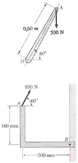 Exercícios de momento de força em relação a um ponto Problema 3.1 (Beer) Uma força vertical de 500 N é aplicada à extremidade de uma manivela fixada a um eixo em O. Determinar: (a) o momento da força de 500 N em relação a O; (b) a intensidade da força horizontal aplicada em A que produz o mesmo momento em relação a O; (c) a menor força aplicada em A que produz o mesmo momento em relação a O; (d) a distância a que uma força vertical de 1200 N deverá estar do eixo para gerar o mesmo momento em relação a O; (e) se alguma das forças obtidas nos itens b, c e d é equivalente à força original. Problema 3.2 (Beer) Uma força de 800 N é aplicada como ilustrado. Determine o momento da força em relação a B. Problema 3.3 (Beer) Uma força de 150 N atua na extremidade de uma alavanca de 0,9 m, como ilustrado. Determinar o momento da força em relação a O. Problema 3.4 (Beer) Uma placa retangular é sustentada por suportes em A e em B e por um fio CD. Sabendo que a tração no cabo é de 200 N, determine o momento da força exercida pelo fio na placa, em relação ao ponto A. Problema 3.5 (Beer) Uma força P de 300 N é aplicada ao ponto A da figura. (a) Calcule o momento de P em relação a O utilizando as componentes horizontal e vertical da força. (b) Com o resultado da parte (a), determine a distância de o à linha de ação de P. Problema 3.16 (Beer) Uma força de 200 N é aplicada ao suporte ABC, como ilustrado. Determine o momento da força em relação a A Problema 3.17 (Beer) O fio AE está esticado do canto A ao canto E de uma chapa dobrada. Sbanedo que a tração no fio é de 435 N, determine o momento em relação a O da força exercida pelo fio (a) no canto A e (b) no canto E.