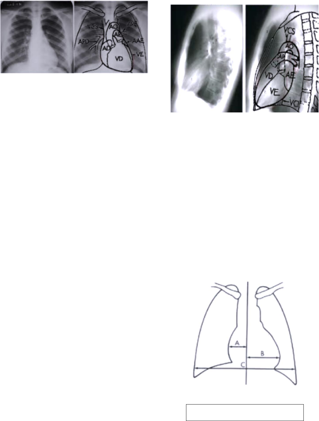 Radiologia Cardíaca Coração Normal – Incidência PA - Iniciamos pelo coração normal, incidência PA. - Começando a avaliação da silhueta normal pela borda direita na projeção PA. Perceba então, as imagens, que aparecem duas imagens: - A primeira uma radiografia normal do coração - A segunda esquemática que mostra as câmaras cardíacas - Observe então, que o coração não possui contornos expressivos. - A parte mais inferior junto ao diafragma corresponde ao átrio direito (AD) - Uma segunda saliência convexa logo acima do AD corresponde à veia cava superior (VCS). Podendo ser observada tanto na imagem real, quanto na esquemática - A silhueta cardíaca esquerda tem um formato característico com duas convexidades e uma concavidade - A primeira convexidade, mais superior e menor representa o botão aórtico - Segue-se uma concavidade, o arco médio, que representa na sua porção mais superior o tronco da artéria pulmonar e na sua porção mais inferior a auriculeta do AE. Perceba Auriculeta do Átrio Esquerdo (AAE). - Concavidade, a perda dessa concavidade pode representar alteração de uma ou de ambas as estruturas - Perceba que a última convexidade representa o Ventrículo Esquerdo (VE). - Então são duas convexidades, superior AO, uma concavidade, e inferior, segunda convexidade VE - Abaixo do arco médio segue a outra convexidade maior que segue até o diafragma que representa a parede do VE. Alterações nessa parte da silhueta representa alterações na parede do VE - Nota-se que na projeção PA normal o VD não possui expressão na silhueta cardíaca, pois essa está para frente - Alterações, portanto, do VD só se expressam de forma indireta da silhueta cardíaca em PA pelo abaulamento da porção superior do arco médio Coração Normal – Incidência Perfil - Perceba nas duas imagens, a primeira uma radiografia real e a segunda imagem que mostra o esquema - No Perfil notamos que a parte anterior da silhueta cardíaca representa basicamente o VD - Normalmente a parte anterior da silhueta no perfil ocupa apenas um terço inferior do filme. Perceba que ela encosta no esterno um terço inferior do filme. Havendo sempre uma área retroesternal livre superior - A ocupação desse espaço retroesternal pela silhueta cardíaca vai indicar alterações do VD. Ou seja, aumento do VD - A câmara mais posterior é o AE. Seu aumento só pode ser definido no perfil quando o Raio X for associado ao contraste do esôfago, que observaríamos uma compressão do esôfago Relação Cardiotorácica - Diâmetro Transverso do Coração 50% do diâmetro do tórax (DCT ≤ DTT/2) (A+B)/C = 1/2 - Perceba na imagem a relação cardiotorácica normal ou o diâmetro transverso do coração deve corresponder até 50% do diâmetro do tórax. O DCT é menor que o DTT/2. Ou seja, A + B tem que ser menor ou igual a metade de C. Se A + B for maior que a metade de C há um aumento do coração Aumento do Átrio Direito (AD) - Na incidência PA, o AD fica mais lateralizado - O AD é a câmara cardíaca de mais difícil avaliação. Muitas vezes ele apresenta uma grande dilatação mais com pouca expressão na radiografia. - Ao aumentar o seu volume o AD cresce para cima e para direta, para esquerda, para frente e para trás. Então ele cresce em todos os sentidos Principais sinais radiológicos na incidência póstero- anterior (PA) 1 - Acentuação da convexidade da borda atrial 2 - Afastamento da borda direita do coração da coluna 3 - Elevação do ponto de interseção do átrio com a cava superior 4 - Alteração do ângulo cardiofrênico - Observe que no lado direito do coração, o AD afastado da coluna vertebral. Perceba como este está aumentado - Comparação entre Imagem do AD normal e AD aumentado. Observe como no AD normal não está afastado da coluna vertebral, como não há uma acentuação da sua convexidade na borda atrial. Percebe que ele é pouco convexo. No AD aumentado a convexidade é muito maior. Aumento do Átrio Esquerdo (AE) - Na incidência PA - Duplo contorno atrial à direita - Corresponde a imagem da borda lateral do AE dentro da sombra cardíaca - Lado esquerdo normal e lado direito aumento do lado esquerdo que representa o duplo contorno atrial à direito - Mesmo sendo AE este duplo contorno aparece à direita Principais sinais radiológicos na incidência póstero- anterior (PA) 1 - Duplo contorno atrial 2 - Protrusão da aurícula abaixo do tronco da artéria pulmonar 3 - Abertura do ângulo de bifurcação da traqueia (carina) 4 - Deslocamento cranial do brônquio fonte esquerdo e do brônquio do lobo superior esquerdo 5 - Deslocamento lateral do esôfago 6 - Deslocamento da aorta descendente para a esquerda 7 - Alteração do ângulo costo-bronco-frênico Radiologia do Aumento do Átrio Esquerdo - Observa-se a compressão do brônquio fonte esquerdo na imagem esquemática e o aumento do AE na imagem radiológica - Pode-se observar duplo contorno atrial, protrusão da auriculeta abaixo do tronco da artéria pulmonar, abertura do ângulo de bifurcação da traqueia (carina), deslocamento cranial do brônquio fonte esquerdo, e do brônquio do lobo superior esquerdo, deslocamento lateral do esôfago, deslocamento da aorta descendente para a esquerda, alteração do ângulo costo- bronco-frênico, Perfil - Esôfago contrastado com sulfato de bário encontra- se comprimido e deslocado posteriormente Aumento do Ventrículo Direito (VD) PA Elevação da ponta do coração, assemelhando-se a imagem de um tamanco holandês Perfil Coração encosta em mais de 1/3 da parede anterior no esterno Principais Sinais da Radiografia PA 1 - Elevação da ponta do coração com modificação do contorno inferior esquerdo 2 - Protrusão do tronco da artéria pulmonar ao nível do arco médio 3 - Aumento do diâmetro transversal (grande dilatação) - O VD cresce para frente, um pouco para cima pelo seu infundíbulo, e para esquerda, modifica a borda esquerda do coraçã