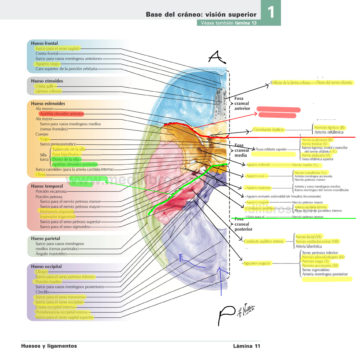 Base del cráneo: visión superior Hueso frontal Surco para el seno sagital--------------------- Cresta fron ta l---------------------------------------- Surco para vasos meníngeos anteriores Agujero c ie go --------------------------------------- Cara superior de la porción orb itaria— Hueso etmoides Crista galli---------- Lámina cribosa- Hueso esfenoides Ala m enor--------------------------------------------- Apófisis clinoides anterior----------------- Ala mayor--------------------------------------------- Surco para vasos meníngeos medios (ramas frontales)------------------------------- Cuerpo Yugo------------------------------------------------ Surco prequiasmático----------------------- ( Tubérculo de la silla Fosa hipofisaria--------------------- Dorso de la silla-------------------- Apófisis clinoides posterior— Surco carotídeo (para la arteria carótida Clivus---------------------------------------------------Hueso temporal Porción escamosa-------------------------------- Porción petrosa Surco para el nervio petroso m enor- Surco para el nervio petroso m ayor- Eminencia arqueada------------------------- Impresión trigem inal------------------------ Surco para el seno petroso superior- Surco para el seno sigmoideo---------- Hueso parietal Surco para vasos meníngeos medios (ramas parietales)— Á ngulo m asto ideo---------------- Hueso occipital Clivus------------------------------------------------------ Surco para el seno petroso in ferio r--------- Porción basilar---------------------------------------- Surco para vasos meníngeos posteriores- C ónd ilo --------------------------------------------------- Surco para el seno transverso----------------- Surco para el seno occ ip ita l-------------------- Cresta occipital interna--------------------------- Protuberancia occipital in terna--------------- Surco para el seno sagital superior---------- I I I * ! j 1 [ Fosa > craneal | anterior I I I ^ Fosa > craneal I media I .1 I I I I I I I I I I [ Fosa > craneal | posterior I I I I I I I I I Huesos y ligamentos Lámina 11 &SVHI�TSWXIVMSV� HE�EPE�QIRSV� -���3PJEXSVMS *MPIXIW ,IRHMYVE�IWJIMRSMHEP &SVHI�WYTIVMSV TI´EWGS :IRE�=YKYPEV�-RXIVRE