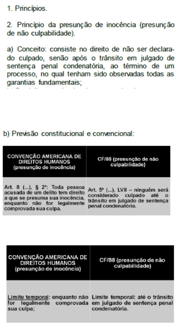 PROVAS a.1) Conceito À luz do HC 126.292 (STF): Consiste no direito de não ser declarado culpado senão após a prolação de acórdão condenatório por TJ (Ou TRF) A maioria entende que não há diferença entre os dois conceitos. Porém, há uma controvérsia sobre o limite temporal. A partir de uma interpretação sistemática da convenção americana, o limite temporal será o acórdão de um TJ ou TRF. Ou seja, até o exato momento em eu houver o exercício do direito ao duplo grau de jurisdição. No entanto, na CF o momento é distinto. Na CF o limite temporal é mais elástico e benéfico ao acusado. Resolução desse Conflito: Conforme o princípio pro homo, quando a normas diversas na convenção e na constituição, prevalece a Constituição Federal. Nesse sentido: Superação desse entendimento: HC 126292/STF C) REGRAS QUE DERIVAM DA PRESUNÇÃO DA Inocência: c.1) Regra Probatória : A parte acusadora tem o ônus de comprovar a culpabilidade do acusado além de qualquer duvida razoável, e não este de provar sua inocência. In dubio Pro reo: # REVISÃO CRIMINAL: Não aplica o In dubio pro reo, mas sim o in dubio contra reum. Pois na revisão criminal, já foi comprovada a culpa do réu. c.2) Regra de tratamento: a privação cautelar da liberdade de locomoção somente encontra justificativa em hipóteses restritas. Ou seja, a regra é que o acusado responda ao processo penal em liberdade, salvo se presentes os pressupostos que autorizam a aplicação das medidas cautelares pessoais. Segundo esse artigo, seria possível a execução provisória da penal. Porém , no HC 84.078 – 2009: somente se admite a execução da pena quando houver o trânsito em julgado da sentença condenatória. À evidência, se presentes os pressupostos, é cabível eventual prisão cautelar. Esse posicionamento influenciou, inclusive a lei 12. 403 que alterou o art. 283 MUDANÇA DE POSICIONAMENTO * d) Concessão Antecipada de benefícios prisionais aos presos cautelares: 3. Princípio da Inadmissibilidade das Provas obtidas por Meios Ilícitos. -Como todo e qualquer direito fundamenta, o direito à prova não tem natureza absoluta. Está sujeito a limitações porque coexiste com outros direitos, igualmente protegidos pelo ordenamento jurídico. 3.1 Previsão Constitucional Essa vedação funciona como fator de dissuasão à adoção de provas probatórias ilegais. também a preservação de direitos e garantias fundamentais. Ex. de prova ilegítima: a violação gera nulidade absoluta consequência da prova ilícita/ Desentranhamento / essa decisão deve ser decretada o mais cedo possível, para evitar contaminação das demais provas. Se através de decisão interlocutória(RESE) - Sentença (APELAÇÃO). Ou em outros momentos através de HC (defesa) ou MS (para o MP). Após a preclusão da decisão (quando não couber mais recurso) a prova será destruída. Exceto quando constituir corpo de delito em relação ao outro crime e quando se tratar de objeto lícito pertencente a alguém. *Descontaminação do Julgado: Foivetada, par. 4 do 157 Porém , com a lei 11.690, o art. 157 resolveu definir o que seria provas ilícita, mas não definiu qual seria o tipo da provas ilegais incluídas no conceito, se material ou processual Surgindo as seguintes correntes: 1.C: O disposto deve ser interpretado extensivamente. Como o artigo não faz distinção sobre provas legais. Essa normas abrange tanto normas de direito MATERIAL como PROCESSUAL. 2.C: Interpretação restritiva. : As provas ilegais citadas no artigo seria apenas as de natureza material. MELHOR ORIENTAÇÃO 3.3 TEORIA DA PROVA ILICITA POR DERIVAÇÃO (teoria dos frutos da árvore envenenada) Conceito: são os meios probatórios que, não obstante produzidos validamente em momento posterior, encontra-se afetados pelo vício da ilicitude originaria, que a eles se trasmite em vitude no nexo causal. 3.4 LIMITAÇÕES à TEORIA DA PROVA ILÍCITA POR DERIVAÇÃO A) Teoria da Fonte independente: Conceito: Se o órgão de persecução penal demonstrar que obteve, legitimamente, novos elementos de informação a partir de uma fonte autônoma de prova, que não guarde qualquer relação de dependência, nem decorra da prova originariamente ilícita, com esta não mantendo vínculo causal, tais dados probatórios são admissíveis, porque não contaminados pela mácula da ilicitude originária. B) Teoria da descoberta inevitável (Exceção da fonte hipotética independente) : A prova derivada da ilícita deve ser considerada válida se acaso demonstrado que tal prova seria produzida de qualquer maneira, independentemente da prova ilícita originaria. Essa teoria não pode ser aplicada com base em dados especulativos. É indispensável a existência de dados concretos demonstrando que sua descoberta seria inevitável. Conceito: se restar demonstrando que a prova derivada da ilícita seria produzida de qualquer modo, independentemente da prova ilícita originaria, tal prova deve ser considerada válida. Na verdade este conceito é de descoberta inevitável e não fonte independente. c) LIMITAÇÃO DA MANCHA PURGADA: Conceito: não se aplica a teoria da prova ilícita por derivação se o nexo causal entre a prova primária e a secundária for atenuado em virtude do tempo, de circunstancias supervenientes na cadeia probatória, da menor relevância da ilegalidade ou da vontade de um dos envolvidos em colaborar com a persecução criminal. Nesse caso, apesar de já ter havido a contaminação de um determinado meio de prova em face da ilicitude ou ilegalidade da situação que o gerou, um acontecimento futuro expurga, afasta, elide esse vício, permitindo-se, assim, o aproveitamento da prova inicialente contaminada. NÃO HÁ PRECEDENTES PARA ESTA TEORIA. Apesar disso, alguns doutrinador sem d) TEORIA DO ENCONTRO FORTUITO DE PROVAS: Conceito : é utilizada nos casos em que no cumprimento de diligencia relativa a um delito, a autoridade policial casualmen