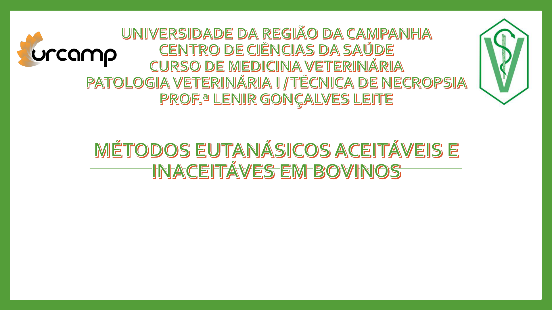 Universidade da região da campanha centro de ciências da saúde CURSO DE MEDICINA VETERINÁRIA Patologia veterinária i / Técnica de Necropsia prof.ª lenir Gonçalves leite Métodos EUTANÁSICOS ACEITÁVEIS E INACEITÁVES em bovinos Nome: Aline Soares, Amanda Vargas, Daniella Quadros, Flávia Cunha, Gabriela Roloff, Kéllen Lacerda, José Carlos Schirmann,, Luiza Medeiros e Maurício Mollmann. Conceito Eutanásia é a indução da cessação da vida animal, por meio de método tecnicamente aceitável e cientificamente comprovado, observando sempre os princípios éticos. Indicações para o uso da eutanásia O bem-estar do animal estiver comprometido de forma irreversível, sendo um meio de eliminar a dor ou o sofrimento dos animais, os quais não podem ser controlados por meio de analgésicos, de sedativos ou de outros tratamentos; O animal constituir ameaça à saúde pública; O animal constituir risco à fauna nativa ou ao meio ambiente; O animal for objeto de ensino ou pesquisa. O tratamento representar custos incompatíveis com a atividade produtiva a que o animal se destina ou com os recursos financeiros do proprietário. MÉTODOS ACEITÁVEIS Químicos, físicos e mecânicos. Barbitúricos Há um rápido aparecimento de efeitos e a perda da consciência induzida por barbitúricos é quase imediata. Outra vantagem é o custo, sendo esses medicamentos os mais baratos quando comparados a outros agentes empregados na eutanásia. Dentre os barbitúricos, aqueles de curta e ultracurta ação são os mais utilizados para tal. A aplicação de medicação pré-anestésica (MPA), antes dos barbitúricos, pode reduzir em até 30% a dosagem necessária para induzir à morte. São classificados como depressores gerais do sistema nervoso central, produzindo depressão central gradativa que se inicia no córtex até atingir o centro cardiorrespiratório bulbar. Os mais utilizados são: Tiopental Pentobarbital Anestesia geral prévia + KCl ou BMN + KCl* Cloreto de potássio (KCl) - é um íon cardiotóxico. O uso do KCl em um animal consciente causa a excitação das fibras nervosas do tipo C, o que promove extrema dor antes que ocorra a morte. Os bloqueadores neuromusculares (BNM) - São fármacos que interrompem a transmissão do impulso nervoso na junção neuromuscular. Devido a esse efeito específico, eles são usados em eutanásia de animais para causar a parada respiratória, com posterior morte do animal por hipóxia. Pistola de ar comprimido (não penetrativa) seguido de exsanguinação Modo de ação da pistola: Concussão cerebral. A pistola de ar comprimido é amplamente utilizada no abate de ruminantes e causa atordoamento, devendo ser seguida por outro método que cause a morte do animal. A exsanguinação é um método de eutanásia que causa a morte pela indução de hipovolemia aguda, ou seja, a perda de grande quantidade de sangue do animal. Métodos inaceitáveis Químicos, físicos e mecânicos. Embolia gasosa É uma lesão iatrogênica que possui alta morbimortalidade. É uma complicação decorrente de procedimentos clínico-cirúrgicos, Causa dor extrema ao animal. Traumatismo craniano ou concussão Destruição direta do cérebro ou despolarização elétrica dos neurônios, que induz rápida inconsciência. Quando mal aplicado produz dor severa. Incineração in vivo Causa morte por queimadura causando dor e sofrimento. Clorofórmio ou éter sulfúrico São tóxicos e causam dor e sofrimento. Descompressão Pode causar dor extrema. Afogamento Causa dor e sofrimento Exsanguinação sem inconsciência prévia Causa angústia e dor. Imersão em formol ou qualquer outra substância fixadora Causa dor e sofrimento Bloqueadores Neuromusculares Uso isolado de nicotina, sulfato de magnésio, cloreto de potássio e todos os curarizantes. Causam dor e angústia. Uso de substância tóxica, natural ou sintética Qualquer tipo destas substâncias que possa causar sofrimento ao animal e/ou demandar tempo excessivo para morte. Eletrocussão sem anestesia prévia Causa dor e angústia Qualquer outro método considerado sem embasamento científico e/ou que não esteja devidamente aprovado pelo CFMV. Métodos aceitáveis sob restrição Químicos, físicos e mecânicos. Anestésicos injetáveis aceitos somente com combinação - Hidrato de cloral É um sedativo hipnótico, sem efeitos analgésicos. Esse medicamento promove depressão lenta no SNC, portanto, a contenção pode ser um problema para alguns animais. A morte é causada por hipoxemia, resultante da progressiva depressão do centro respiratório e pode ser precedida por respiração ofegante, espasmo muscular e vocalização. Arma de fogo Esse método só deve ser aplicado por pessoas altamente treinadas, devido ao risco inerente para o agente que realiza e para possíveis observadores. Quando esse método é corretamente aplicado, garante morte imediata e ausência de sofrimento no animal. O projétil deve ser desferido em direção à cabeça do animal para produzir lesão encefálica irreversível e morte, já que lesões no tórax ou abdômen podem não produzir morte imediata e, consequentemente, sofrimento e dor aos animais. Eletrocussão com anestesia geral prévia É um método de eutanásia no qual a morte é provocada pela exposição do organismo a uma carga letal de energia elétrica com corrente alternada. A eletrocussão causa morte pela indução de fibrilação cardíaca e consequente hipóxia cerebral e morte. No entanto, pode não ocorrer perda de consciência, de 20 a 30 segundos ou mais, após o surgimento da fibrilação cardíaca, caso haja falhas relativas ao método. Os possíveis problemas são o mau posicionamento dos eletrodos e a inadequação da corrente elétrica. Portanto, é imperativo que o animal esteja inconsciente, o que pode exigir anestesia geral prévia à utilização da eletrocussão. Aplicação intratecal de anestésico local com anestesia geral prévia A via administração intra