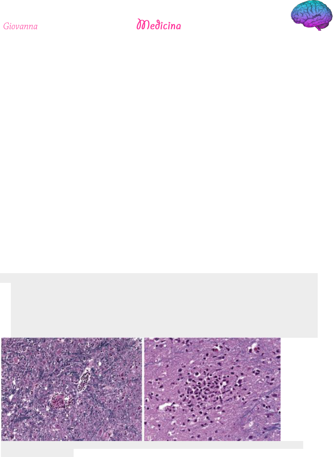 PRINCIPAIS ENCEFALITES VIRAIS Meningoencefalite Viral • A encefalite viral é uma infecção parenquimatosa do encéfalo quase sempre associada à inflamação meníngea (meningoencefalite) e algumas vezes com envolvimento simultâneo da medula espinal (encefalomielite). • Algumas viroses possuem uma propensão a infectar o sistema nervoso → tropismos neurais. • Infecções sistêmicas virais, na ausência de evidência direta de penetração viral no interior do SNC, podem ser seguidas por uma doença mediada pelo sistema imune. • Muitos anos após a doença viral, pode ocorrer uma síndrome degenerativa lentamente progressiva. Encefalite Viral Transmitida por Artrópodes • Arboviroses → causa importante de encefalite epidêmica. o Ocidente → tipos mais importantes → equinas ocidental e oriental, venezuelana, de Saint Louis, de La Crosse e o vírus do Oeste do Nilo. o Arboviroses patogênicas → Japonesa B (Extremo Oriente), a do Vale do Murray (Austrália e Nova Guiné) e a transmitida pelo carrapato (Rússia e Leste Europeu). o Vírus → possuem hospedeiros animais e mosquitos vetores. • Clínica: o Deficits neurológicos generalizados (crises convulsivas, confusão, delírio e estupor ou coma). o Sinais focais (assimetria de reflexos e paralisias oculares). o LCR incolor, leve aumento da pressão, nível elevado de proteínas e glicose normal. Inicialmente → pleocitose neutrofílica e depois linfocítica. Morfolog ia • Meningoencefalite marcada pelo acúmulo perivascular de linfócitos (e algumas vezes com neutrófilos). • Múltiplos focos de necrose de substâncias cinzenta e branca. • Necrose neuronal seletiva com fagocitose dos restos celulares (neuronofagia). • Nódulos microgliais --> pequenos agregados de células microgliais em torno do foco da necrose. • Casos graves --> pode haver vasculite necrosante com hemorragias focais associadas. Os achados característicos da encefalite viral incluem manguitos perivasculares de linfócitos (A) e nódulos microgliais (B). Herpesvírus Simples Tipo 1 • A encefalite por herpesvírus simples tipo 1 (HSV-1) --> mais comum em crianças e em adultos jovens. • Somente cerca de 10% dos indivíduos afetados possuem história prévia de herpes. • Sintomas típicos: alterações de humor, memória e comportamento. • Em alguns indivíduos, a encefalite por HSV-1 segue um curso subagudo com manifestações clínicas (fraqueza, letargia, ataxia, crises convulsivas) que evoluem durante um período mais prolongado (4 a 6 semanas). Morfologia • Inicia e acomete com mais gravidade --> regiões inferior e medial dos lobos temporais e do giro orbital dos lobos frontais. • A infecção é necrotizante e com frequência hemorrágica nas regiões afetadas com mais gravidade. • Infiltrados inflamatórios perivasculares --> geralmente presentes. • Corpúsculos de inclusão viral intranuclear tipo A de Cowdry podem ser encontrados tanto em neurônios quanto na glia. • Em indivíduos com encefalite por HSV-1 de evolução lenta, ocorre o envolvimento mais difuso do encéfalo. A, Encefalite herpética mostrando a extensa destruição dos lobos frontal inferior e temporal anterior (setas) e dos giros do cíngulo (asteriscos). B, O processo inflamatório necrotizante é característico na encefalite herpética aguda. Herpesvírus Simples Tipo 2 • O herpesvírus simples tipo 2 (HSV-2) pode infectar o sistema nervoso. • Pode causar meningite em adultos. • Até 50% dos neonatos nascidos por parto vaginal de mulheres com infecção genital primária ativa por HSV adquirem a infecção durante a passagem pelo canal de parto e desenvolvem grave encefalite. • Em casos de infecção ativa por HIV, o HSV-2 pode causar uma encefalite necrotizante e hemorrágica aguda. Vírus Varicela-zóster (Herpes-zóster) • Infecção primária por varicela → Catapora → Após a infecção cutânea, o vírus entra em uma fase latente no interior dos neurônios sensoriais da raiz dorsal ou do gânglio do nervo trigêmeo. • A reativação da infecção em adultos (cobreiro) → erupção vesicular e dolorosa da pele, com uma distribuição restrita a um único ou a poucos dermátomos. • A reativação do herpes-zóster é geralmente autolimitada, mas pode haver uma síndrome de nevralgia pós-herpética → dor persistente, por vezes induzida por estímulos que de outro modo não são dolorosos. • Envolvimento patente do SNC em decorrência do herpes-zóster é muito mais raro, mas pode ser grave. • Pode causar arterite granulomatosa. • Em indivíduos imunodeprimidos, o herpes-zóster pode causar encefalite aguda caracterizada por numerosas lesões desmielinizantes acentuadamente circunscritas que, posteriormente, submetem- se a necrose. Citomegalovírus • A infecção do sistema nervoso ocorre nos fetos e em indivíduos imunossuprimidos. • Infecção intrauterina --> necrose periventricular --> seguida posteriormente por microcefalia e calcificações periventriculares. • O CMV é um patógeno viral que causa infecção oportunista em indivíduos com AIDS, sendo frequente o envolvimento do SNC. Morfolog ia • Indivíduos imunossuprimidos: o padrão mais comum de envolvimento --> encefalite subaguda, que pode estar associada a inclusões que contenham o CMV. • Infecção nas regiões subependimais paraventriculares do cérebro --> resulta em uma grave ventriculoencefalite hemorrágica necrosante e em uma inflamação do plexo coroide. • O vírus também pode afetar a medula, as raízes e os nervos das porções baixas da medula espinal, produzindo uma radiculoneurite dolorosa. • Qualquer célula do SNC pode estar infectada. • Presença de células citomegálicas proeminentes, com inclusões intranucleares e intracitoplasmáticas. Poliomielite • Em uma pequena fração da população vulnerável, pode invadir secundariamente o sistema nervoso. Morfo log ia • Casos agudos mostram manguitos perivascul