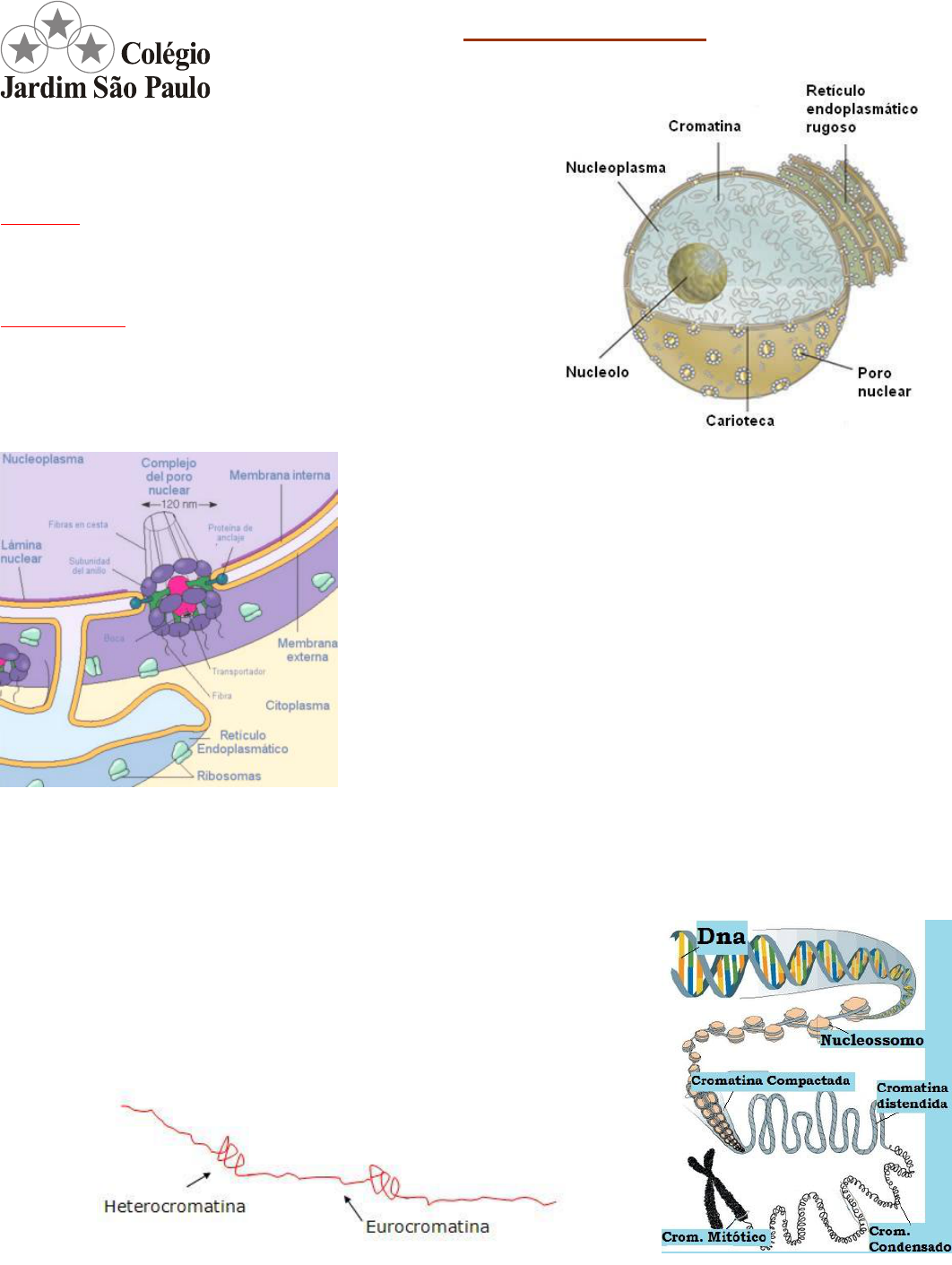 Capítulo 5 – O NÚCLEO Presente nas células eucarióticas (animal e vegetal). Funções: Guarda o material genético (DNA); Comanda as atividades celulares. Componentes: Carioteca; Nucleoplasma; Cromatina; Nucléolo. Carioteca (ou membrana nuclear) Dupla camada lipoproteica; Poros – nucleoporinas: passagem de substâncias entre o núcleo e o citoplasma. Proteção e passagem de substâncias. Nucleoplasma (ou cariolinfa ou suco nuclear) Solução coloidal; Local das reações químicas. Cromatina (ou material genético) Filamento (cromonema) desenrolado; Formado por nucleossomos (DNA + 8 histonas); Tipos: heterocromatina (regiões permanentemente espiraladas da cromatina) – nucleossomos ficam próximos uns dos outros e seus genes são inativos; eucromatina (regiões desespiraladas da cromatina) – nucleossomos permanecem afastados uns dos outros e seus genes são ativos. Cromossomo Filamento de cromatina condensado. Tipos: Metacêntrico: o centrômero divide o cromossomo ao meio. Submetacêntrico: o centrômero divide o cromossomo em duas metades desiguais. Acrocêntrico: o centrômero é subterminal. Telocêntrico: o centrômero é terminal. Material genético nas células Gene é uma unidade de informação genética. Ciclo celular (vida da célula) Intérfase: período longo; célula não está se dividindo; presença de todos os elementos nucleares. Divisão: período curto; célula está se dividindo. Célula haploide (n) Célula reprodutiva (gameta); Possui um cromossomo de cada par de homólogo; Exemplos: óvulo e espermatozoide. Célula diploide (2n) Célula somática; Possui dois cromossomos de cada tipo, formando um par (cromossomos homólogos); Exemplos: leucócito; neurônio; etc. Cariótipo é uma fotografia dos cromossomos para que eles possam ser estudados. Genoma é o número total de genes de uma célula. �PAGE � �PAGE �1�