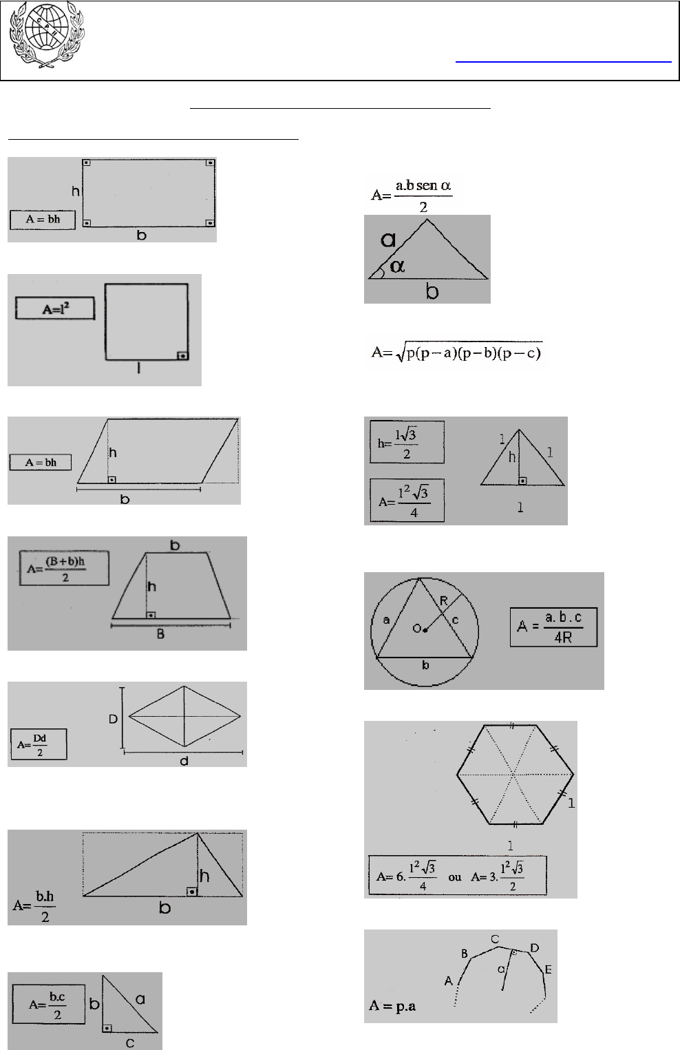 COLÉGIO PEDRO II - UNIDADE SÃO CRISTÓVÃO III 3ª SÉRIE – MATEMÁTICA II – PROFº MARCOS – T: 301 www.professorwaltertadeu.mat.br Revisão Geometria Plana – Áreas e Apótemas � ÁREAS DAS PRINCIPAIS FIGURAS PLANAS � 1) Retângulo 2) Quadrado 3) Paralelogramo 4) Trapézio 5) Losango 6) Triângulos a) Triângulo qualquer b) Triângulo retângulo c) Fórmula trigonométrica da área d) Fórmula de Heron onde p é o semiperímetro e a, b e c são os lados. e) Triângulo eqüilátero f) Em função dos lados e do raio da circunferência circunscrita 7) Hexágono regular 8) Polígono regular Onde p é o semiperímetro e a é o apótema do polígono. 9) Círculo Comprimento C = 2.(.r Área A = (.r2 10) Coroa circular A = (.(R2 – r2) 11) Setor circular A = � QUADRO RESUMO DOS PRINCIPAIS POLÍGONOS REGULARES Exercícios � 1) Num quadrado de lado 10 cm está circunscrita uma circunferência. Determine o raio, o comprimento e a área da circunferência. 2) O lado de um triângulo eqüilátero inscrito numa circunferência mede 2 cm. Determine a medida da altura do triângulo, do raio da circunferência, da área do triângulo e da área da circunferência. 3) Um círculo de 5 cm de raio está inscrito em um hexágono regular. Determine o perímetro e a área do hexágono. 4) O apótema do quadrado inscrito numa circunferência é igual a 2 cm. Determine a área do hexágono regular inscrito nessa mesma circunferência. � 5) Se um circulo de área A e um quadrado de área Q tem o mesmo perímetro, determine a razão Q/A. 6) Determine a área das figuras abaixo: a) b) c) d) 7) Os quadrados ABCD e APQR, representados na figura abaixo, são tais que seus lados medem 6 e o ângulo PAD mede 30°. Ligando-se o ponto B com o ponto R e o ponto D com o ponto P, obtém-se o hexágono BCDPQR, cuja área é: a) 90. b) 95. c) 100. d) 105. e) 110. 8) No quadrado ABCD de lado 2, traçam-se dois arcos com centro nos vértices A e C e raio igual ao lado do quadrado. Determine área delimitada por estes dois arcos. 9) O quadrado ABCD da figura a seguir tem lado igual a 6 cm. Os círculos com centros em A, B, C e D, respectivamente, têm raios iguais a 1/3 do lado do quadrado. Pode-se então afirmar que a área hachurada da figura é, em cm2, igual a: a) 8 (2( + 1). b) 4 (3( + 2). c) 8 (2( - 1). d) 6 (2( + 1). e) 16(. 10) Na figura a seguir, o quadrado maior foi dividido em dois quadrados e dois retângulos. Se os perímetros dos dois quadrados menores são 20 e 80, qual a área do retângulo sombreado? 11) Sabendo-se que a área do circulo da figura abaixo é 2( cm², determine a área da região que esta sombreada. 12) Na figura abaixo, as circunferências têm centro nos pontos A e B e cada uma delas é tangente a três lados do retângulo. Sabendo que cada circulo tem área 2, qual a área do retângulo? 13) Na figura abaixo, ABCD é um quadrado de lado cm, e ABE e BCF são triângulos eqüiláteros. Determine a área do triangulo BEF. 14) Uma propriedade rural tem a forma do triangulo ABC representado na figura. A região cultivada corresponde apenas a porção sombreada. Sabendo-se que AD = AB e AE = AC, que porcentagem da área da propriedade rural é cultivada? A) 50% B) 60% C) 66% D) 75% E) 80% � 15) Na figura abaixo, o raio r da circunferência mede 8 cm. Se os arcos AB, BC e BD representam semicircunferências, então o valor da área em negrito, em cm², é: A) 64( B) 32( C) 24( D) 16( E) 8( 16) (UFPE/06) Na ilustração a seguir, temos um retângulo ABCD, com medidas AB = 12 e BC = 5, e duas faixas retangulares EFGH e IJKL, com EF e JK de mesma medida. Se a área da região colorida e a da região do retângulo ABCD exterior a área colorida são iguais, qual a medida de EF? A) 1,8 B) 1,9 C) 2,0 D) 2,1 E) 2,2