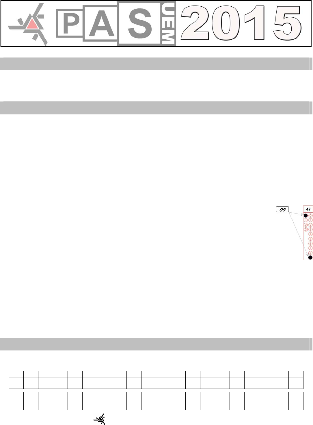 GABARITO 1 CADERNO DE QUESTÕES – PAS-UEM/2015 - ETAPA 3 N.o DE ORDEM: N.o DE INSCRIÇÃO: NOME DO CANDIDATO: INSTRUÇÕES PARA A REALIZAÇÃO DA PROVA 1. Confira os campos N.o DE ORDEM, N.o DE INSCRIÇÃO e NOME, que constam na etiqueta fixada em sua carteira. 2. Confira se o número do gabarito deste caderno corresponde ao número constante na etiqueta fixada em sua carteira. Se houver divergência, avise, imediatamente, o fiscal. 3. É proibido folhear o Caderno de Questões antes do sinal, às 14 horas. 4. Após o sinal, confira se este caderno contém a Prova de Redação e 40 questões objetivas, e/ou ainda qualquer tipo de defeito. Qualquer problema, avise, imediatamente, o fiscal. As folhas da versão definitiva da Prova de Redação estão em separado, com o nome de “Versão Definiva”. 5. A comunicação e o trânsito de qualquer material entre os candidatos são proibidos. A comunicação, se necessária, somente poderá ser estabelecida por intermédio dos fiscais. A desobediência a qualquer uma das determinações dos fiscais poderá implicar a anulação da sua prova. 6. O tempo mínimo de permanência na sala é de 3 horas, após o início da resolução da prova. 7. No tempo destinado a esta prova (5 horas), está incluso o de preenchimento da Folha de Respostas. 8. No caso de questão com apenas uma alternativa correta, lance na Folha de Respostas o número correspondente a essa alternativa correta. No caso de questão com mais de uma alternativa correta, a resposta a ser lançada corresponde à soma dessas alternativas corretas. Em qualquer caso o candidato deve preencher sempre dois alvéolos: um na coluna das dezenas e um na coluna das unidades, conforme o exemplo (do segundo caso) ao lado: questão 47, resposta 09 (soma, no exemplo, das alternativas corretas, 01 e 08). 9. Se desejar ter acesso ao seu desempenho, transcreva as respostas deste caderno no “Rascunho para Anotação das Respostas” (nesta folha, abaixo) e destaque-o na linha pontilhada, para recebê-lo hoje, ao término da prova, no horário das 19h15min às 19h30min, mediante apresentação do documento de identificação. Após esse período, não haverá devolução. 10. Ao término da prova, levante o braço e aguarde atendimento. Entregue ao fiscal este caderno, a Folha de Respostas, o Rascunho para Anotação das Respostas e o Caderno da Versão Definitiva da Redação. 11. São de responsabilidade do candidato a leitura e a conferência de todas as informações contidas no Caderno de Questões e na Folha de Respostas. Corte na linha pontilhada. ........................................................................................................... RASCUNHO PARA ANOTAÇÃO DAS RESPOSTAS - PAS-UEM/2015 - ETAPA 3 N.o DE ORDEM: NOME: 01 02 03 04 05 06 07 08 09 10 11 12 13 14 15 16 17 18 19 20 21 22 23 24 25 26 27 28 29 30 31 32 33 34 35 36 37 38 39 40 UEM – Comissão Central do Vestibular Unificado 2 UEM/CVU – PAS/2015 Etapa 3 Caderno de Questões GABARITO 1 HISTÓRIA ——————— Questão 31/36 ————— Durante boa parte do século XX, a América Latina foi marcada por um fenômeno político conhecido como populismo. Entre os seus principais líderes destacam-se: Getúlio Vargas (Brasil, 1930-1945; 1951-1954), Lázaro Cardenas (México, 1934-1940), Jacobo Arbenz (Guatemala, 1950-1954) e Juan Domingo Perón (Argentina, 1946-1955; 1973-1974). Sobre o populismo latino-americano, assinale o que for correto: 01) Era um regime político que tinha governos fortes e centralizados, sob a direção de líderes carismáticos e autoritários e com grande apoio popular. 02) Era um sistema político apoiado pelos Estados Unidos e pela Comunidade Europeia. 04) Defendia o nacionalismo e era uma opção de poder que fazia oposição às tradicionais oligarquias da região. 08) Promoveu reformas favoráveis aos trabalhadores, como as leis trabalhistas no Brasil, a legislação social na Argentina e a reforma agrária no México e na Guatemala. 16) Defendia a criação de diversos partidos de esquerda, democratizando a disputa pelo poder. ——————— Questão 32/37 ————— Sobre a história da Alemanha no período entre o final da Primeira Guerra Mundial e a ascensão de Adolf Hitler ao poder, assinale o que for correto. 01) Derrotada na Guerra, a Alemanha teve de suportar as duras cláusulas do Tratado de Versalhes, que impunha redução do território, desarmamento e indenização pesada aos vencedores. 02) No final da Guerra, com a queda da monarquia e com a proclamação da república, ascenderam ao poder os social-democratas (os socialistas moderados). 04) Em 1923, Hitler empreendeu sua primeira tentativa de chegar ao poder disputando as eleições como candidato a presidente pelo partido nazista, contando com o apoio do Marechal Eric Ludendorf, herói de guerra. 08) Ao longo da década de 1920, a Alemanha conviveu com o flagelo da hiperinflação, mas houve duas conjunturas em que a economia se estabilizou, graças ao afluxo de investimentos de capital dos Estados Unidos. A primeira conjuntura abrangeu o ano de 1923 e a segunda, o ano de 1929. 16) Desiludido com os métodos eleitorais, Hitler decidiu tomar o poder pela força em 1933, promovendo a lendária Marcha sobre Berlim, inspirada na Marcha sobre Roma, que Mussolini havia realizado em 1922. ——————— Questão 33/38 ————— No século XX, o estado do Paraná foi palco de diversos conflitos de terras de impacto nacional que tiveram repercussão nos aspectos sociais, econômicos e políticos da sociedade brasileira. Sobre esses conflitos de terras, assinale o que for correto: 01) A revolução federalista foi o principal conflito de disputas de terras na região oeste do Paraná no século XX. 02) A Guerra do Contestado (1912-1916) foi uma disputa de território entre Paraná e Santa Catarina, que ganhou grandes proporções políticas pelos conflitos de terras e pelas ideias messiânicas d
