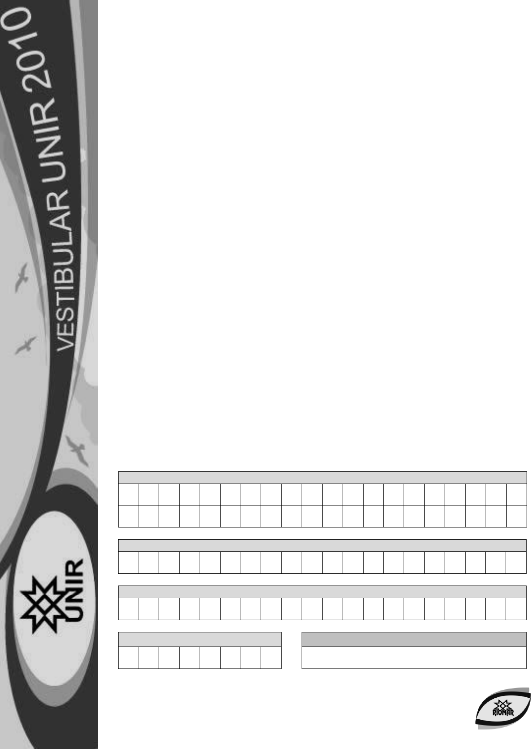 UNIVERSIDADE FEDERAL DE RONDÔNIA 1.a Fase: OBJETIVA CADERNO DE PROVA Nome do Candidato Nome do curso / Turno Local de oferta do curso Código do candidato Assinatura do candidato /2 I N S T R U Ç Õ E S LEIA COM ATENÇÃO 1. Este Caderno de Prova, com páginas numeradas de 1 a 40, é constituído de 100 (cem) questões objetivas, cada uma com cinco alternativas, assim distribuídas: 01 a 10 – Estudos Regionais 11 a 20 – História 21 a 30 – Geografia 31 a 45 – Matemática 46 a 60 – Língua Portuguesa e Literatura 61 a 70 – Língua Estrangeira (Inglês/Espanhol) 71 a 80 – Física 81 a 90 – Biologia 91 a 100 – Química 2. Caso o Caderno de Prova esteja incompleto ou tenha qualquer defeito de impressão, solicite ao fiscal que o substitua. 3. Na parte de Língua Estrangeira, considere apenas o idioma de sua opção: Inglês (páginas 24 a 26) ou Espanhol (páginas 27 a 30). 4. Sobre a Marcação da Folha de Respostas As respostas deverão ser, preferencialmente, transcritas com caneta esferográfica de tinta preta não porosa para a Folha de Respostas, que será o único documento válido para correção. 4.1. Para cada questão existe apenas uma alternativa que a responde acertadamente. Para a marcação da alternativa escolhida na FOLHA DE RESPOSTAS, pinte completamente o círculo correspondente. Exemplo: Suponha que para determinada questão a alternativa C seja a escolhida. N.º da Questão A B C D E 4.2. Marque apenas uma alternativa para cada questão. 4.3. Será invalidada a questão em que houver mais de uma marcação, marcação rasurada ou emendada, ou não houver marcação. 4.4. Não rasure nem amasse a FOLHA DE RESPOSTAS. 5. Todos os espaços em branco, neste caderno, podem ser utilizados para rascunho. 6. A duração da prova é 5 (cinco) horas, já incluído o tempo destinado ao preenchimento da FOLHA DE RESPOSTAS. 7. Será permitida a saída de candidatos levando o Caderno de Prova somente a partir das 17:00 horas. 8. Após o término da prova, o candidato deverá, obrigatoriamente, entregar ao fiscal a FOLHA DE RESPOSTAS. 1/40 - Processo Seletivo UNIR 2010 – 1.a Fase: Objetiva Estudos Regionais Questão 01 O processo de colonização da Amazônia se intensificou no século XVII como se pode perceber pela fundação do povoado de Santa Maria de Belém do Grão-Pará, em 1616, e pela bandeira fluvial chefiada por Pedro Teixeira, em 1637, que tinha por objetivo estabelecer os limites territoriais da Coroa Portuguesa na Amazônia. Dentre os resultados dessa expedição, pode-se destacar: [A] A heterogeneidade das populações nativas e a escolha do local de construção do Forte Príncipe da Beira. [B] A indicação do Oeste como rumo da colonização portuguesa na Amazônia e a diversificada riqueza das chamadas “drogas do sertão”. [C] A descoberta de importantes áreas de mineração aurífera e o estabelecimento de contato com numerosas populações indígenas. [D] O mapeamento das rotas de ligação entre a Bacia Amazônica e a do Prata e a expulsão de grupos corsários ingleses que atuavam no curso do Solimões. [E] O estabelecimento definitivo do caminho amazônico para escoamento da prata contrabandeada de Potosí e o apaziguamento das disputas entre os bandeirantes paulistas e os jesuítas. Questão 02 A tabela abaixo apresenta o volume de exportações de látex, em toneladas, de 1856 a 1939. (PINTO, E. P. Território federal do Guaporé – Fator de integração da fronteira ocidental do Brasil. Rio de Janeiro: Viaman, 2003.) Com base nos dados, pode-se afirmar que, a partir de 1912, inicia-se um processo de redução das exportações do produto cuja explicação reside [A] no aparecimento da borracha sintética. [B] nas dificuldades de transporte do produto para exportação. [C] na perda de produtividade dos seringais amazônicos devido a pragas. [D] na concorrência da borracha asiática. [E] nas inúmeras greves dos seringueiros reivindicando melhores condições de trabalho. 2/40 - Processo Seletivo UNIR 2010 – 1.a Fase: Objetiva Questão 03 O fruto da teimosa ambição que desafiava durante um século [...] aos aventureiros e negociantes setecentistas. [...] e, ainda mais, de defender contra a cobiça do castelhano as terras que abrigavam aquela efêmera riqueza, nasceu o sistema de fortificações que ainda hoje serve para marcar ali a raia extrema dos antigos domínios e senhorios de Sua Majestade Fidelíssima. Por outro lado, articulada à do Guaporé, por conseguinte à Bacia Amazônica a via fluvial [...] constitui uma linha de mais de dez mil quilômetros de comprimento, que abraça a maior parte do Brasil e supera quaisquer outras linhas de circulação natural de nosso território [...] (HOLANDA, S. B. Monções. São Paulo: Brasiliense, 2000, p. 315.) A partir da leitura do texto acima, analise as afirmativas. I - As monções foram importante apoio à incorporação de territórios ao Império Luso. II - A busca desenfreada pelo ouro levou os portugueses a conflitarem com os espanhóis pela posse do rio Amazonas. III - As rotas abertas pelas expedições monçoeiras serviram de base para a posterior construção das rodovias federais na região amazônica. IV - A permanência da ocupação lusa em pontos extremos do reino na América do Sul apenas foi possível graças a essas expedições. Estão corretas as afirmativas [A] II e III, apenas. [B] III e IV, apenas. [C] I e IV, apenas. [D] I e III, apenas. [E] I e II, apenas. Questão 04 Foi em inícios do ano de 1907 que o então major Cândido Rondon foi escolhido para proceder à instalação de uma rede de linhas telegráficas, do Mato Grosso ao Amazonas. Este terá sido o seu maior desafio profissional e representa uma das maiores explorações geográficas na América. Esta exploração decorreu nos anos de 1907, 1908 e 1909, sob a forma de três grandes expedições levadas a cabo uma em cada ano e que, em concreto, ligaram Cuiabá a Sto. António do Madeira. Nestas 