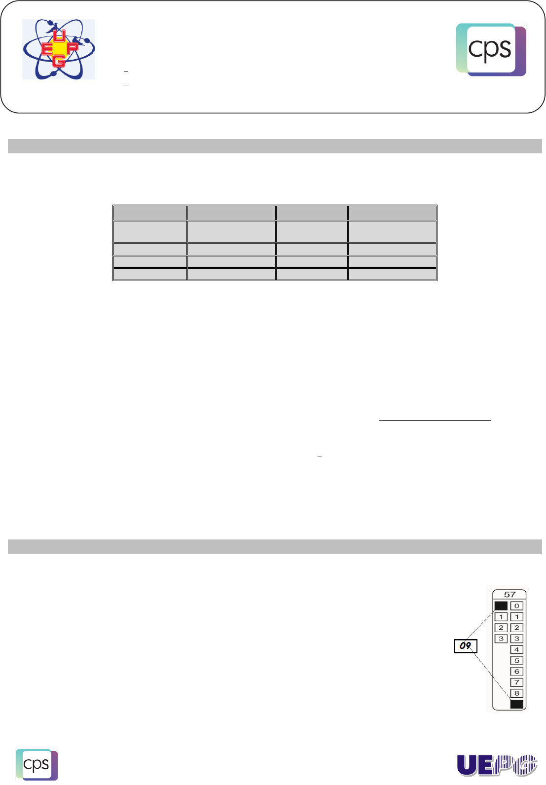INSTRUÇÕES GERAIS Verifique se este caderno contém cinquenta e seis questões objetivas e observe se ele apresenta alguma imperfeição. Em caso de dúvida, comunique o fiscal. O conteúdo desta prova está distribuído da seguinte maneira: QUESTÕES CONTEÚDOS QUESTÕES CONTEÚDOS 01 a 07 Língua Portuguesa Literatura Brasileira 29 a 35 Química 08 a 14 Matemática 36 a 42 Geografia 15 a 21 Física 43 a 49 História 22 a 28 Biologia 50 a 56 Língua Estrangeira As questões desta prova apresentam quatro alternativas, assinaladas com os números 01, 02, 04 e 08, nesta sequência. Cada questão terá como resposta a soma dos números correspondentes às alternativas que você apontar como corretas. O prazo determinado para resolução desta prova é de TRÊS HORAS E TRINTA MINUTOS, a par- tir do momento em que for completado o processo de distribuição dos cadernos de questões, in- cluído o tempo para redação e preenchimento do cartão de respostas. PERMANEÇA na sala de prova após o recolhimento dos cartões de respostas, mantenha o seu ca- derno de questões e aguarde as instruções do fiscal. Se você necessitar de uma declaração de presença, poderá obter o documento personalizado, via internet a partir das 17h00min do dia 30 de julho de 2014, no site cps.uepg.br/vestibular mediante sua senha e protocolo de inscrição no vestibular. Além das informações já constantes do Manual do Candidato, no verso desta capa você encontra o calendário para o Registro Acadêmico e Matrícula em 1a chamada. É de inteira responsabilidade do candidato a leitura, a interpretação e a conferência de todas as in- formações constantes no Caderno de Questões, no Cartão de Respostas e na Folha de Redação. Os únicos instrumentos que serão utilizados para o cálculo da pontuação final dos candidatos no concurso vestibular serão somente os cartões de registros de respostas e a parte da folha de reda- ção destinada à transcrição da versão definitiva. INSTRUÇÕES SOBRE O CARTÃO DE RESPOSTAS CONFIRA os dados seguintes, que devem coincidir com os de sua inscrição: nome do candidato, número de inscrição, curso/turno. ASSINE no local indicado. PREENCHA os campos ópticos com cuidado, porque não haverá substituição do cartão em caso de erro ou rasura. Para cada questão, PREENCHA SEMPRE DOIS CAMPOS, UM NA COLUNA DAS DEZENAS e outro na COLUNA DAS UNIDADES. Como exemplo, se esta prova tivesse a questão 57 e se você encontrasse o número 09 como resposta para ela, o cartão de respostas teria que ser preenchido da maneira indicada ao lado. UNIVERSIDADE ESTADUAL DE PONTA GROSSA COMISSÃO PERMANENTE DE SELEÇÃO VESTIBULAR DE INVERNO 2014 1a etapa: Conhecimentos Gerais e Língua Estrangeira 2a etapa: Redação CALENDÁRIO PARA REGISTRO ACADÊMICO E MATRÍCULA EM 1a CHAMADA E RESPECTIVA LISTA DE ESPERA Todos os cursos, exceto Medicina. MATRÍCULA EM 1ª CHAMADA – CENTRAL DE SALAS DE AULA DA UEPG – CAMPUS EM UVARANAS 1ª CHAMADA – 22 DE JANEIRO DE 2015 1ª CHAMADA – 23 DE JANEIRO DE 2015 CURSO TURNO HORÁRIO CURSO TURNO HORÁRIO Administração noturno 08h30min Agronomia integral 08h30min Bach. Administração-COMEX matutino 08h30min Ciências Econômicas noturno 08h30min Bacharelado em Jornalismo integral 08h30min Ciências Econômicas matutino 08h30min Ciências Contábeis matutino 08h30min Odontologia integral 08h30min Engenharia Civil integral 08h30min Serviço Social integral 08h30min Artes - licenciatura vespertino 10h30min Bacharelado em Informática noturno 10h30min Ciências Contábeis noturno 10h30min História - bacharelado vespertino 10h30min Ciências Biológicas - bacharelado integral 10h30min História - licenciatura noturno 10h30min Educação Física - bacharelado integral 10h30min Matemática integral 10h30min Engenharia de Alimentos integral 10h30min Matemática noturno 10h30min Engenharia de Computação integral 14h30min Música - licenciatura vespertino 10h30min Engenharia de Materiais integral 14h30min Geografia - bacharelado matutino 14h30min Direito matutino 14h30min Enfermagem integral 14h30min Educação Física - licenciatura noturno 14h30min Letras noturno 14h30min Física - bacharelado integral 14h30min Letras vespertino 14h30min Ciências Biológicas - licenciatura vespertino 16h30min Farmácia integral 14h30min Bacharelado em Turismo matutino 16h30min Geografia - licenciatura noturno 16h30min Ciências Biológicas - licenciatura noturno 16h30min Pedagogia matutino 16h30min Direito noturno 16h30min Pedagogia noturno 16h30min Física - licenciatura noturno 16h30min Química - licenciatura noturno 16h30min Zootecnia integral 16h30min Química Tecnológica - bach. integral 16h30min MATRÍCULA EM LISTA DE ESPERA – CENTRAL DE SALAS DE AULA DA UEPG – CAMPUS EM UVARANAS LISTA DE ESPERA – 29 DE JANEIRO DE 2015 LISTA DE ESPERA – 30 DE JANEIRO DE 2015 CURSO TURNO HORÁRIO CURSO TURNO HORÁRIO Administração noturno 08h30min Agronomia integral 08h30min Bach. Administração-COMEX matutino 08h30min Ciências Econômicas noturno 08h30min Bacharelado em Jornalismo integral 08h30min Ciências Econômicas matutino 08h30min Ciências Contábeis matutino 08h30min Odontologia integral 08h30min Engenharia Civil integral 08h30min Serviço Social integral 08h30min Artes - licenciatura vespertino 10h30min Bacharelado em Informática noturno 10h30min Ciências Contábeis noturno 10h30min História - bacharelado vespertino 10h30min Ciências Biológicas - bacharelado integral 10h30min História - licenciatura noturno 10h30min Educação Física - bacharelado integral 10h30min Matemática integral 10h30min Engenharia de Alimentos integral 10h30min Matemática noturno 10h30min Engenharia de Computação integral 14h30min Música - licenciatura vespertino 10h30min Engenharia de Materiais integral 14h30min Geografia - bacharelado matutino 14h30min Direito matutino 14h30min Enfermagem integral 14h30min Educação Física - licenciatura noturno 14h30min Le