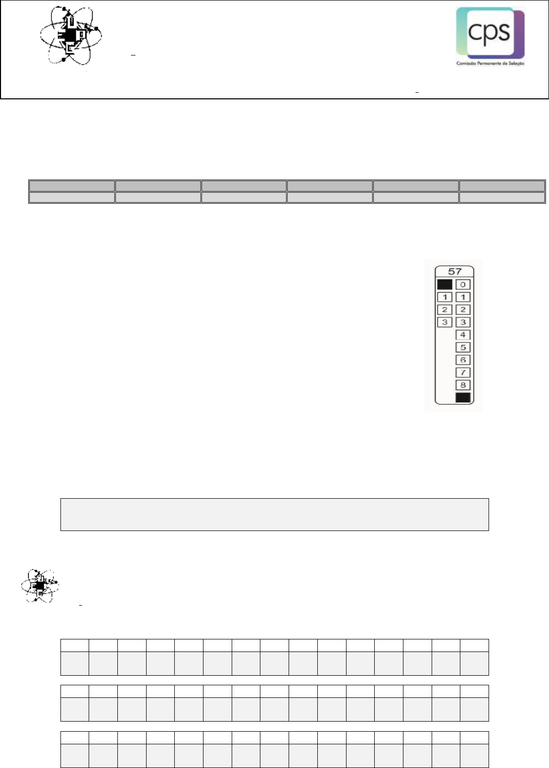 UNIVERSIDADE ESTADUAL DE PONTA GROSSA COMISSÃO PERMANENTE DE SELEÇÃO VESTIBULAR DE VERÃO 2012 3a etapa: Química, Biologia e Física ________________________________________________________ ______________________________ (NOME COMPLETO EM LETRA DE FORMA) (No DE INSCRIÇÃO) INSTRUÇÕES 1. Verifique se este caderno contém quarenta e cinco questões objetivas e observe se ele apresenta algum tipo de de- feito. Em caso de dúvida, comunique o fiscal. 2. O conteúdo desta prova está distribuído da seguinte maneira: QUESTÕES CONTEÚDO QUESTÕES CONTEÚDO QUESTÕES CONTEÚDO 01 a 15 Química 16 a 30 Biologia 31 a 45 Física 3. As questões desta prova apresentam cinco alternativas, assinaladas com os números 01, 02, 04, 08 e 16, nesta sequência. Cada questão terá como resposta a soma dos números correspondentes às alternativas que você apontar como corretas. 4. Instruções sobre o cartão de respostas. 4.1 CONFIRA os dados seguintes, que devem coincidir com os de sua inscrição: nome do candidato, curso/turno, número de inscrição. 4.2 ASSINE no local indicado. 4.3 PREENCHA os campos ópticos com cuidado, porque não haverá substituição do cartão em caso de erro ou rasura. 4.4 Para cada questão, PREENCHA SEMPRE DOIS CAMPOS, um na coluna das dezenas e outro na coluna das unidades. Como exem- plo, se esta prova tivesse a questão 57 e se você encontrasse o número 09 como resposta para ela, o cartão de respostas teria que ser preenchido da maneira indicada ao lado. 5. O prazo determinado para resolução desta prova é de TRÊS HORAS, a partir do momento em que for completado o processo de distribuição dos cadernos de questões, incluído o tempo para o preenchimento do cartão de respos- tas. 6. PERMANEÇA na sala de prova após o recolhimento dos cartões de respostas, mantenha o seu caderno de ques- tões e aguarde as instruções do fiscal. Observação: você pode preencher a papeleta abaixo e levá-la. ATENÇÃO! Só a destaque depois de ter entregue o cartão de respostas ao fiscal. ................................................................................................................................................................................................................. destaque aqui ............................... UNIVERSIDADE ESTADUAL DE PONTA GROSSA COMISSÃO PERMANENTE DE SELEÇÃO VESTIBULAR DE VERÃO 2012 3a etapa: QUÍMICA, BIOLOGIA E FÍSICA PAPELETA PARA ANOTAÇÃO DAS RESPOSTAS ASSINALADAS – USO OPCIONAL 01 02 03 04 05 06 07 08 09 10 11 12 13 14 15 16 17 18 19 20 21 22 23 24 25 26 27 28 29 30 31 32 33 34 35 36 37 38 39 40 41 42 43 44 45 1 QUESTÕES OBJETIVAS QUÍMICA 01 – Sobre Teorias Ácido-Base, assinale o que for correto. 01) A amônia (NH3) é uma base de Arrhenius. 02) A água é uma substância anfótera, pode atuar tanto como base (NH3 + H2O HO– + NH4+) quanto como ácido (HCl + H2O H3O+ + Cl–). 04) No equilíbrio HCO3 - + H2O H3O+ + CO3 2-, o ânion CO3 2- é a base conjugada do ânion HCO3 -, um ácido de Bronsted-Lowry. 08) Os ânions são classificados como bases de Lewis. 16) As espécies K+, Zn2+, AlCl3 e PCl3 são exemplos de ácidos de Lewis. 02 – Dados os sistemas abaixo e considerando que apenas o sistema 1 apresenta pontos de fusão e ebulição cons- tantes durante a mudança de estado, assinale o que for correto. 01) O sistema 1 é composto de substância pura. 02) Os sistemas 2 e 4 são denominados sistemas heterogêneos. 04) Os sistemas 2, 3 e 4 consistem de misturas, sendo que os sistemas 2 e 4 são misturas heterogêneas e o sistema 3 é uma mistura homogênea. 08) Os sistemas 3 e 4 podem ser totalmente separados por filtração simples. 16) O sistema 2 pode ser separado por decantação, utilizando-se, por exemplo, um funil de decanta- ção. 03 – Os números quânticos fornecem informações a cerca das propriedades do elétron em um determinado orbital. Com relação aos números quânticos: principal (n), se- cundário ou azimutal (l), magnético (ml) e de spin (ms), assinale o que for correto. 01) Em uma camada com n=4, existem 4 subcamadas (l=0, 1, 2, 3) e portanto 4 orbitais. 02) Os números quânticos, n=3 e l=2, designam o or- bital 3d, no qual podem ser acomodados no máxi- mo 10 elétrons. 04) O elétron de diferenciação para um átomo com z = 23 possui a seguinte série de números quânti- cos: n=3, l=2, ml=–1, ms=+1/2. 08) Um elétron no orbital 2s pode ser representado pe- lo seguinte conjunto de números quânticos: n=2, l = 1, ml=1, ms=+1/2. 16) Quando n=2, são permitidos os seguintes valores para o número quântico secundário: l=0 e l=1. 04 – Dadas as fórmulas das substâncias abaixo, com relação às ligações químicas envolvidas em suas moléculas e os tipos de interações existentes entre as mesmas, assinale o que for correto. H2 CH4 HF PH3 01) Dentre as substâncias, a que apresenta o maior ponto de ebulição é HF. 02) Todas as moléculas apresentam interações do tipo ligação de hidrogênio. 04) Todas as moléculas apresentam interações do tipo dipolo induzido-dipolo induzido. 08) Todas as moléculas apresentam ligações covalen- tes polares. 16) A molécula de CH4 apresenta uma geométrica te- traédrica, enquanto a molécula de PH3 é piramidal. ESPAÇO RESERVADO PARA CÁLCULOS 05 06 05 – A reação de transformação do dióxido de carbono em monóxido de carbono é representada pela equação abaixo correto C 01) A adição de um catalisador não desloca o equil brio, pois acelera igualmente as reações direta e inversa 02) Quando se nal da concentração de monóxido de carbono 04) O aumento da temperatura do meio favorece a formação de monóxido de carbono 08) A diminuição do volume do recipiente em alizada a reação, com consequente aumento da pressão, favorece a formação do monóxido de ca bono 16) A constante de equilíbrio des expressa em termos de pressões parciais, como K 06 – Com relação xílicos 01) 1,2 02) 2 04) Etóxi 0
