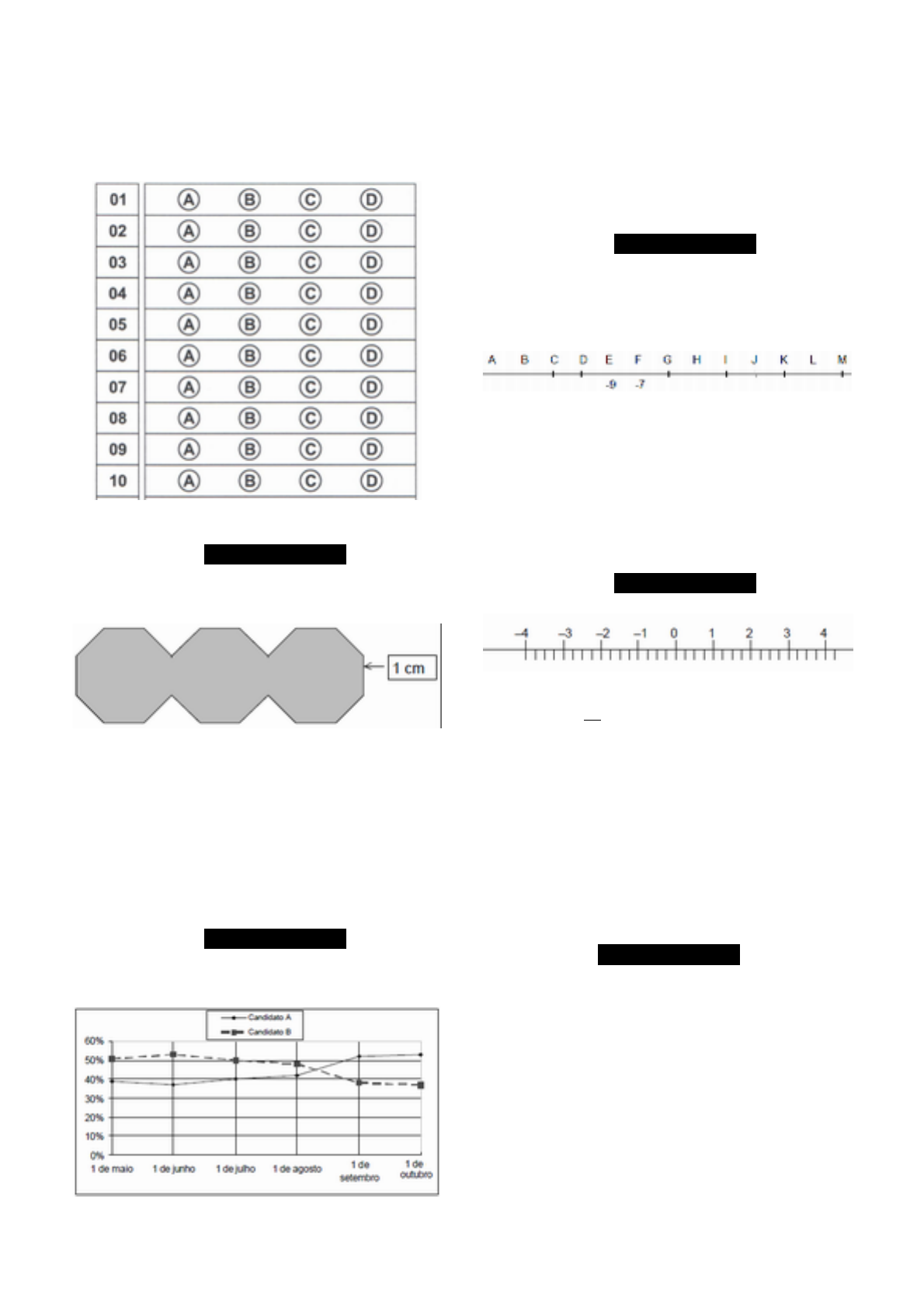 SIMULADO 07 Colégio ........................ Prof. ............................ Nome: ____________________________ D12 –––––––––– QUESTÃO 01 –––––––––– O símbolo abaixo será colocado em rótulos de embalagens. Sabendo-se que cada lado da figura mede 1 cm, conforme indicado, a medida do contorno em destaque no desenho é: (A) 18 cm. (B) 20 cm. (C) 22 cm. (D) 24 cm. D36 –––––––––– QUESTÃO 02 –––––––––– O gráfico abaixo mostra a evolução da preferência dos eleitores pelos candidatos A e B. Em que mês o candidato A alcançou, na preferência dos eleitores, o candidato B? (A) Julho (B) Agosto (C) Setembro (D) Outubro D16 –––––––––– QUESTÃO 03 –––––––––– Na reta numérica da figura abaixo, o ponto E corresponde ao número inteiro -9 e o ponto F, ao inteiro -7. Nessa reta, o ponto correspondente ao inteiro zero estará: (A) sobre o ponto M. (B) entre os pontos L e M. (C) entre os pontos I e J. (D) sobre o ponto J. D17 –––––––––– QUESTÃO 04 –––––––––– Observe o desenho abaixo. O número 4 11 , nessa reta numérica, está localizado entre: (A) – 4 e –3. (B) –2 e –1. (C) 3 e 4. (D) 2 e 3. D19 –––––––––– QUESTÃO 05 –––––––––– Em uma loja de informática, Paulo comprou: um computador no valor de 2200 reais, uma impressora por 800 reais e três cartuchos que custam 90 reais cada um. Os objetos foram pagos em 5 parcelas iguais. O valor de cada parcela, em reais, foi igual a: (A) 414. (B) 494. (C) 600. (D) 654 1 SIMULADO 07 D20 –––––––––– QUESTÃO 06 –––––––––– Em uma cidade do Alasca, o termômetro marcou –15º pela manhã. Se a temperatura descer mais 13º, o termômetro vai marcar: (A) – 28º. (B) – 2º. (C) 2º. (D) 28º. D21 –––––––––– QUESTÃO 07 –––––––––– Em qual das figuras abaixo o número de bolinhas pintadas representa 3 2 do total de bolinhas? D22 –––––––––– QUESTÃO 08 –––––––––– Das 15 bolinhas de gude que tinha, Paulo deu 6 para o seu irmão. Considerando-se o total de bolinhas, a fração que representa o número de bolinhas que o irmão de Paulo ganhou é: (A) 15 6 (B) 15 9 (C) 9 15 (D) 6 15 D24 –––––––––– QUESTÃO 09 –––––––––– Um posto de combustível colocou um cartaz anunciando o preço da gasolina por 2,206 reais o litro. Isso significa que o posto vende a gasolina a 2 reais é: (A) 0,206 centésimos de real. (B) 0,206 décimos de real. (C) 206 centésimos de real. (D) 206 milésimos de real. D25 –––––––––– QUESTÃO 10 –––––––––– Fazendo-se as operações indicadas em 0,74 + 0,5 – 1,5 obtém-se: (A) – 0,64 (B) – 0,26 (C) 0,26 (D) 0,64. 2