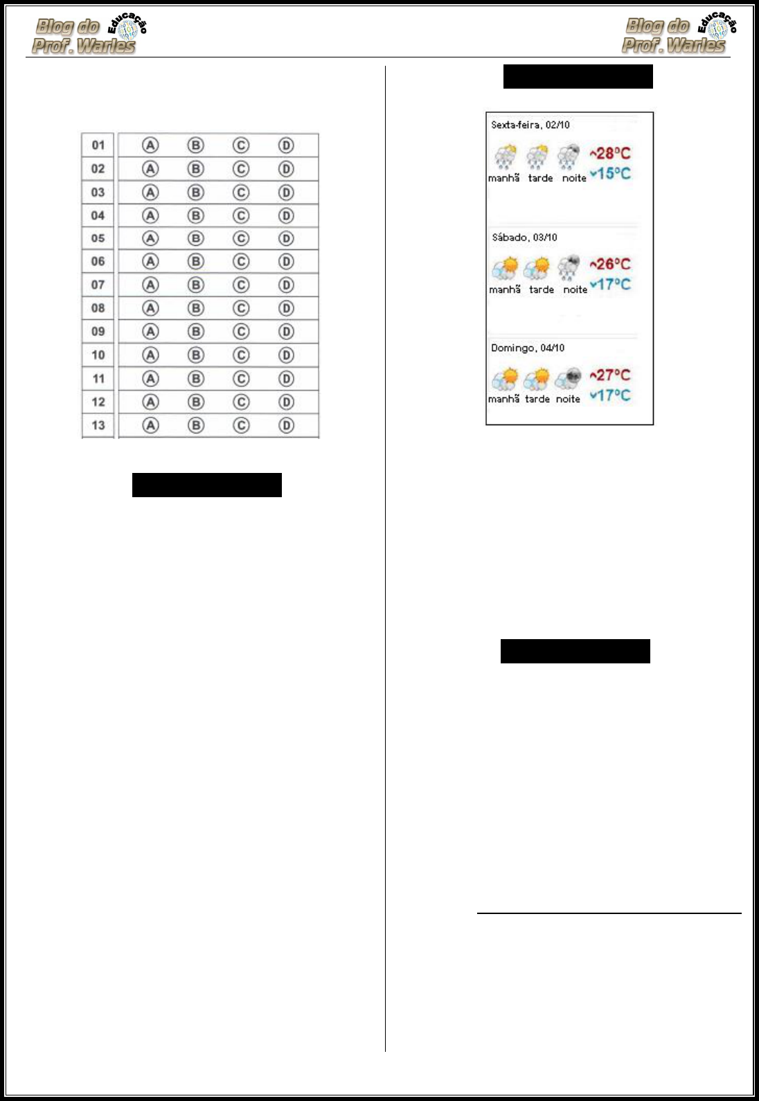 ��Simulado 11 – 9º Ano Lingua Portuguesa � Escola: _________________________ Prof.: ___________________________ Nome: _____________________________ D ––––––––––– QUESTÃO 01 ––––––––––– Leia o texto para responder a questão abaixo: Rua do Sol [...] Mais um grande acontecimento sacudia a cidade. E toda a Rua do Sol participava da mesma estranha agitação. Os pais confabulavam. Os vizinhos confraternizavam. Havia que olhar as crianças, vigiá-las, evitar que ficassem na rua. A morte poderia surgir inesperadamente, arrastando-as. O primeiro automóvel circulava. Era uma coisa inesperada, que andava por si, como se fosse um trem, mas sem locomotiva. Nada lembrava dos bondinhos a burro que rolavam barulhentos pelas ruas.[...] LESSA, Orígenes. Seleta.2 ed.Rio de Janeiro, José Olympio, 1976. O acontecimento que deixou os moradores da Rua do Sol agitados foi (A) a circulação do primeiro automóvel nas ruas da cidade. (B) a confraternização dos pais e das crianças nas ruas barulhentas. (C) a atitude das crianças frente aos trens barulhentos. (D) a lembrança do barulho dos carros nos trilhos. D ––––––––––– QUESTÃO 02 ––––––––––– Leia o texto para responder a questão abaixo: Fonte: ww.blogangel.com.br/.../2009/10/climatempo.jpg Ao observar o quadro da previsão do tempo para o final de semana, pode-se afirmar que no sábado haverá sol com (A) muitas nuvens durante o dia. Períodos de nublado, com chuva a qualquer hora. (B) algumas nuvens ao longo do dia. À noite ocorrem pancadas de chuva. (C) muitas nuvens. À noite não chove. (D) pancadas de chuva ao longo do dia. À noite, tempo aberto sem nuvens. D ––––––––– QUESTÃO 03 –––––––––– Leia o texto para responder a questão abaixo: Os pancararés Conhecedores de cada canto da região em que viveram os cangaceiros, os pancararés, quando a volante passava, ajudavam a esconder Lampião e seu bando. Hoje, uma comunidade remanescente dos pancararés vive na Baixa do Chico, um pequeno povoado situado no interior do Raso da Catarina. Embora as condições de vida sejam bastante simples, os moradores parecem saudáveis. Vivem em casas rústicas de pau-a-pique e recebem água de um poço artesiano porque a região é árida e agreste. Dedicam-se a pequenas lavouras de milho e feijão e à criação de gado. www.almg.gov.br/revistalegis/saofrancisco/população. No trecho “...quando a volante passava, ajudavam a esconder Lampião e seu bando.”, a expressão destacada demonstra uma circunstância de (A) dúvida. (B) condição. (C) tempo. (D) comparação. D –––––––––– QUESTÃO 04 –––––––––– Leia o texto para responder a questão abaixo: A expressão “Amigos de muitos carnavais” significa que os atores são (A) diretores de peças lançadas no carnaval. (B) parceiros de trabalho há muito tempo. (C) amigos em qualquer situação adaptada para teatro. (D) companheiros na missão de transformar a peça em filme. D ––––––––––– QUESTÃO 05 ––––––––––– Leia o texto para responder a questão abaixo: Maneira de amar O jardineiro conversava com as flores e elas se habituaram ao diálogo. Passava manhãs contando coisas a uma cravina ou escutando o que lhe confiava um gerânio. O girassol não ia muito com sua cara, ou porque não fosse homem bonito, ou porque os girassóis são orgulhosos de natureza. Em vão o jardineiro tentava captar-lhe as graças, pois o girassol chegava a voltar-se contra a luz para não ver o rosto que lhe sorria. Era uma situação bastante embaraçosa, que as outras flores não comentavam. Nunca, entretanto, o jardineiro deixou de regar o pé de girassol e de renovar-lhe a terra, na ocasião devida. O dono do jardim achou que seu empregado perdia muito tempo parado diante dos canteiros, aparentemente não fazendo coisa alguma. E mandou-o embora, depois de assinar a carteira de trabalho. Depois que o jardineiro saiu, as flores ficaram tristes e censuravam-se porque não tinham induzido o girassol a mudar de atitude. A mais triste de todas era o girassol, que não se conformava com a ausência do homem. "Você o tratava mal, agora está arrependido?" "Não, respondeu, estou triste porque agora não posso tratá-lo mal. É a minha maneira de amar, ele sabia disso, e gostava". ANDRADE, Carlos Drummond de. Histórias para o Rei. Rio de Janeiro: Record, 1997. No trecho “Em vão o jardineiro tentava captar-lhe as graças” (2° parágrafo), o termo em destaque refere-se ao seguinte termo do 1° parágrafo: (A) cravina (linha 3). (B) gerânio (linha 4). (C) girassol (linha 4). (D) homem bonito (linha 5). D –––––––––– QUESTÃO 06 –––––––––– Leia o texto para responder a questão abaixo: “Oi, André! O pessoal aqui em casa até que se vira: meu pai e minha mãe trabalham, meu irmão tá tirando faculdade, minha irmã mais velha também trabalha, só vejo eles de noite. Mas minha irmã mais moça nem trabalha nem estuda, então toda hora a gente esbarra uma na outra. Sabe o que é que ela diz? Que é ela que manda em mim, vê se pode. Não posso trazer nenhuma colega aqui: ela cisma que criança faz bagunça em casa. Não posso nunca ir na casa de ninguém: ela sai, passa a chave na porta, diz que vai comprar comida (ela vai é namorar) e eu fico aqui trancada pra atender telefone e dizer que ela não demora. Bem que eu queria pular a janela, mas nem isso dá pé: sexto andar. [...] Aí eu inventei que o Roberto (um grã-fino que ela quer namorar) tinha falado mal dela. [...] Não era pra eu ter inventado nada; saiu sem querer. Sai sempre sem querer, o que é que eu posso fazer? E dá sempre confusão, é tão ruim! Escuta aqui, André, você me faz um favor? Para com essa mania de telegrama e me diz o que é que eu faço pra não dar mais confusão. POR FAVOR, sim? Raq