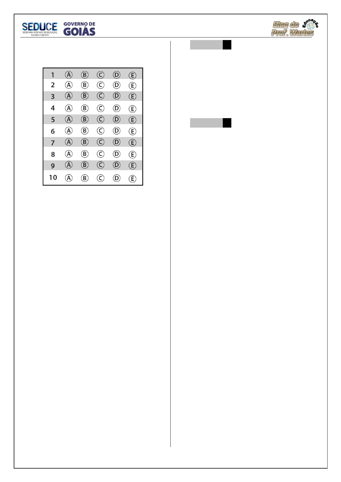 �� 4ª Prova diagnóstica – 2016 – 3º Série SEDUCE-GO – PORTUGUÊS - Ens. Médio � ESCOLA: ________________________ Prof.:____________________________ Nome: ___________________________ Leia o texto e, a seguir, responda as questões 1 e 2. Vidas secas Graciliano Ramos [...] − Anda, condenado do diabo, gritou-lhe o pai. Não obtendo resultado, fustigou-o com a bainha da faca de ponta. Mas o pequeno esperneou acuado, depois sossegou, deitou-se, fechou os olhos. Fabiano ainda lhe deu algumas pancadas e esperou que ele se levantasse. Como isto não acontecesse, espiou os quatro cantos, zangado, praguejando baixo. A caatinga estendia-se, de um vermelho indeciso salpicado de manchas brancas que eram ossadas. O voo negro dos urubus fazia círculos altos em redor de bichos moribundos. − Anda, excomungado. O pirralho não se mexeu, e Fabiano desejou matá-lo. Tinha o coração grosso, queria responsabilizar alguém pela sua desgraça. A seca aparecia-lhe como um fato necessário – e a obstinação da criança irritava-o. Certamente esse obstáculo miúdo não era culpado, mas dificultava a marcha, e o vaqueiro precisava chegar, não sabia onde. Tinham deixado os caminhos, cheios de espinho e seixos, fazia horas que pisavam a margem do rio, a lama seca e rachada que escaldava os pés. [...] RAMOS, Graciliano Vidas Secas. 45. ed. Rio de Janeiro, São Paulo: Record, 1980, pp. 9-16. D3 Questão 1 ––––––––––––––––––––––––––| No trecho “...Tinha o coração grosso, queria responsabilizar alguém...”, a expressão “coração grosso” significa que o coração é (A) entristecido. (B) endurecido. (C) amargurado. (D) envergonhado. (E) descompromissado D4 Questão 2 ––––––––––––––––––––––––––| Pela leitura do trecho “Certamente esse obstáculo miúdo não era culpado, mas dificultava a marcha, e o vaqueiro precisava chegar, não sabia onde.”, infere-se que Fabiano estava (A) desnorteado. (B) desconfiado. (C) apavorado. (D) resignado. (E) animado. Leia o texto e, a seguir, responda as questões 3 e 4. O tempo e o vento – O continente Ana Terra [...] Mal raiou o dia, Ana ouviu um longo mugido. Teve um estremecimento, voltou a cabeça para todos os lados, procurando, e finalmente avistou uma das vacas leiteiras da estância, que subia a coxilha na direção do rancho. A Mimosa! – reconheceu. Correu ao encontro da vaca, enlaçou-lhe o pescoço com os braços, ficou por algum tempo a sentir contra o rosto o calor bom animal e a acariciar-lhe o pelo do pescoço. “Leite para as crianças” – pensou. O dia afinal de contas começava bem. (...) Começou a catar em meios dos destroços do rancho as coisas que os castelhanos havia deixado intactas: a roca, o crucifixo, a tesoura grande de podar – que servira para cortar o umbigo de Pedrinho e de Rosa, – algumas roupas e dois pratos de pedra. Amontoou tudo isso e mais o cofre em cima de dum cobertor e fez uma trouxa. Naquele dia alimentaram-se de pêssegos e dos lambaris que Pedrinho pescou no poço. E mais uma noite desceu – clara, morna, pontilhada de vaga-lumes e dos gemidos dos urutaus. Pela madrugada Ana acordou e ouviu o choro da cunhada. Aproximou-se dela e tocou-lhe o ombro com a ponta dos dedos. – Não há de ser nada, Eulália... Parada junto de Pedro e Rosa, com um vaga-lume pousado a luciluzir entre os chifres, a vaca parecia velar o sono das duas crianças, como um anjo da guarda. – Que vai ser de nós agora? – choramingou Eulália. – Vamos embora daqui. – Mas pra onde? – Pra qualquer lugar. O mundo é grande. Ana sentia-se animada, com vontade de viver. Sabia que por piores que fossem as coisas que estavam por vir, não podiam ser tão horríveis como as que já tinha sofrido. Esse pensamento dava-lhe uma grande coragem. E ali deitada no chão a olhar para as estrelas, ela se sentia agora tomada por uma resignação que chegava quase a ser indiferença. Tinha dentro de si uma espécie de vazio: sabia que nunca mais teria vontade de rir nem de chorar. Queria viver, isso queria, e em grande parte por causa de Pedrinho, que afinal de contas não tinha pedido a ninguém para vir ao mundo. Mas queria viver também de raiva, de birra. A sorte andava sempre virada contra ela. Pois Ana estava agora decidida a contrariar o destino. Ficara louca de pesar no dia em que deixara Sorocaba para vir morar no Continente. Vezes sem conta tinha chorado de tristeza e de saudade naqueles cafundós. Vivia com o medo no coração, sem nenhuma esperança de dias melhores, sem a menor alegria, trabalhando como uma negra, e passando frio e desconforto... Tudo isso por quê? Porque era a sua sina. Mas uma pessoa pode lutar contra a sorte que tem. Pode e deve. E agora ela tinha enterrado o pai e o irmão e ali estava, sem casa, sem amigos, sem ilusões, sem nada, mas teimando em viver. Sim, era pura teimosia. Chamava-se Ana Terra. Tinha herdado do pai o gênio de mula. [...] VERÍSSIMO, Érico. O tempo e o vento: I. O continente. São Paulo: Globo, 1952, pp. 122-123. D19 Questão 3 ––––––––––––––––––––––––––| A gradação no trecho “sem casa, sem amigos, sem ilusões, sem nada...”, utilizada pelo autor do texto, tem o objetivo de (A) enaltecer a determinação de Ana Terra. (B) destacar a vontade de viver de Ana Terra. (C) detalhar a personalidade física e moral de Ana Terra. (D) descrever o comportamento psicológico de Ana Terra. (E) enfatizar a sensação de ausência que toma conta de Ana Terra. D15 Questão 4 ––––––––––––––––––––––––––| No trecho “Pois Ana estava agora decidida a contrariar o destino.”, o conectivo “pois” estabelece com a ideia que o antecede uma relação de (A) restrição. (B) conclusão. (C) explicação. (D) concessão. (E) comparação. D12 Questão 5 –––––––––