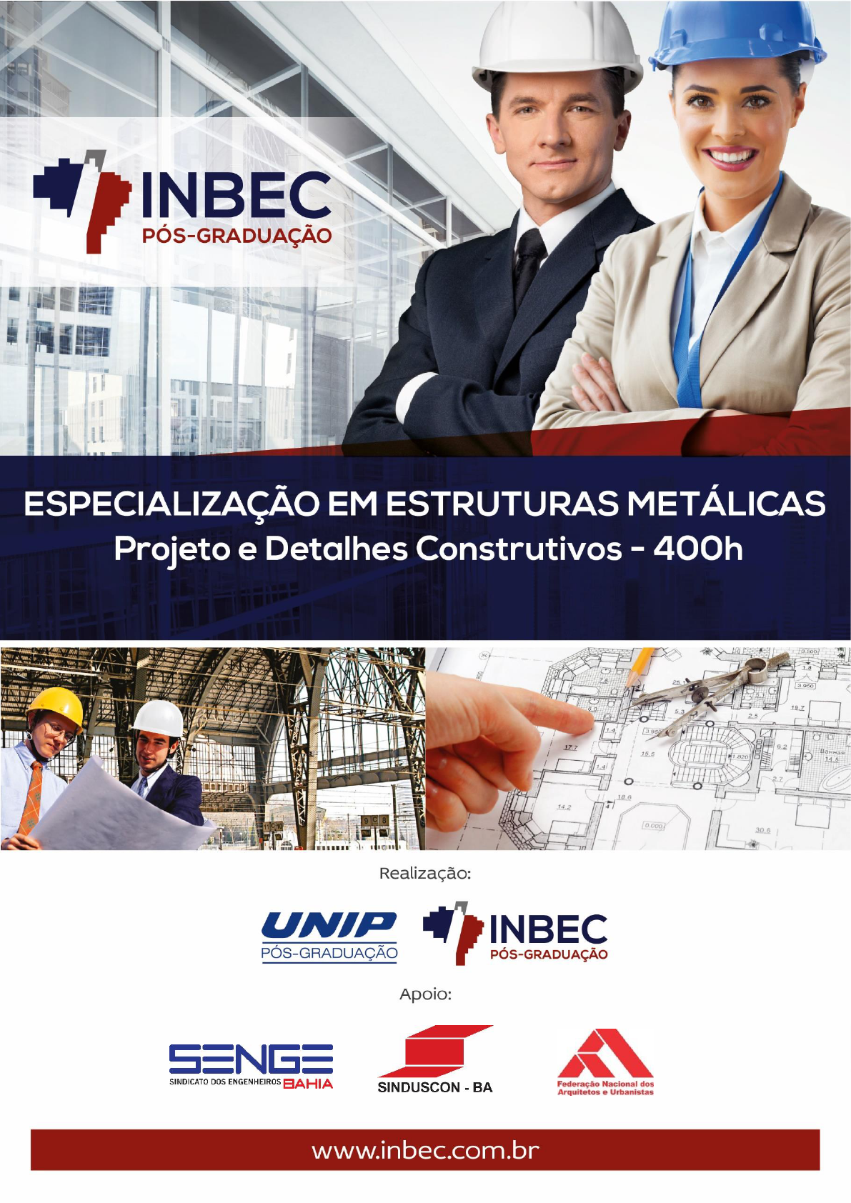 INBEC SALVADOR - INSTITUTO BRASILEIRO DE EDUCAÇÃO CONTINUADA Rua Jacobina nº 64, Ed. Empresarial Rio Vermelho, Sl 201, Bairro do Rio Vermelho - CEP: 41.940-160 - Salvador - BA Fones: (71) 3491-0955 | 3012-0076 | 98852-6320 | 99262-4344| E-mail: salvador@inbec.com.br SALVADOR - BA / TURMA II / VAGAS LIMITADAS INBEC SALVADOR - INSTITUTO BRASILEIRO DE EDUCAÇÃO CONTINUADA Rua Jacobina nº 64, Ed. Empresarial Rio Vermelho, Sl 201, Bairro do Rio Vermelho - CEP: 41.940-160 - Salvador - BA Fones: (71) 3491-0955 | 3012-0076 | 98852-6320 | 99262-4344| E-mail: salvador@inbec.com.br ESPECIALIZAÇÃO EM ESTRUTURAS METÁLICAS Projeto e Detalhes Construtivos – Turma II - INBEC BA Histórico da Instituição UNIVERSIDADE PAULISTA – UNIP A Universidade Paulista, UNIP, reconhecida pela Portaria nº 550/88, iniciou suas atividades em 09 de novembro de 1988. Foi constituída a partir do Instituto Unificado Paulista, IUP, do Instituto de Ensino de Engenharia Paulista, IEEP, e do Instituto de Odontologia Paulista, IOP; o primeiro destes, autorizado a funcionar em 1972, inicialmente com os cursos de Comunicação Social, Letras, Pedagogia e Psicologia. Hoje, em razão do processo de evolução, a UNIP, por meio de uma proposta acadêmica moderna, vem expandindo suas atividades por diversos Campi, visando à preparação de recursos humanos altamente qualificados demandados pela política de desenvolvimento nacional. A UNIP promove a formação atualizada dos alunos e sua capacitação para uma sociedade em mudança, por meio de um ensino de qualidade, tecnologicamente avançado e dirigido para o futuro, nas áreas das ciências humanas, sociais, exatas e da saúde. Sua finalidade maior é promover o desenvolvimento do potencial dos alunos, estabelecendo condições que possibilitem uma inserção ativa no mercado de trabalho e a solução criativa de problemas que a sociedade propõe. A realidade brasileira, que merece especial atenção por parte da UNIP, faz com que também seja dada ênfase aos programas de estudos pós-graduados. Estes dedicam-se ao aperfeiçoamento do seu próprio corpo docente assim como ao atendimento às necessidades da comunidade em geral, já que, além de formar profissionais de todas as áreas, de desenvolver pesquisas que venham a gerar descobertas científicas e inovações tecnológicas, a UNIP propõe-se a saber cumprir as exigências apresentadas pelo mundo moderno. Assim, a Universidade Paulista vem sendo reconhecida como um importante centro de produção de conhecimento e de sua difusão a um número maior de pessoas, através das atividades de ensino, pesquisa e extensão e pós-graduação. DA RESOLUÇÃO DO MEC: Curso Organizado conforme a Resolução nº. 01 de 08 junho de 2007 do Conselho Nacional de Educação – MEC, Parecer CNE/CES n.º 263/2006 JUSTIFICATIVA DO CURSO: A construção civil brasileira, em franca expansão, tem exigido cada vez mais um número maior de profissionais qualificados na área de projeto de estruturas metálicas, capazes de elaborar projetos que sejam de qualidade, exequíveis e de baixo custo. As normas técnicas brasileiras relacionadas às Estruturas Metálicas sofreram modificações nos últimos anos, tendo maior destaque as modificações da NBR 8800:2008 (Projeto de estruturas de aço e de estruturas mistas de aço e concreto de edifícios) e da NBR 14762:2010 (Dimensionamento de estruturas de aço constituídas por perfis formados a frio); concomitante, diversos programas computacionais para análise/detalhamento e novas tecnologias surgiram. Assim, o curso de Especialização em Estruturas Metálicas tem o enfoque de fornecer subsídios aos profissionais de maneira que possam analisar, calcular, detalhar e finalmente projetar estruturas metálicas para diversos fins, bem como facilitar a compreensão do projeto no ambiente do canteiro de obras. INBEC SALVADOR - INSTITUTO BRASILEIRO DE EDUCAÇÃO CONTINUADA Rua Jacobina nº 64, Ed. Empresarial Rio Vermelho, Sl 201, Bairro do Rio Vermelho - CEP: 41.940-160 - Salvador - BA Fones: (71) 3491-0955 | 3012-0076 | 98852-6320 | 99262-4344| E-mail: salvador@inbec.com.br OBJETIVOS: Formar projetistas na área de estruturas metálicas que possam se inserir no mercado contemporâneo. Introduzir e incentivar o aluno à prática da pesquisa científica e tecnológica. Formar profissionais para projetar estruturas metálicas para diversos fins, com aptidão do uso de recursos computacionais e com o conhecimento profundo da teoria dos mecanismos e comportamento das estruturas de aço. Formação de novos profissionais voltados às áreas acadêmicas. Formação de gestores de projeto estrutural que tenham conhecimento técnico do assunto e possam assim planejar e prever melhor a sua execução. PÚBLICO ALVO: Engenheiros, Arquitetos, Gerentes e demais Profissionais Graduados que atuam na área de Estruturas Metálicas. CARGA HORÁRIA TOTAL DO CURSO: 400 horas de aulas presenciais, sendo em 01 fim de semana por mês. COORDENAÇÃO TÉCNICA DO CURSO: M. SC. MARCOS ALBERTO FERREIRA DA SILVA - Mestre em Construção Civil - Universidade Federal de São Carlos - UFSCAR, Especialização em Engenharia de Estruturas - Centro Universitário Moura Lacerda, CUML - Ribeirão Preto, Graduação em Engenharia Civil - Universidade Federal de São Carlos - UFSCAR. MÓDULOS DO CURSO BLOCO 1 SISTEMAS ESTRUTURAIS, AÇÕES E SEGURANÇA, ANÁLISE ESTRUTURAL - 60h Módulo Docentes Carga Horária 01 MATERIAIS E SISTEMAS ESTRUTURAIS M.Sc. Marcos Alberto F. da Silva / M.Sc. Tiago José dos Santos / M.Sc. Cleverson Gomes Cardoso 20h 02 AÇOES E SEGURANÇA NAS ESTRUTURAS METÁLICAS M.Sc. Marcos Alberto F. da Silva / M.Sc. Rafael Marin Ferro / M.Sc. Marcos Antônio Campos Rodrigues / M.Sc. Cleverson Gomes Cardoso 20h 03 ANÁLISE DE ESTRUTURAS M.Sc. Marcos Alberto F. da Silva / M.Sc. Rafael Marin Ferro / M.Sc. Marcos Antônio Campos Rodrigues / M.Sc. Cleverson Gomes Cardoso 20h BLOCO 2 PROJETO DE ESTRUTURAS EM PERFIS