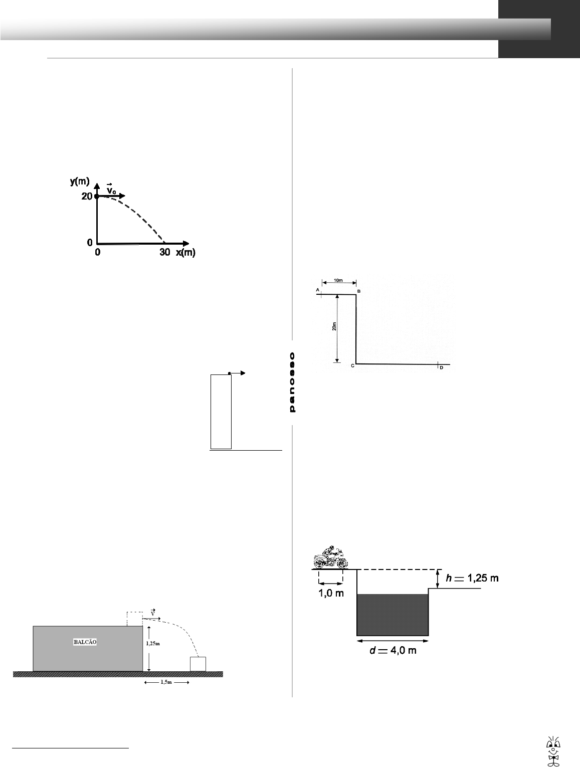 Lançamento Horizontal www.professorpanosso.com.br 1 Prof. Panosso Exercícios de Física 1) Do alto de uma ponte de 45 metros de altura é arremessado um objeto horizoltamente com velocidade de 20 m/s. Calcule o alcance horizontal desse objeto. 2) Uma bola é lançada horizontalmente com velocidade inicial v0 . Ao percorrer horizontalmente 30 m ela cai verticalmente 20 m, conforme mostrado no gráfico. Considere a aceleração da gravidade igual a 10 m/s2 e despreze a resistência do ar. É CORRETO afirmar que o módulo da velocidade de lançamento v0 é: a) 15 m/s b) 30 m/s c) 7,5 m/s d) 60 m/s 3) Do alto de um edifício, lança-se horizontalmente uma pequena esfera de chumbo com velocidade de 8 m/s. Essa esfera toca o solo horizontal a uma distância de 24 m da base do prédio, em relação à vertical que passa pelo ponto de lançamento. Desprezando a resistência do ar, a altura desse prédio é: Adote: g = 10 m/s2 a) 45 m b) 40 m c) 35 m d) 30 m e) 20 m 4) Um projétil é disparado horizontalmente do alto de um prédio de 80 m de altura, com velocidade inicial de 50 m/s, conforme a figura abaixo. Considerando-se g = 10 m/s2, e desprezando-se o atrito com o ar, o objeto atinge o solo num ponto distante do prédio em aproximadamente: a) 100 m b) 200 m c) 300 m d) 400 m e) 500 m 5) Com relação a questão anterior, calcule a velocidade que o projétil vai ter imediatamente antes de atingir o solo. 6) De um avião que voa horizontalmente a 80m/s, na altitude de 500m, desprende-se um parafuso. Adotando-se g = 10m/s2 e desprezando-se a resistência do ar, a componente horizontal do deslocamento do parafuso, desde o desprendimento até tocar o solo, é, em metros, a) zero b) 200 c) 400 d) 600 e) 800 7) Em uma revendedora de peças de automóveis, um vendedor lança uma pequena caixa sobre o balcão para ser recolhida por seu ajudante. Este, distraído, não vê o pacote que escorrega para fora do balcão e atinge o chão a 1,5m da base do balcão. Se a altura do balcão é de 1,25 m, a velocidade com que o pacote deixou o balcão vale em m/s a) 2 b) 1 c) 3 d) 4 e) 6 8) Uma bola rolou para fora de uma mesa de 80cm de altura e avançou horizontalmente, desde o instante em que abandonou a mesa até o instante em que atingiu o chão a 80cm do pé da mesa. Considerando g = 10m/s2, a velocidade da bola, ao abandonar a mesa, era de a) 8,0m/s b) 5,0m/s c) 4,0m/s d) 2,0m/s e) 1,0m/s 9) Um projétil é lançado horizontalmente de uma altura de 20 m, com uma velocidade inicial de módulo igual a 15 m/s. Desprezando-se a resistência do ar e considerando o módulo da aceleração gravitacional como 10 m/s2, é CORRETO afirmar que o projétil atingirá o solo após ter percorrido uma distância horizontal igual a: a) 11 m b) 15 m c) 60 m d) 23 m e) 30 m 10) Uma partícula desloca-se em movimento retilíneo uniforme sobre uma plataforma horizontal lisa do ponto A ao ponto B, com velocidade v0 = 10m/s. A partir do ponto B, a partícula se movimenta sob a ação de seu peso até atingir o ponto D localizado em outra plataforma horizontal, como mostra a figura abaixo. Dados: AB = 10m; BC = 20m; g = 10m/s2. a) Calcule a distância do ponto C ao ponto D. b) Calcule o tempo que a partícula gasta para se deslocar do ponto A ao ponto D. c) Determine a velocidade da partícula imediatamente antes de atingir o ponto D. 11) Duas esferas A e B, pequenas, de massas iguais e raios iguais, são lançadas de uma mesa horizontal, com velocidades horizontais de vA = 4,0 m/s e vB = 8,0 m/s , em direção a um piso horizontal. Desprezando-se a resistência do ar. a) Qual das duas esferas chegará primeiro ao solo? Explique. b) Calcule a razão entre o alcance da esfera A e da esfera B. 12) Um motociclista deseja saltar um fosso de largura d = 4,0 m, que separa duas plataformas horizontais. As plataformas estão em níveis diferentes, sendo que a primeira encontra-se a uma altura h = 1,25 m acima do nível da segunda, como mostra a figura. O motociclista salta o vão com certa velocidade u0 e alcança a plataforma inferior, tocando-a com as duas rodas da motocicleta ao mesmo tempo. Sabendo-se que a distância entre os eixos das rodas é 1,0 m e admitindo g = 10 m/s2, determine: a) o tempo gasto entre os instantes em que ele deixa a plataforma superior e atinge a inferior. Lançamento Horizontal www.professorpanosso.com.br 2 Prof. Panosso Exercícios de Física b) qual é a menor velocidade com que o motociclista deve deixar a plataforma superior, para que não caia no fosso. 13) Em uma cena de filme, um policial em perseguição a um bandido salta com uma moto do topo de um prédio a outro. Considere que ambos os prédios têm o topo quadrado com uma área de 900 m2 e que o policial motorizado se lança horizontalmente com uma velocidade de 72 km/h. Considere ainda que a distância entre os prédios é de 20 m e que o topo do segundo prédio está 10 m abaixo do topo do primeiro. Calcule a distância que o policial vai atingir em relação a borda do edifício mais baixo. Considere a aceleração gravitacional igual a 10 m/s2. Despreze a resistência do ar. 14) Uma pedra pe arremessada horizontalmente, com uma velocidade de 20m/s, de uma ponte que está a 16m acima da superfície da água. Qual é aproximadamente a velocidade da pedra, imediatamente antes de atingir a água? Use g = 10m/s2. 15) Um jogador de tênis quer sacar a bola de tal forma que ela caia na parte adversária da quadra, a 6 metros da rede. Qual o inteiro mais próximo que representa a menor velocidade, em m/s, para que isto aconteça? Considere que a bola é lançada horizontalmente do início da quadra, a 2,5m do chão, e que o comprimento total da quadra é 28m, sendo dividida ao meio por uma rede. Despreze a resistência do ar e as dimensões da bola. A altura da rede é 1m. 16) Um alvo de altura 1,0m encontra a certa distância x do ponto de disparo de uma arma. A arma é, então, mirada no centro do alvo e o projétil sai com velocidade horizonta